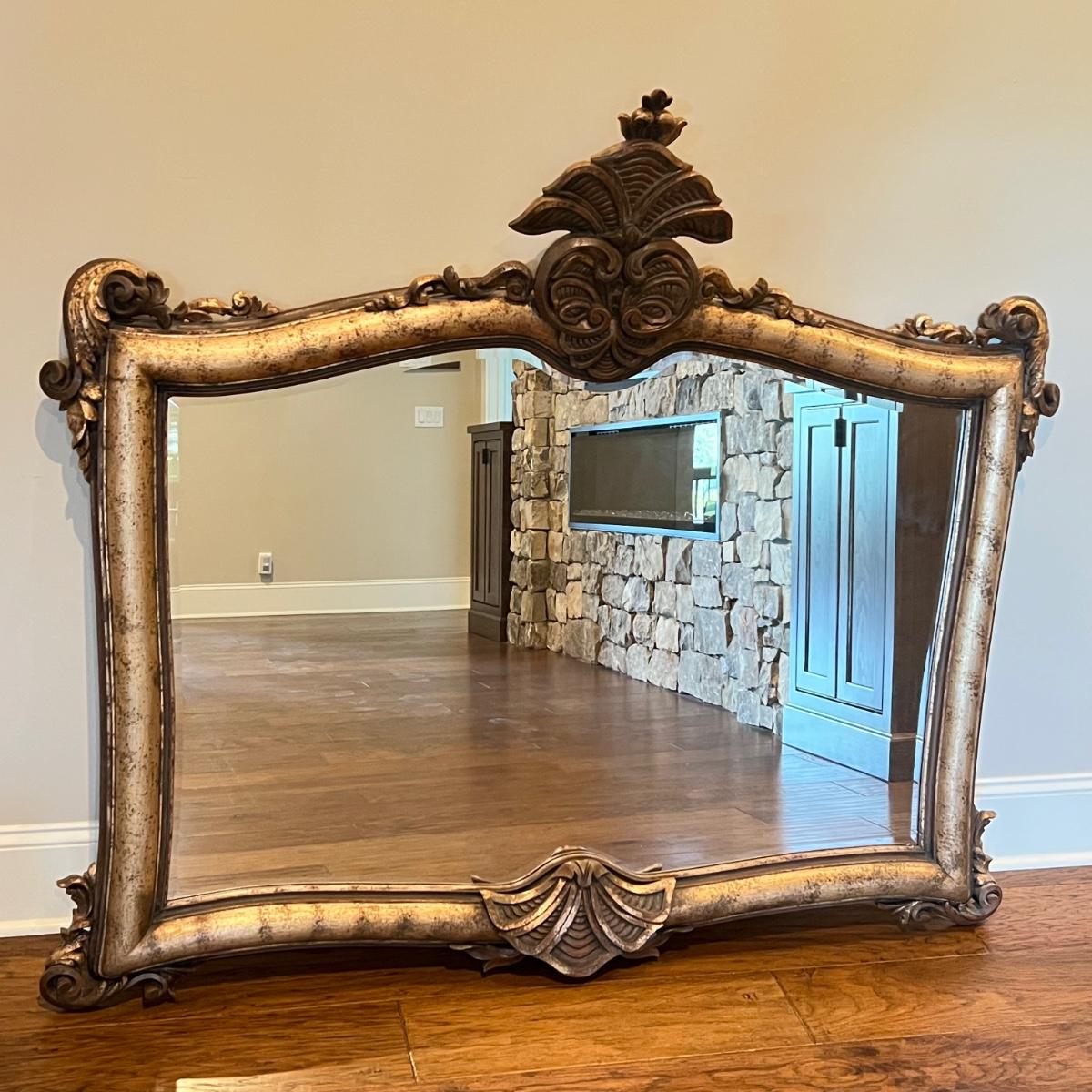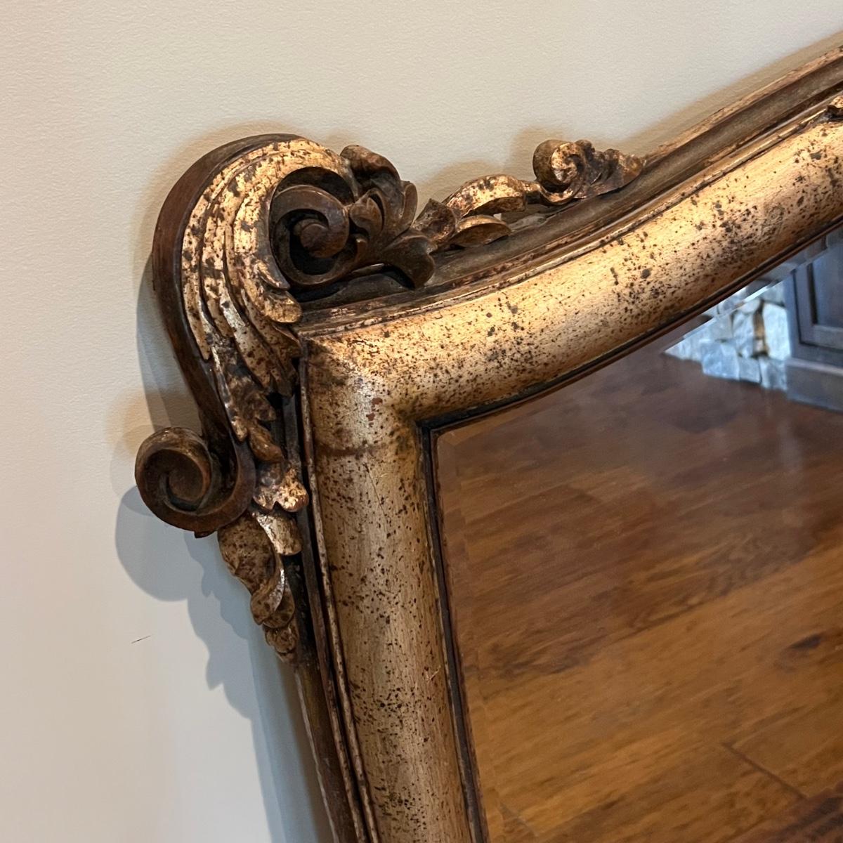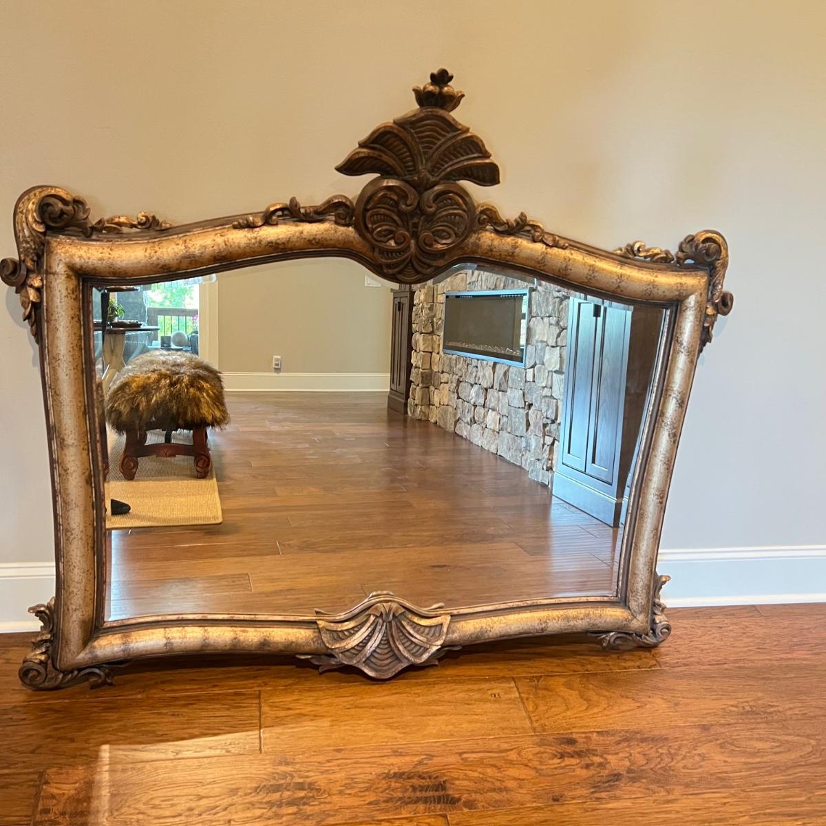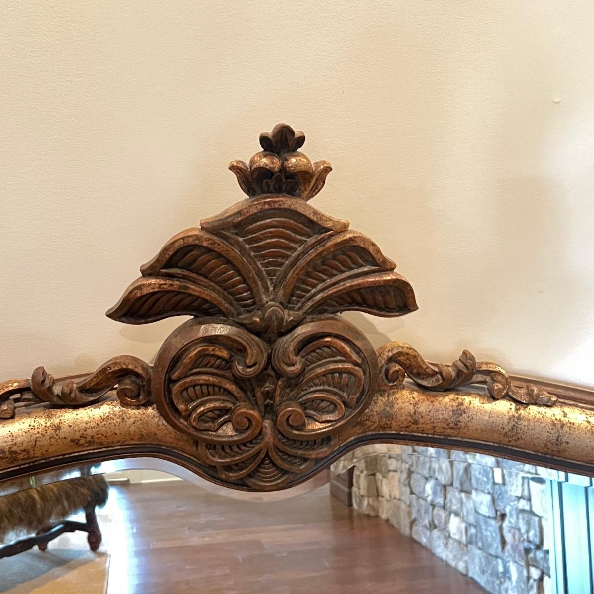 This large La Barge mantel mirror has beveled glass with a composite frame. This ornate frame has an acanthus leaf and shell motif with a warm French Country finish which is a distressed metallic gold color.