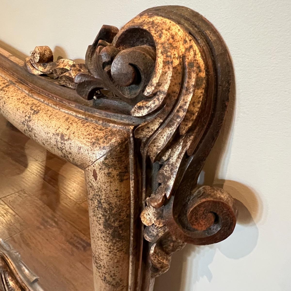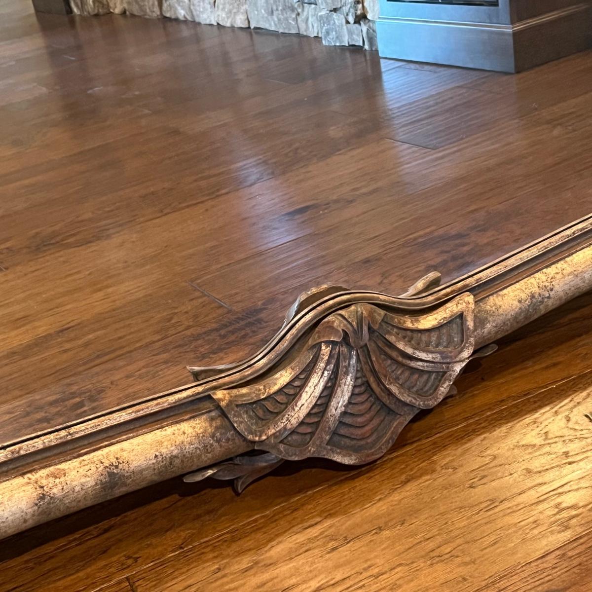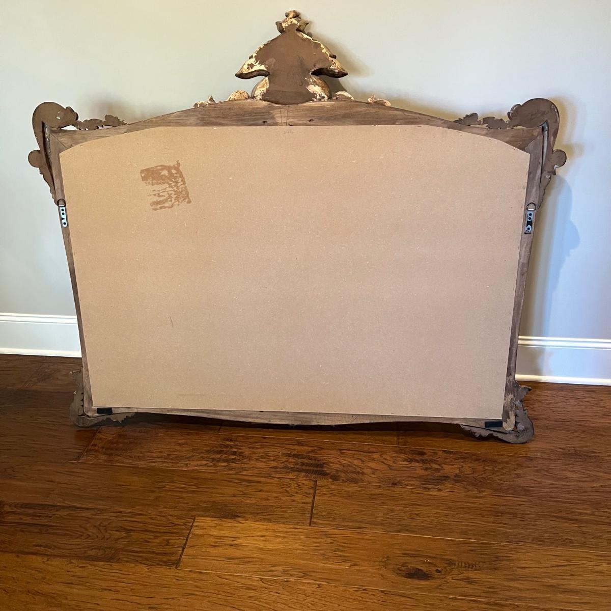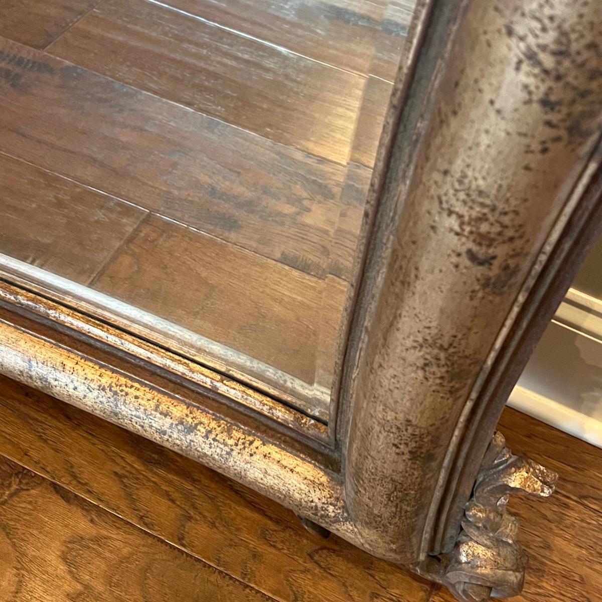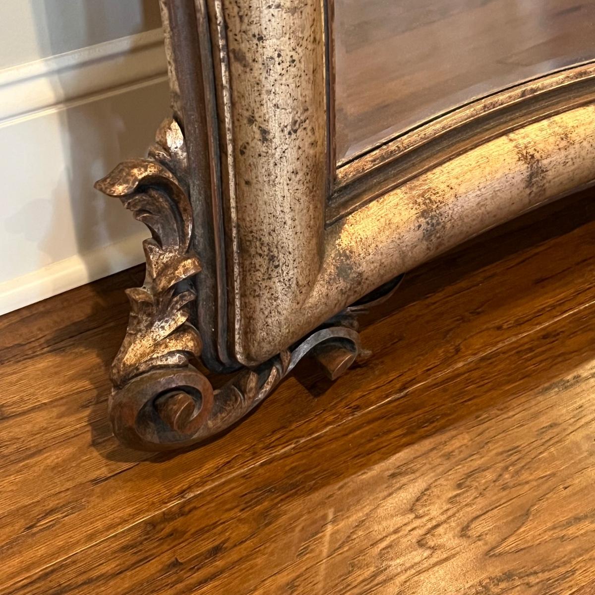 This large La Barge mantel mirror has beveled glass with a composite frame. This ornate frame has an acanthus leaf and shell motif with a warm French Country finish which is a distressed metallic gold color.