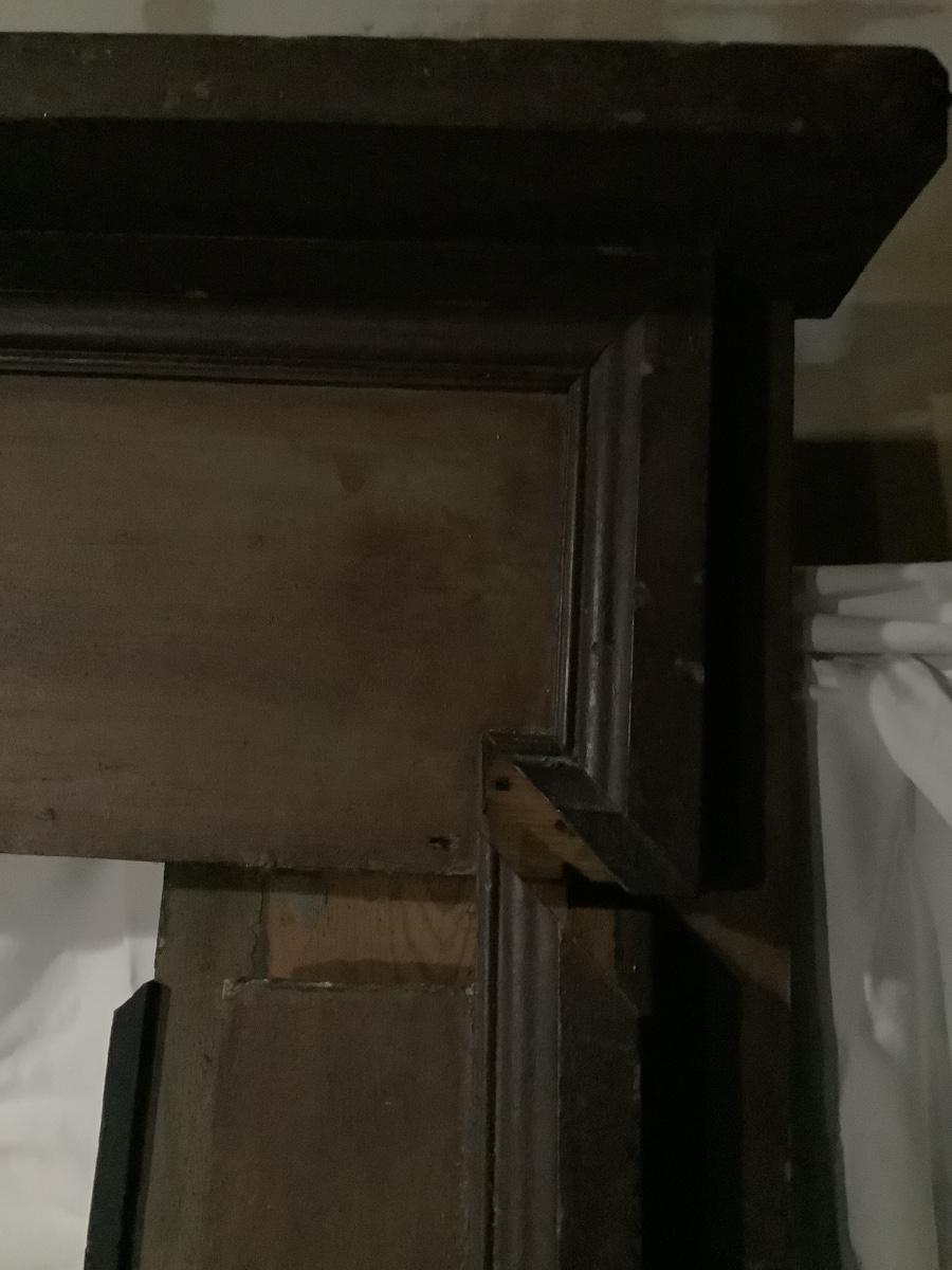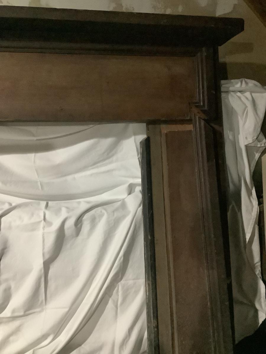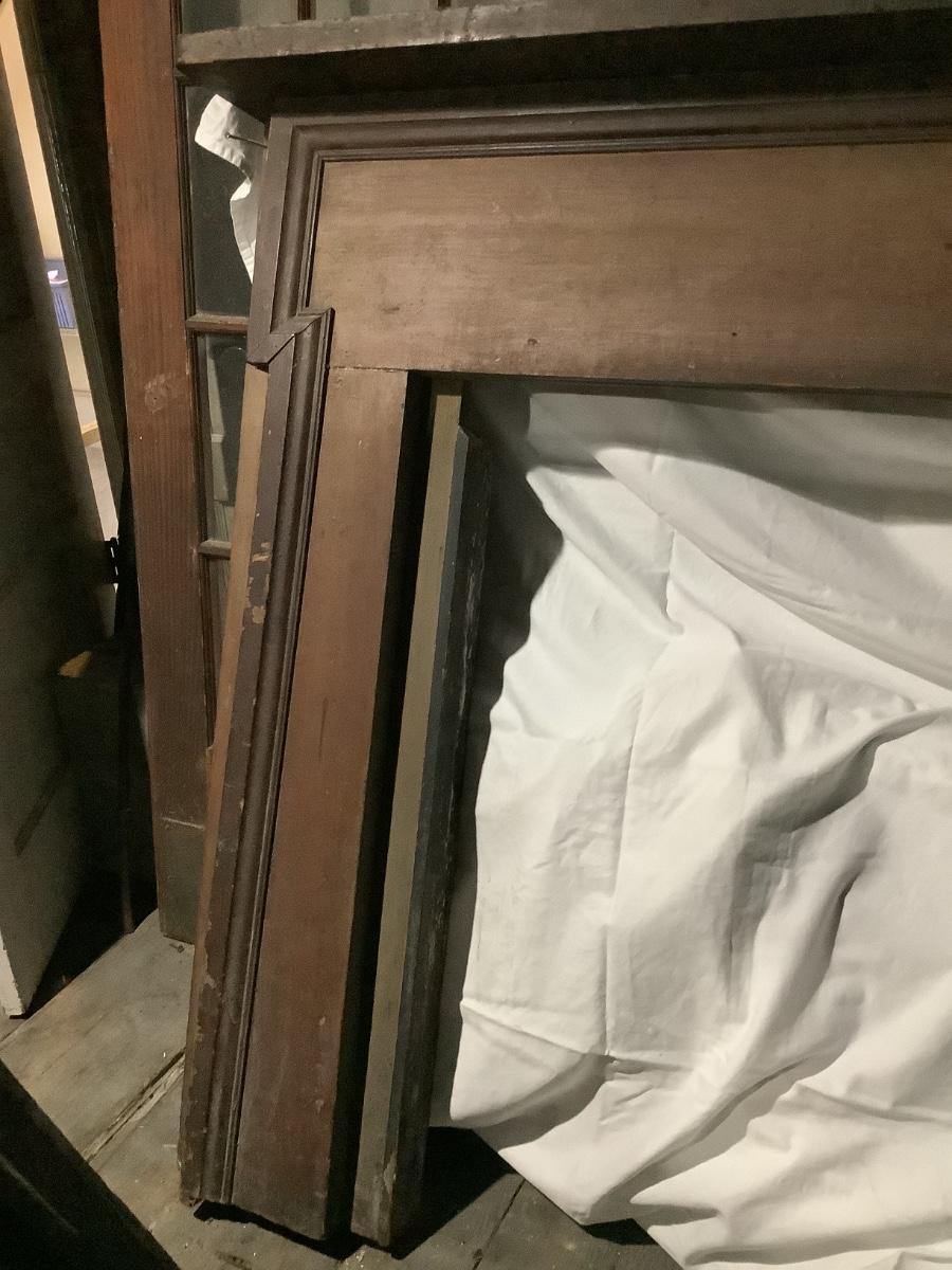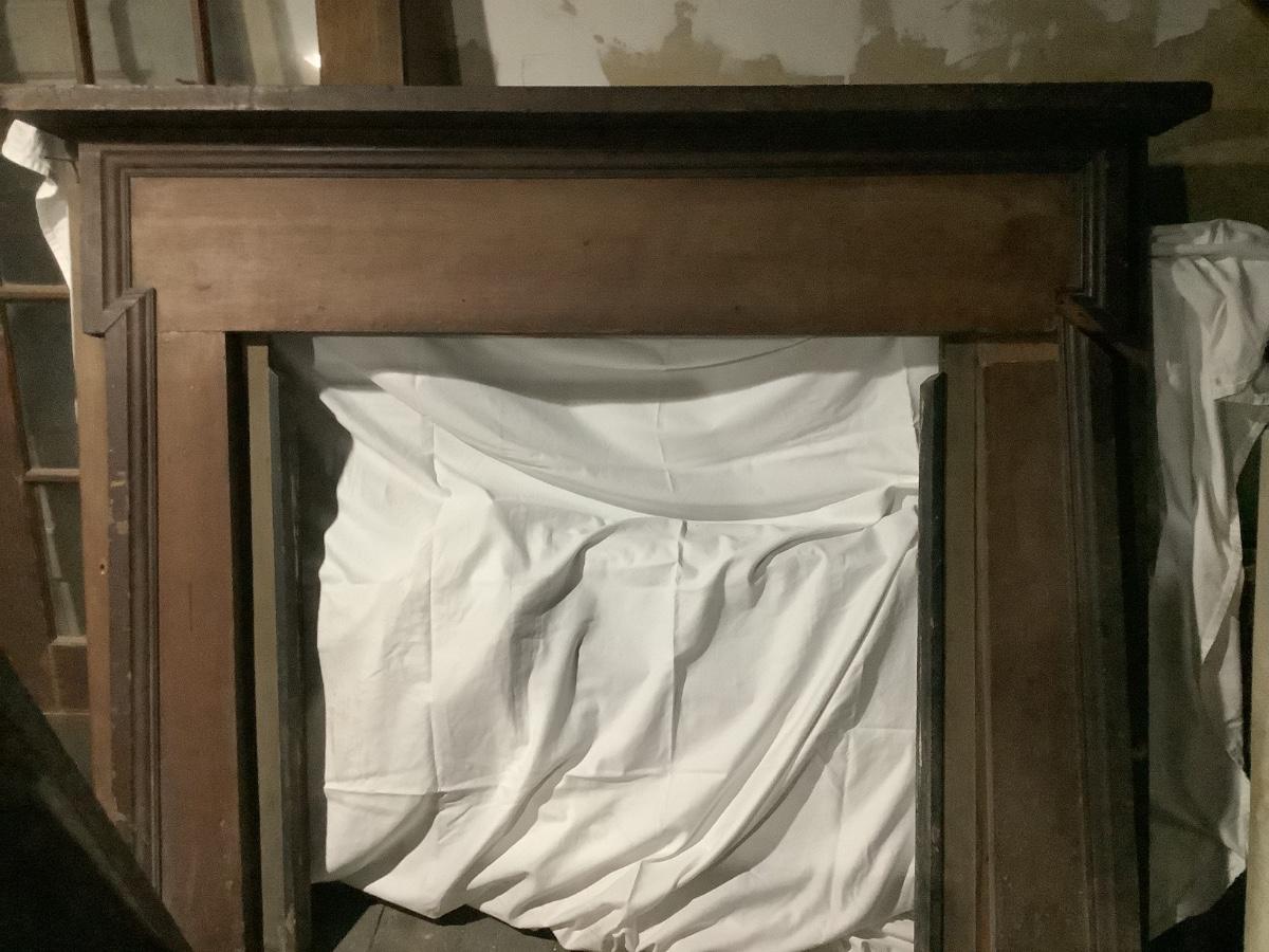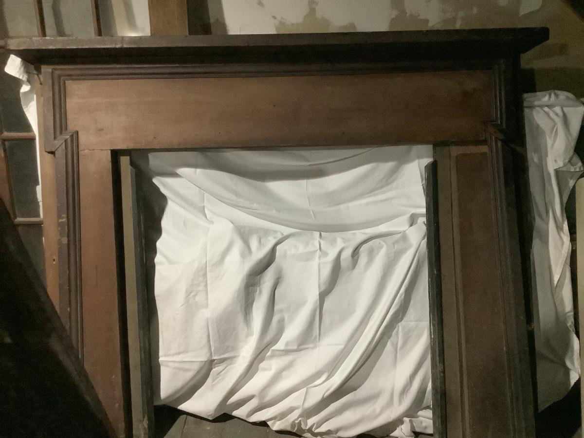 Mantel surround with 2 tones of brown -right side is pulled up but easily put back