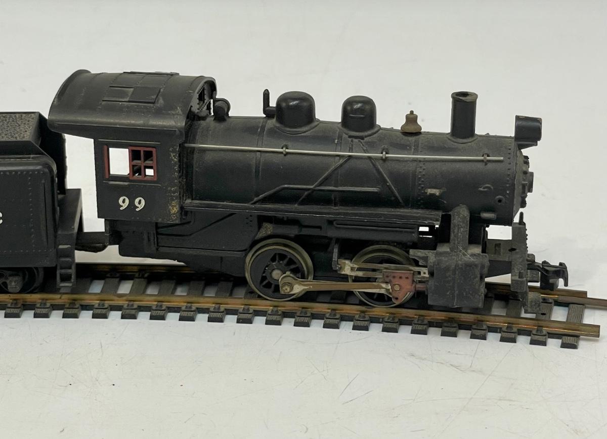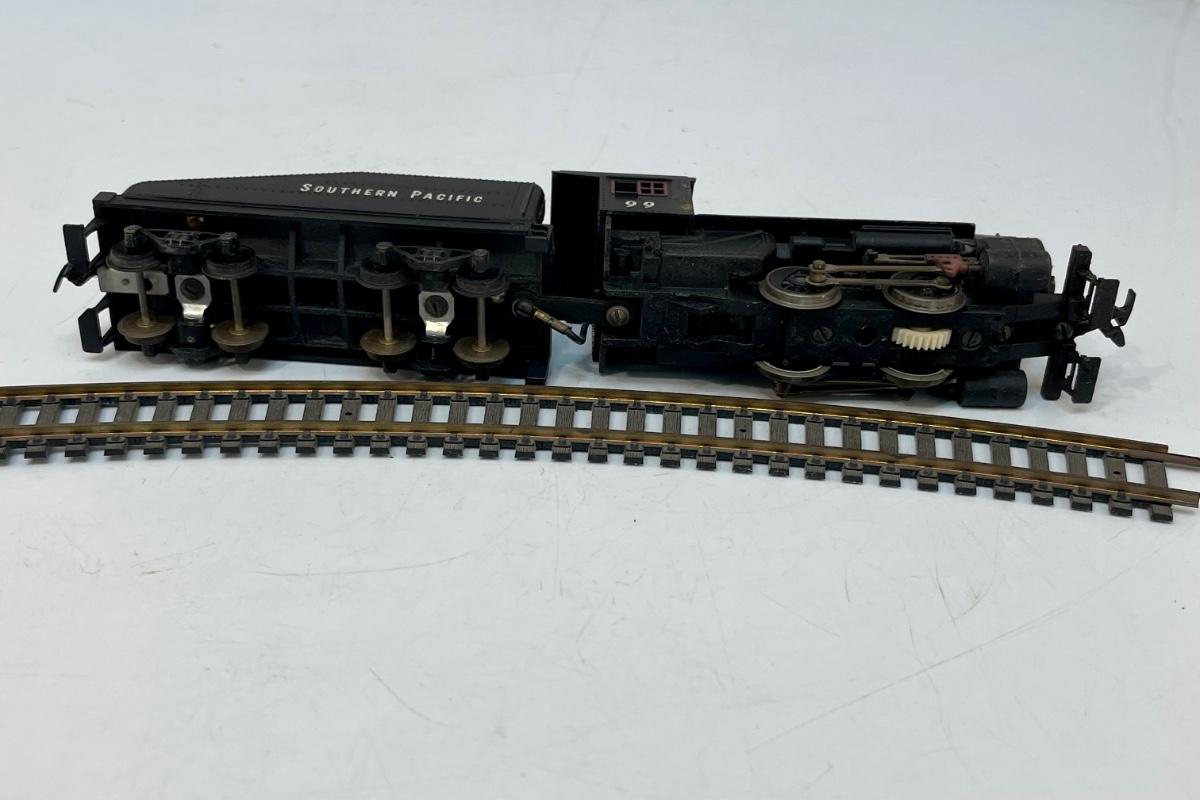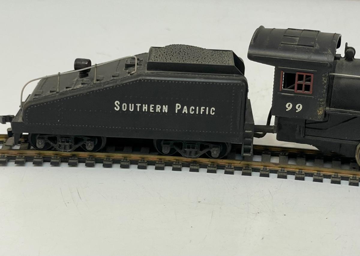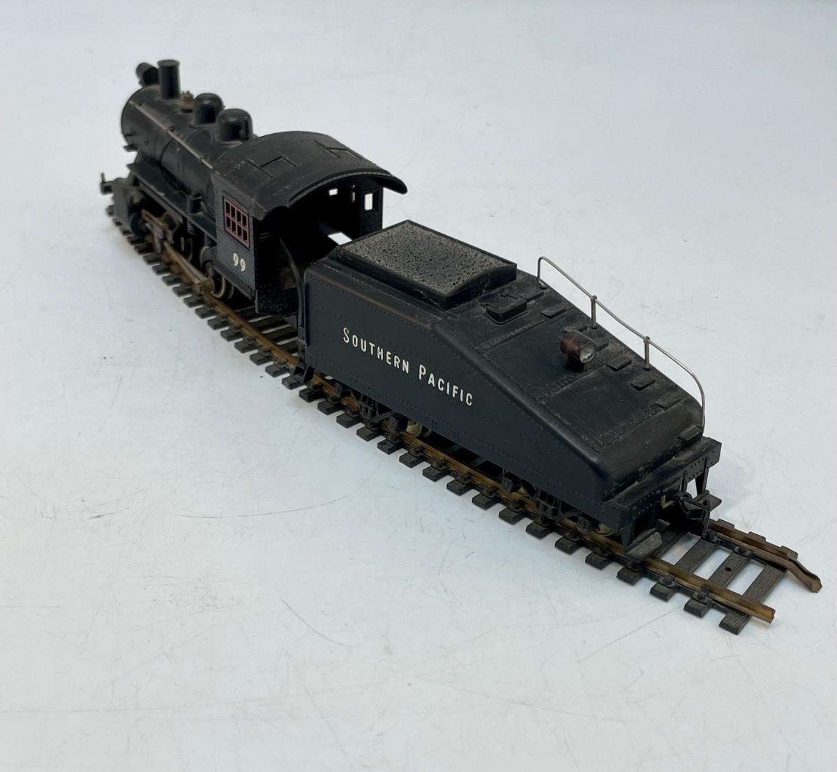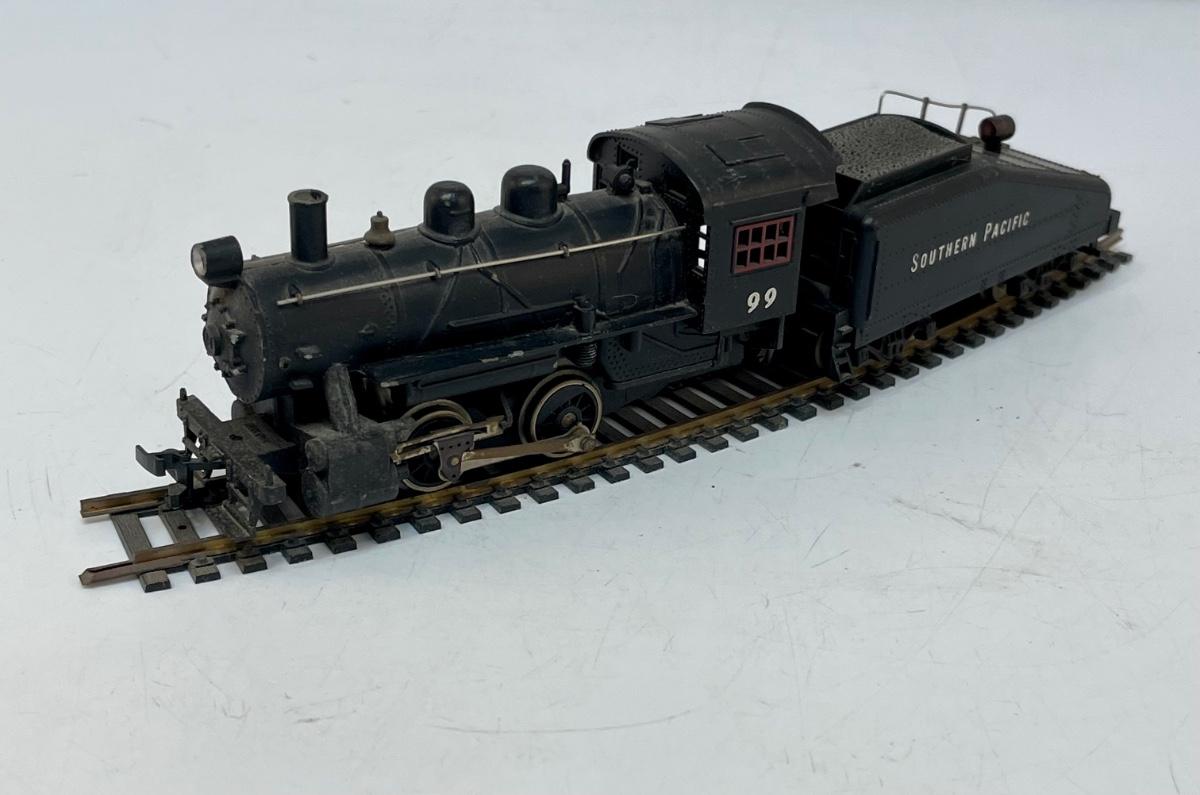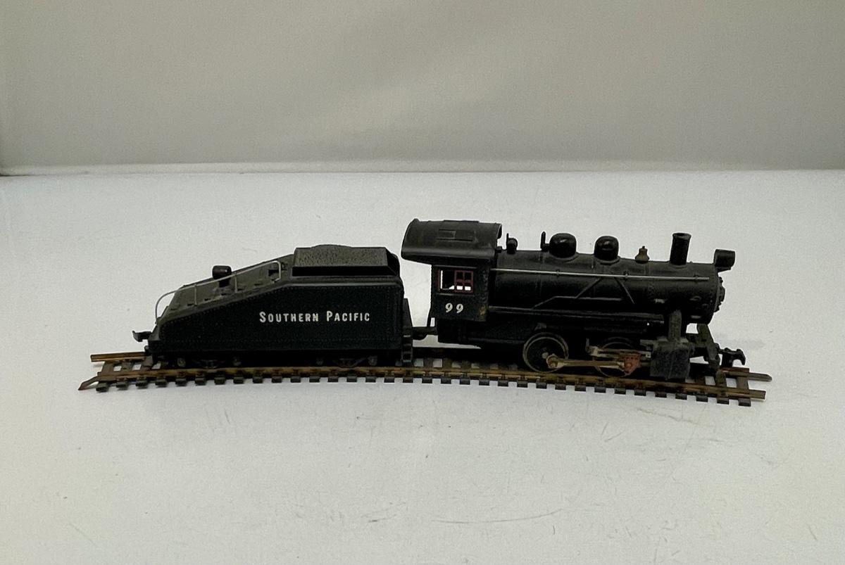 Mantua HO Train Locomotive and Tender. Steam locomotive, 2-4-0, #99 with Southern Pacific livery. Untested. Minor damage to cab roof, see photos. Made by Mantua, later become TYCO.