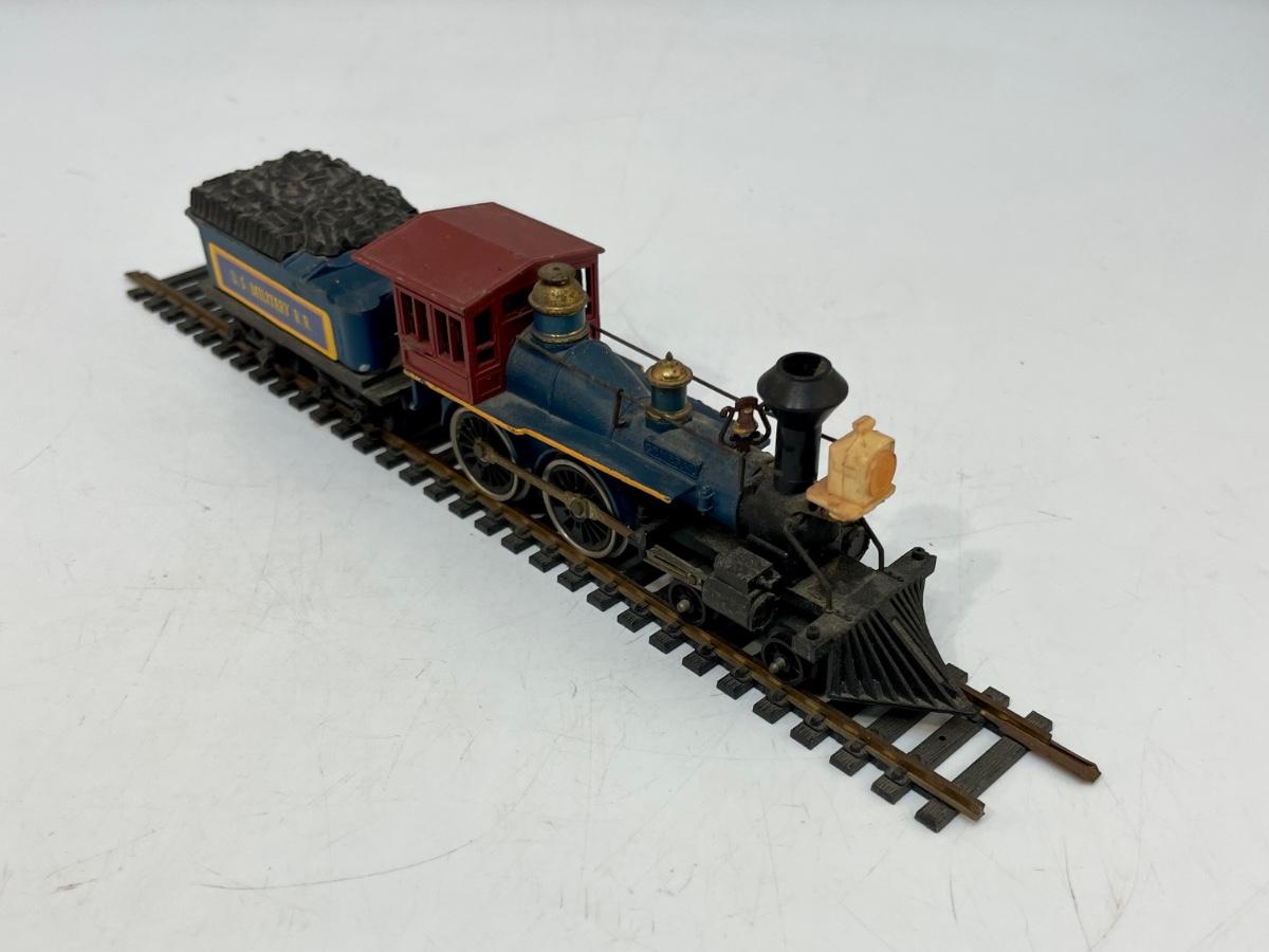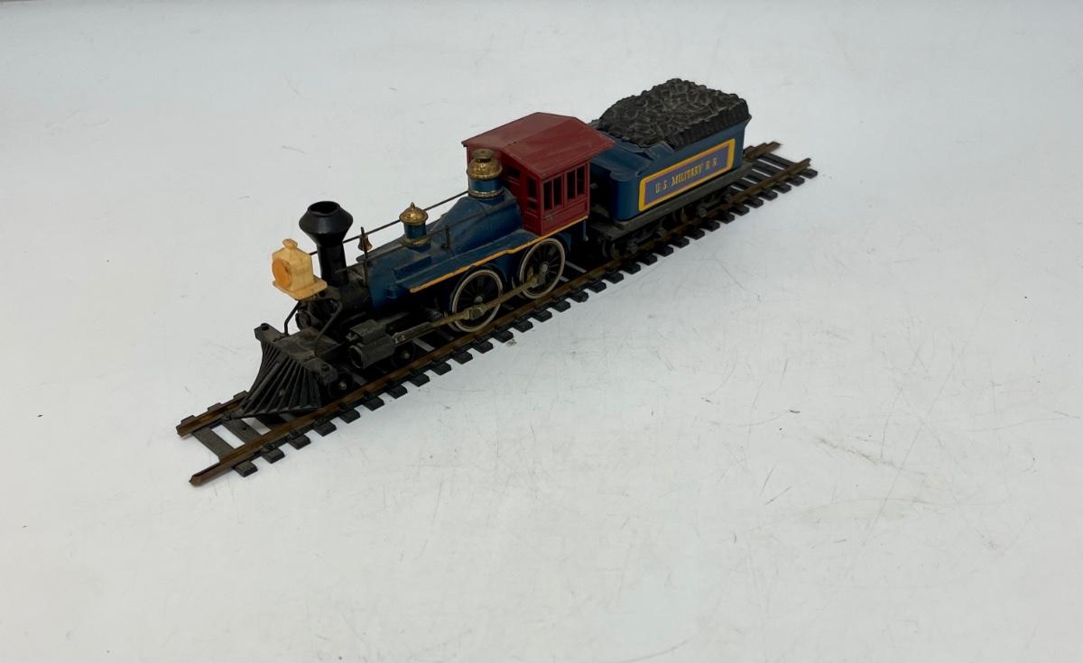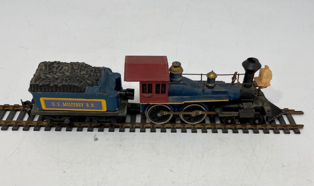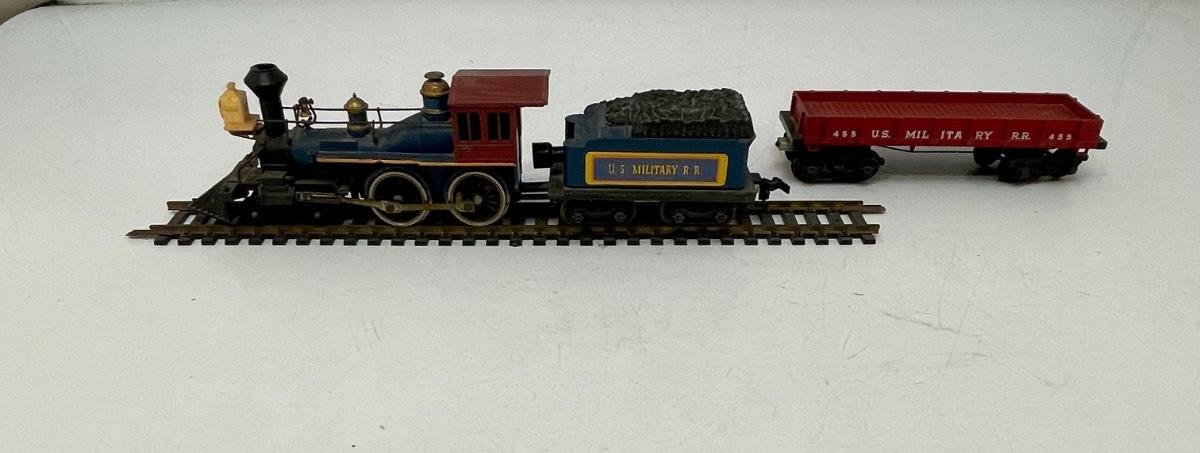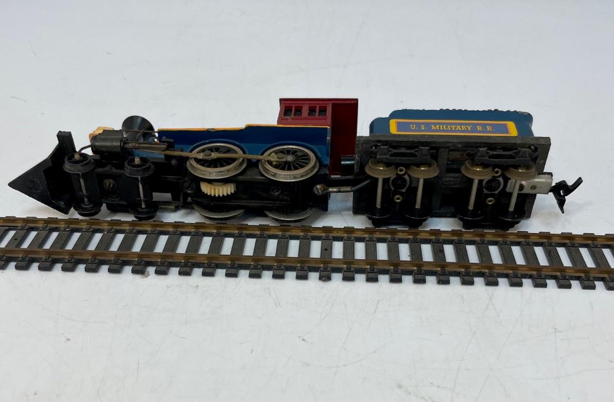 Mantua HO Train Locomotive, Tender and Flatcar. In US Military RR livery. Steam locomotive and tender are permanently connected. Untested. Flatcar couplers are broken off, and 1 wheel truck is missing the attach screw. Made by Mantua, later became TYCO.