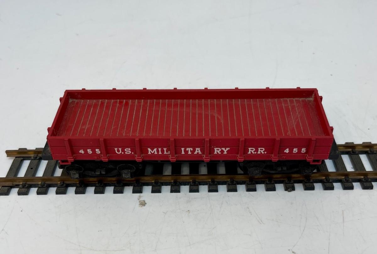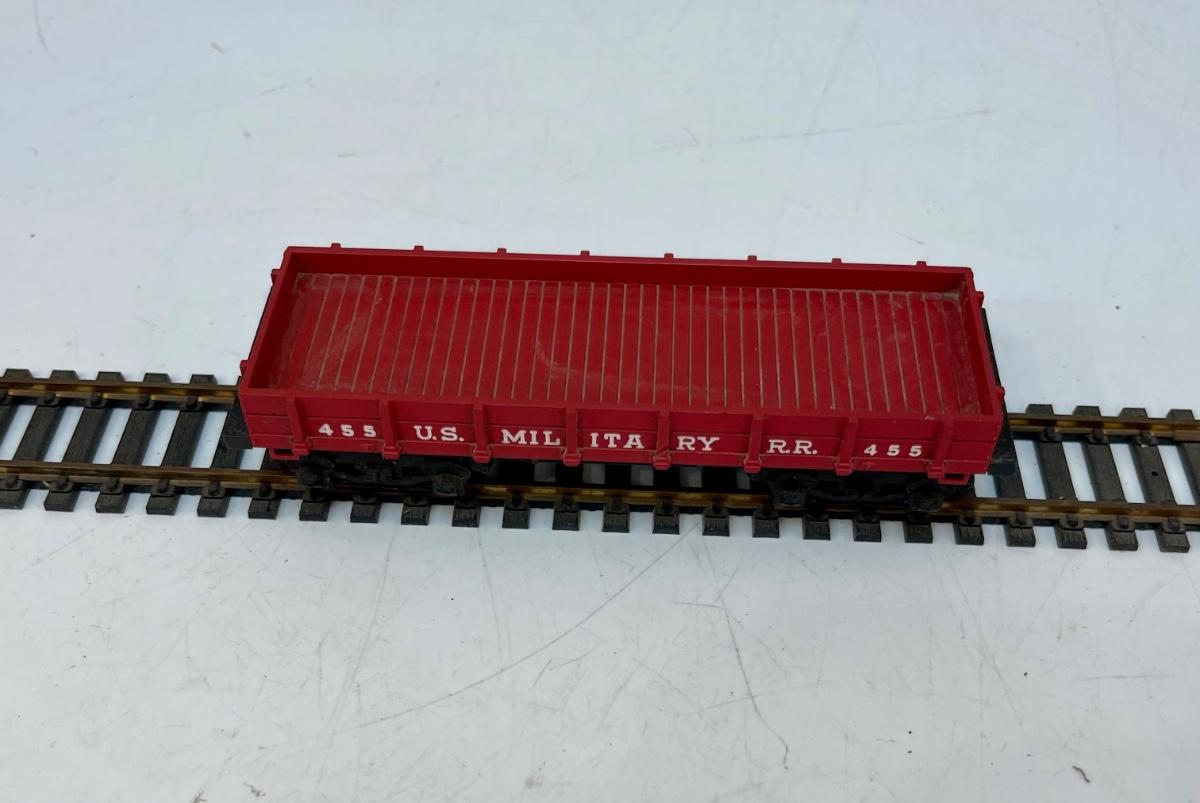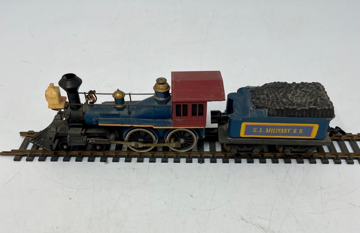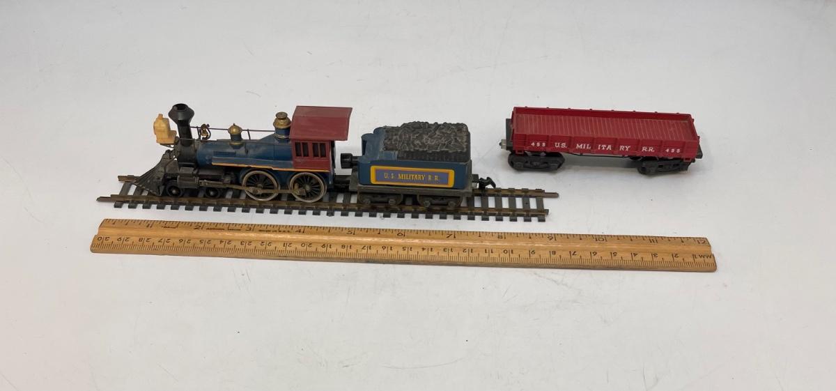 Mantua HO Train Locomotive, Tender and Flatcar. In US Military RR livery. Steam locomotive and tender are permanently connected. Untested. Flatcar couplers are broken off, and 1 wheel truck is missing the attach screw. Made by Mantua, later became TYCO.