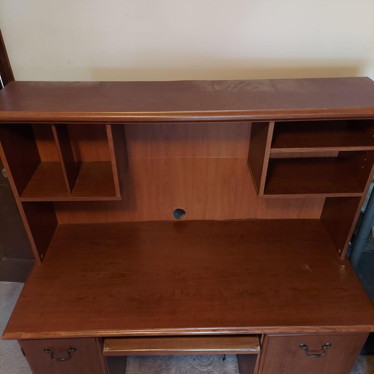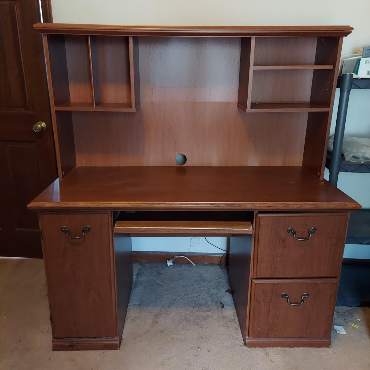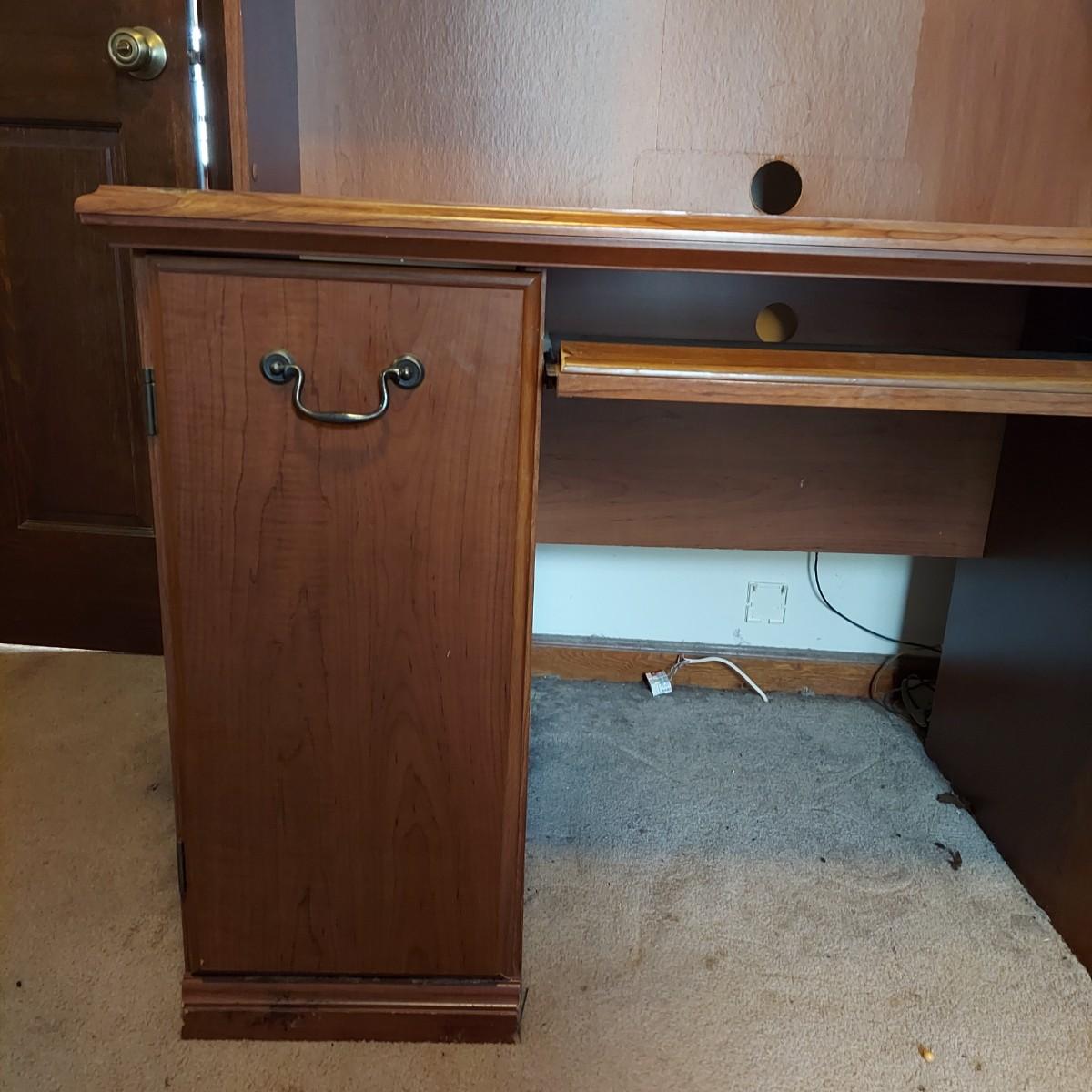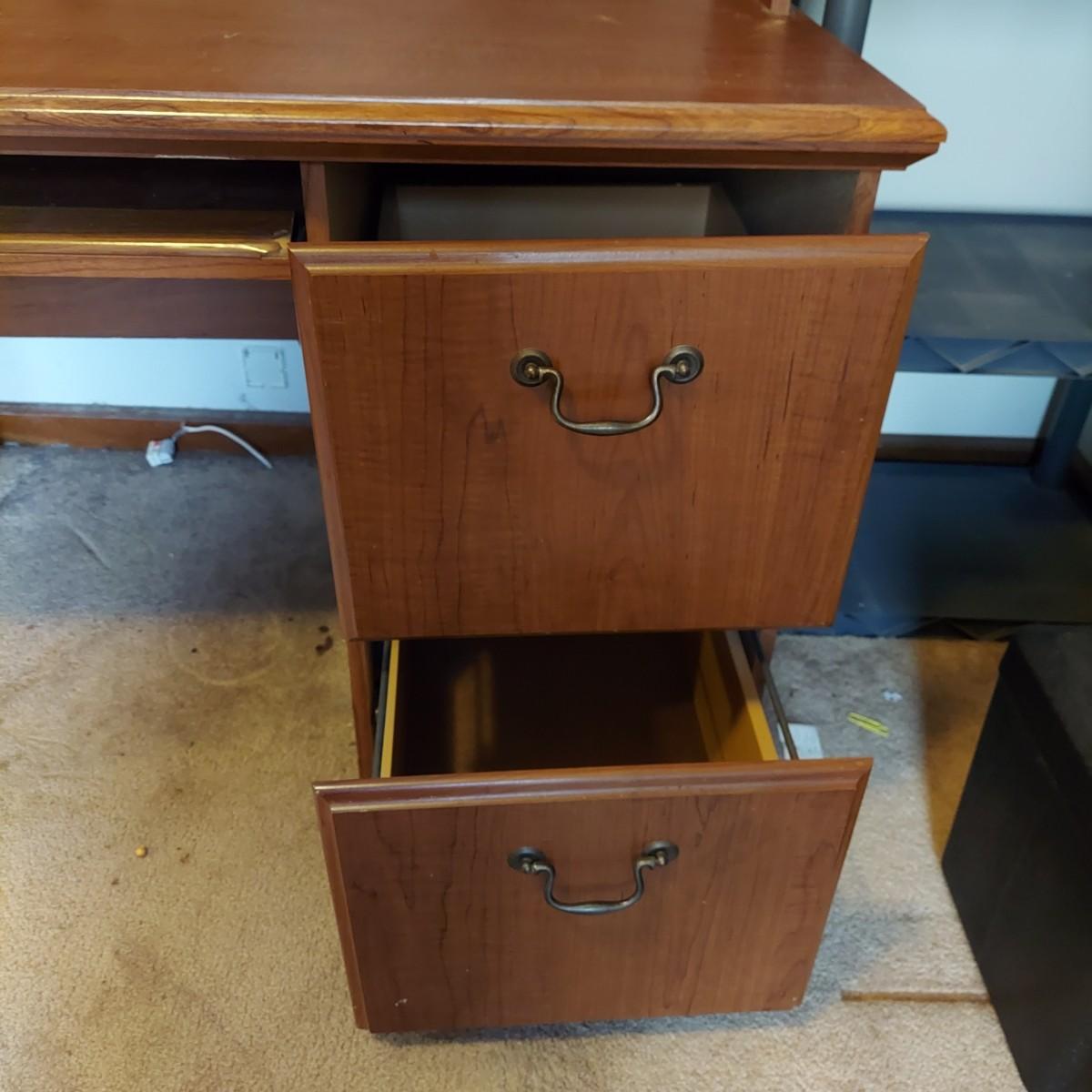 Manufactured wood desk. Measures approximately 54" x 24" x 57"H. Local Pickup Only. Winning bidder must bring assistance to help move and load this item due to its weight and/or size.