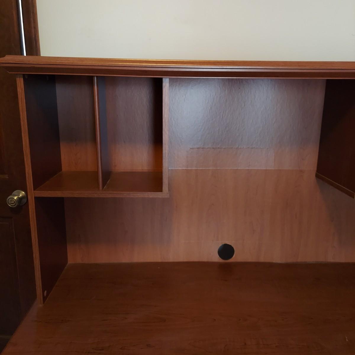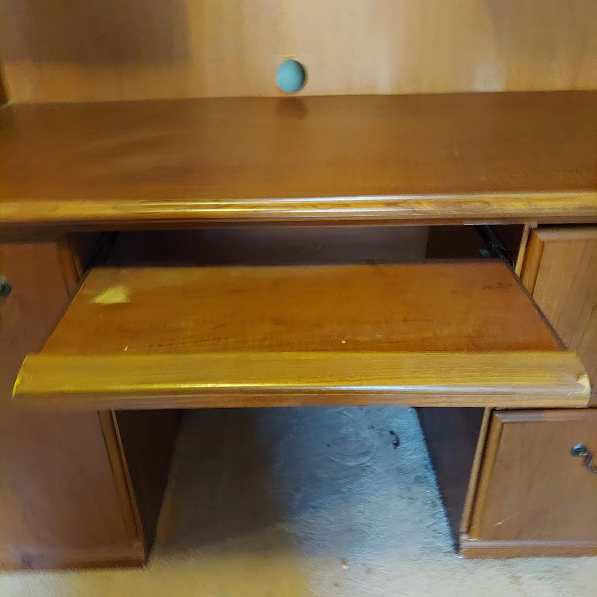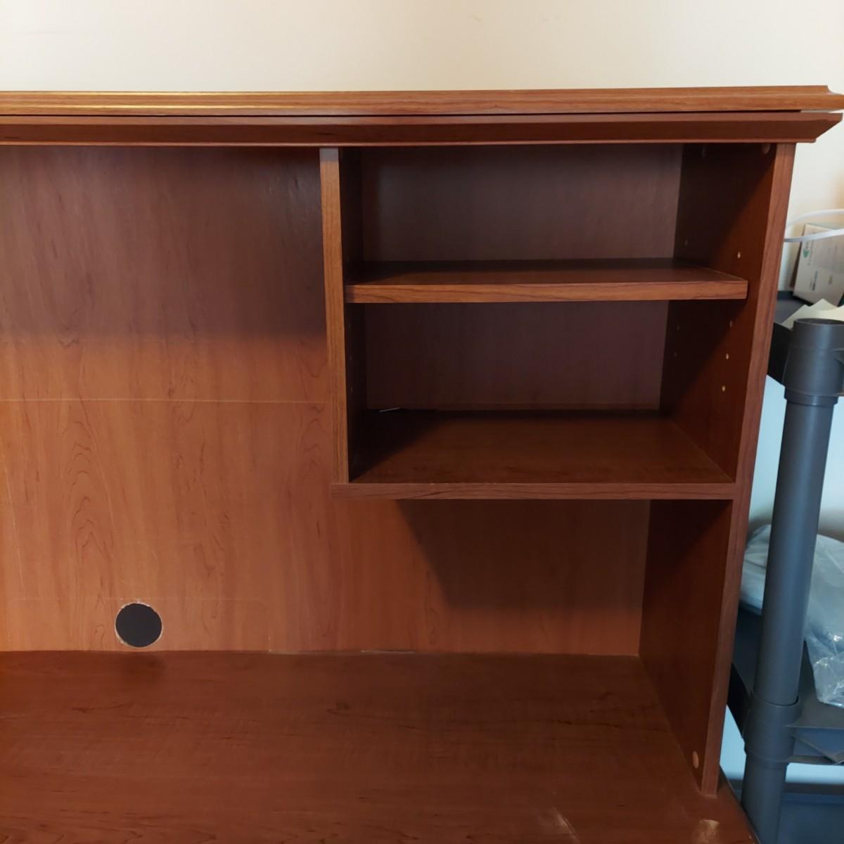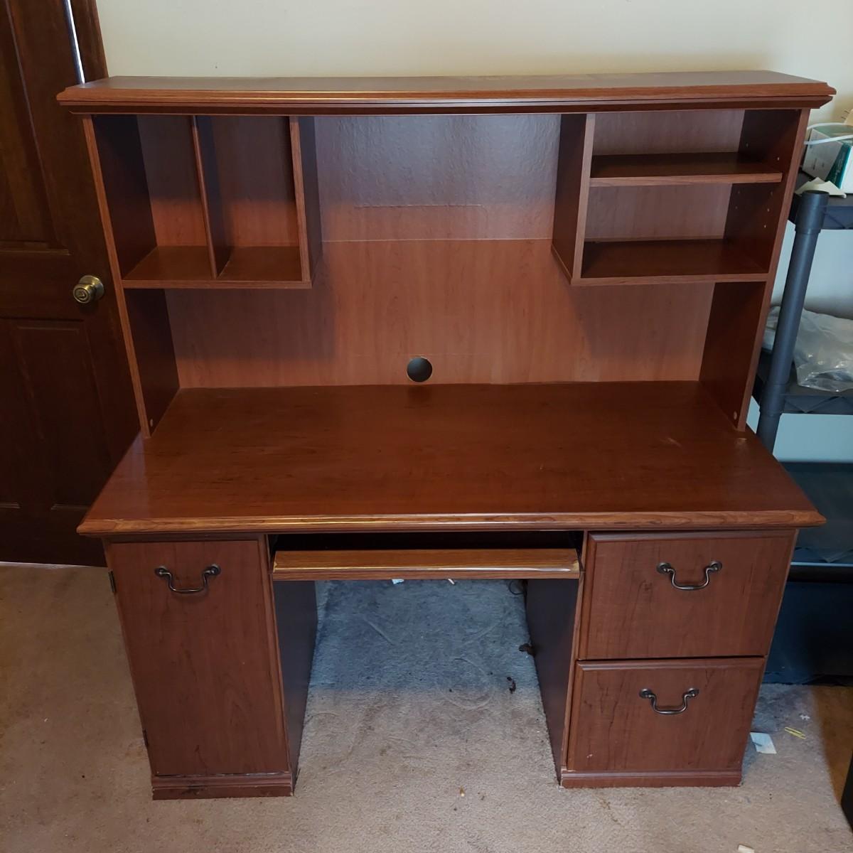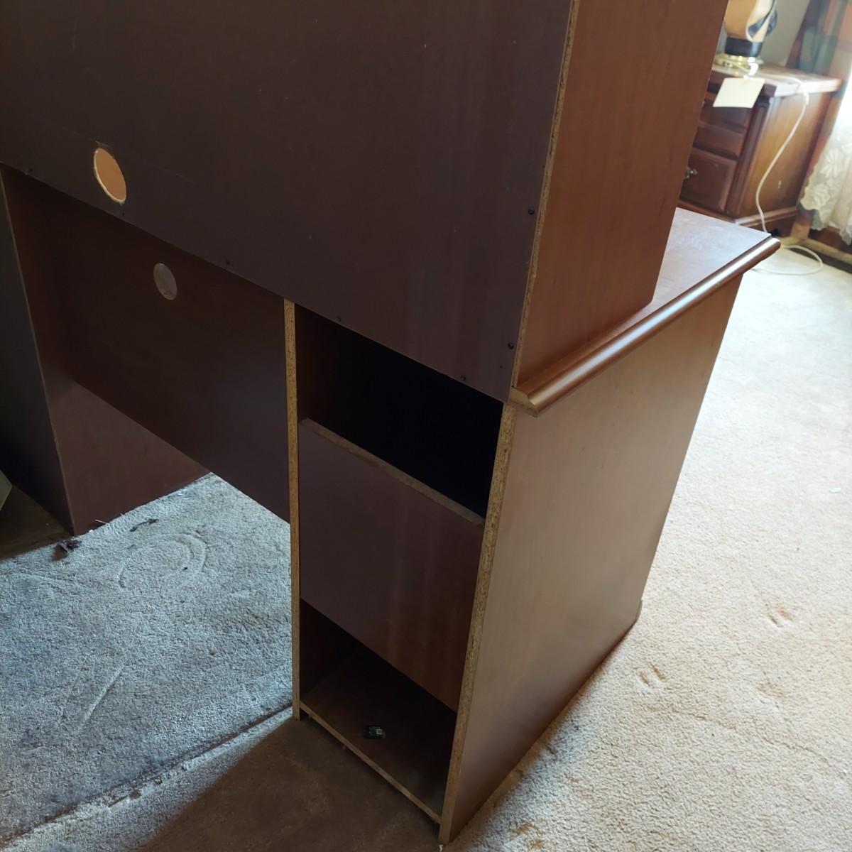 Manufactured wood desk. Measures approximately 54" x 24" x 57"H. Local Pickup Only. Winning bidder must bring assistance to help move and load this item due to its weight and/or size.