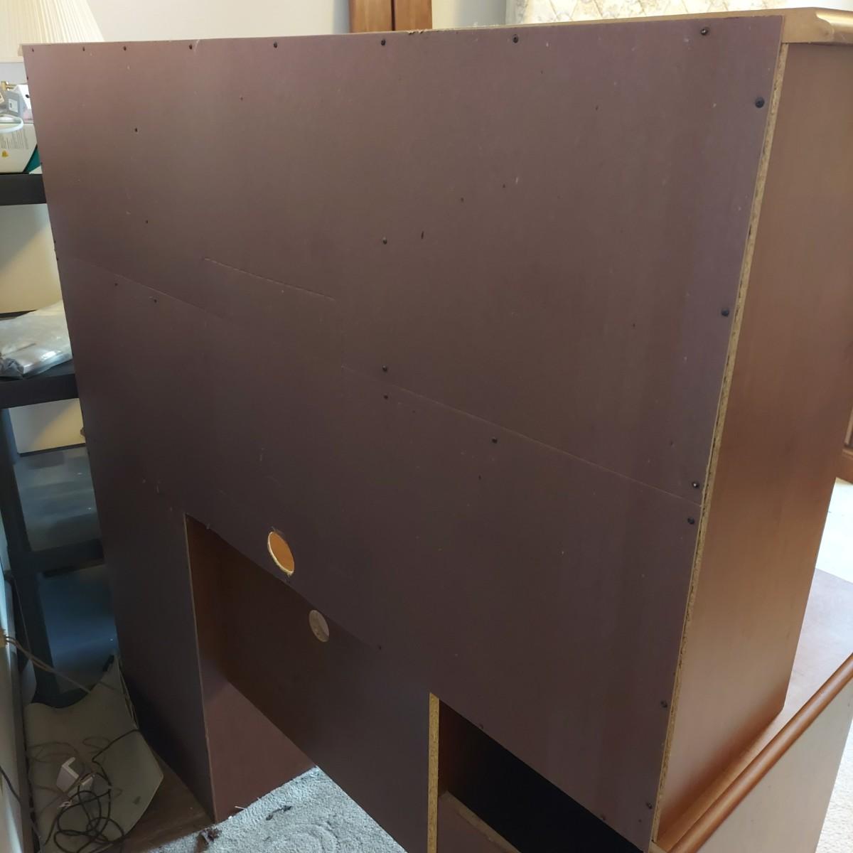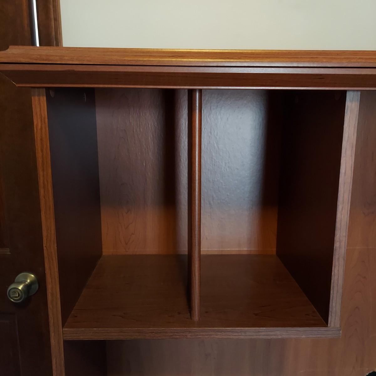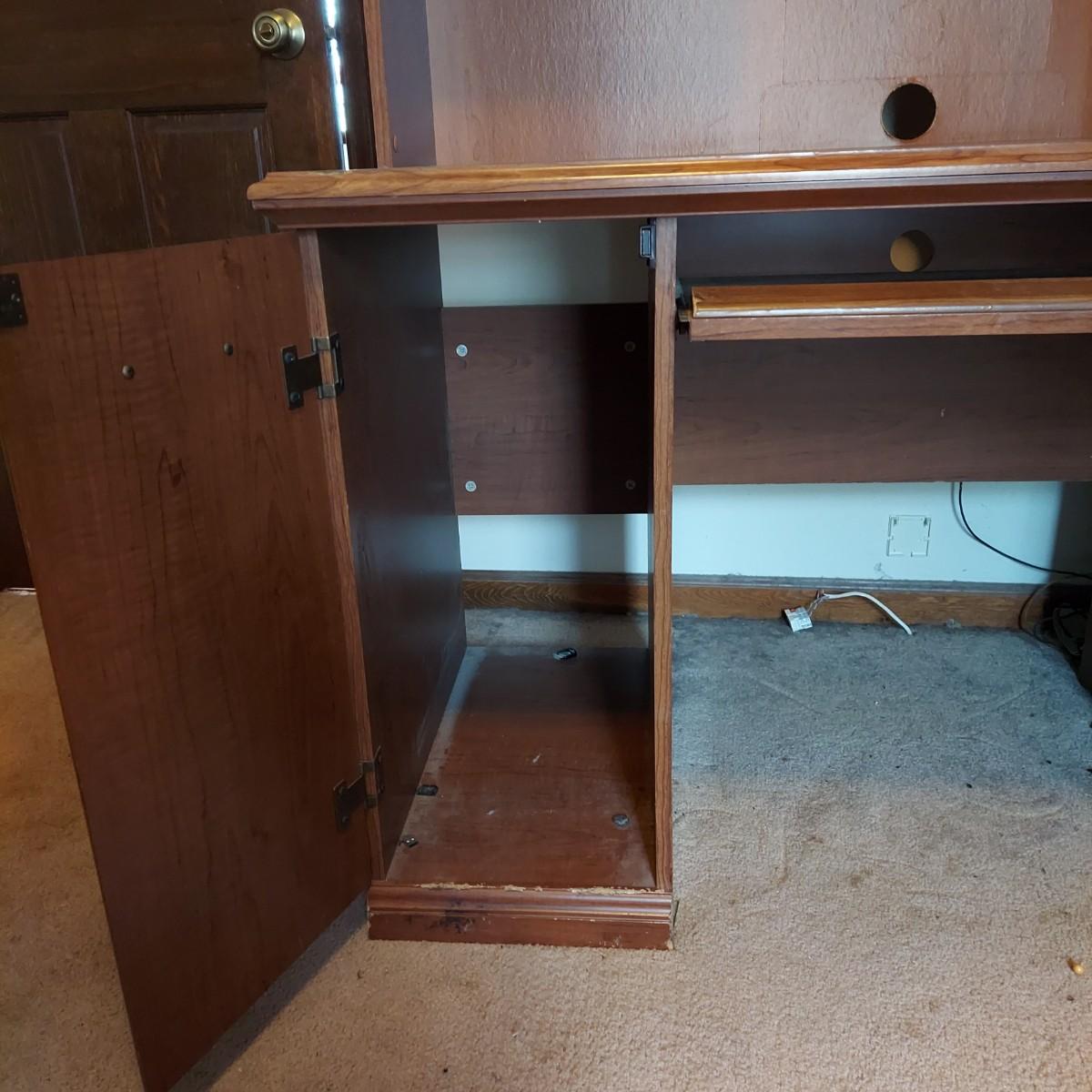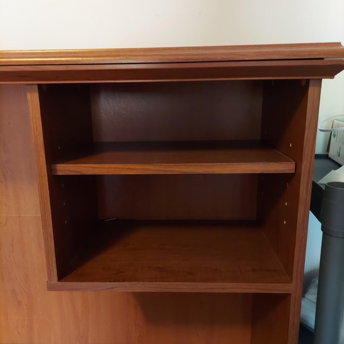 Manufactured wood desk. Measures approximately 54" x 24" x 57"H. Local Pickup Only. Winning bidder must bring assistance to help move and load this item due to its weight and/or size.