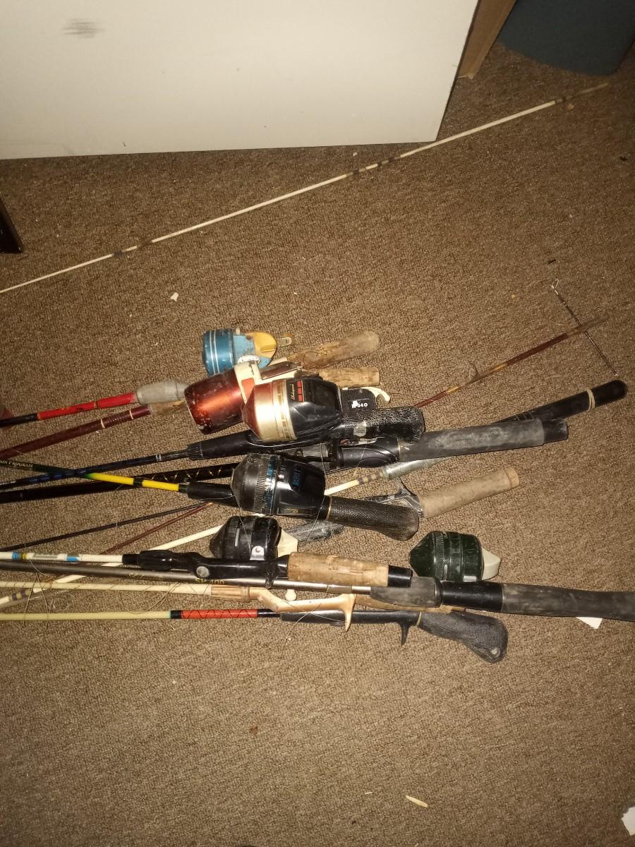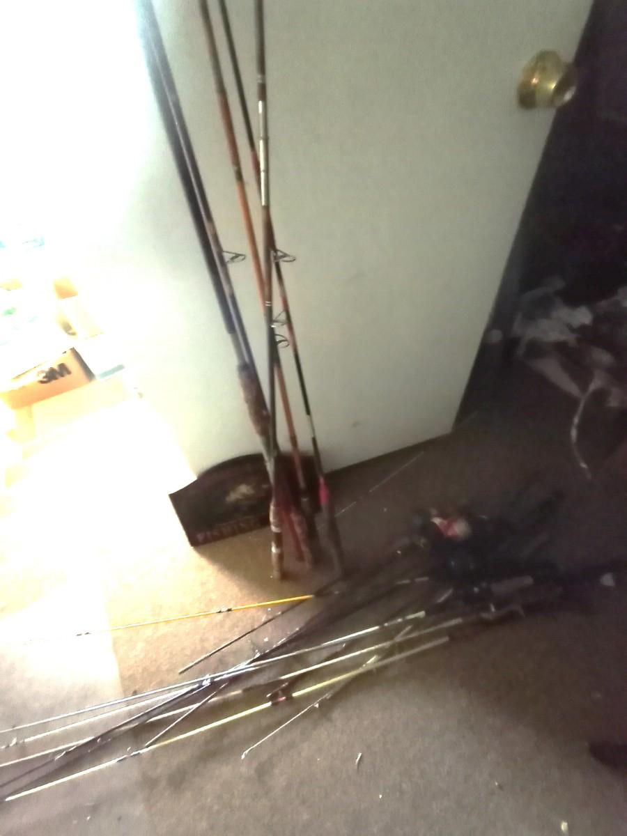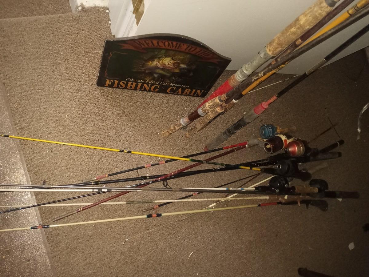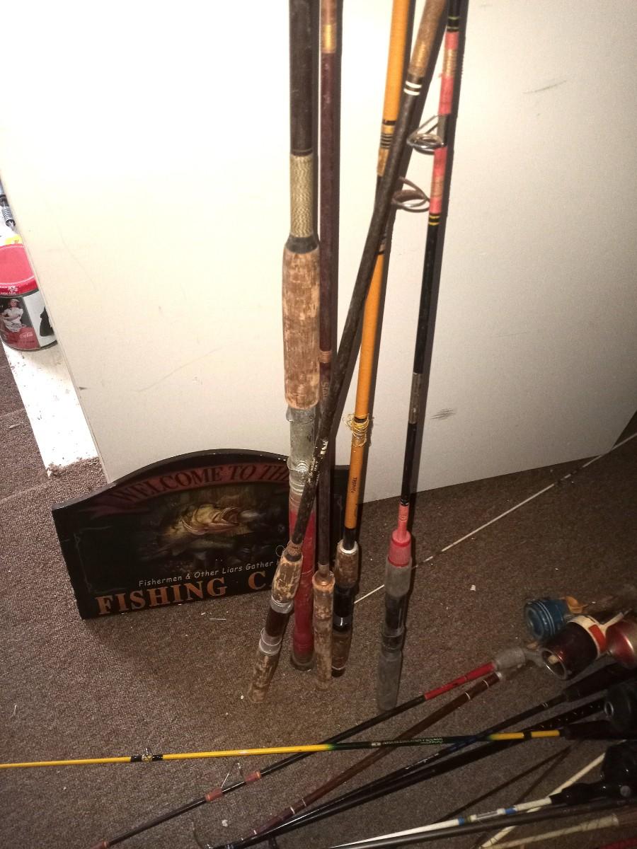 MANY BAMBOO FLY RODS AND FISHING POLES, WOODEN FISHING SIGN