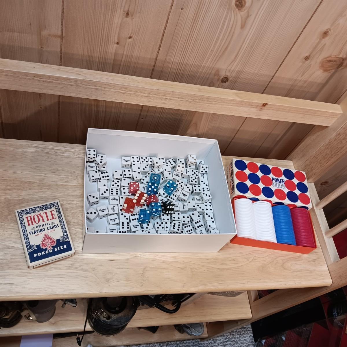 MANY CASINO DICE, POKER CHIPS AND A DECK OF CARDS