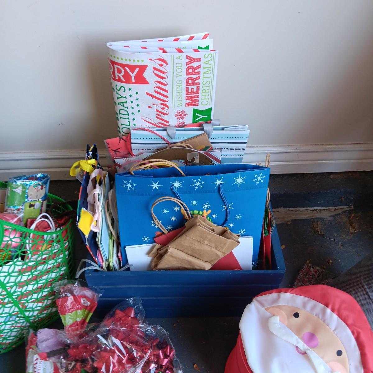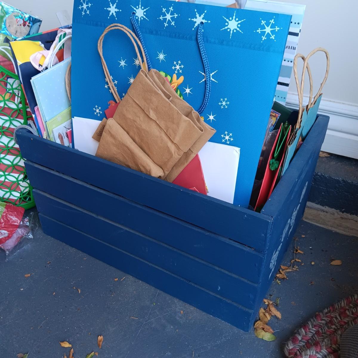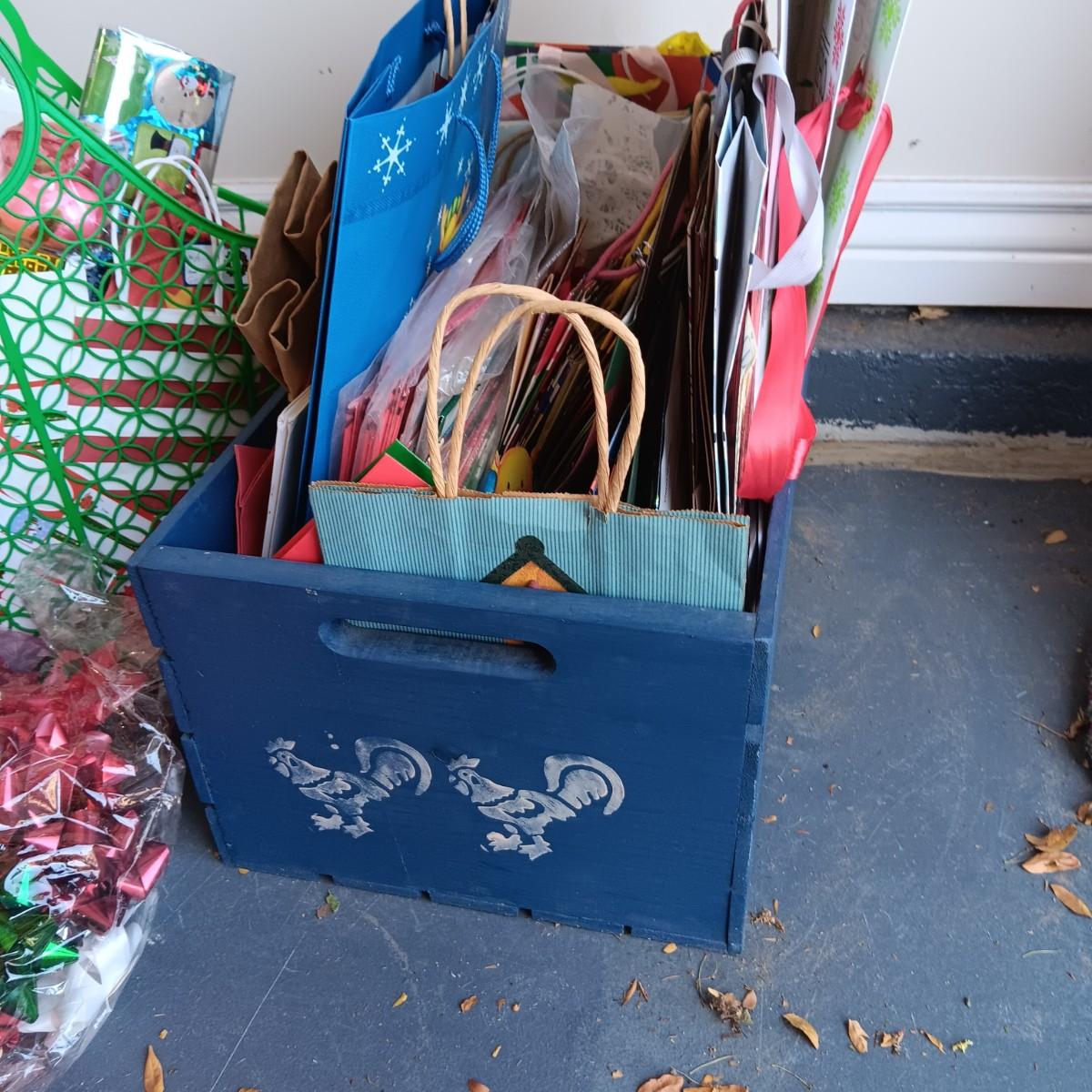 MANY GIFT BAGS IN A WOODEN CRATE, RIBBON & BOWS