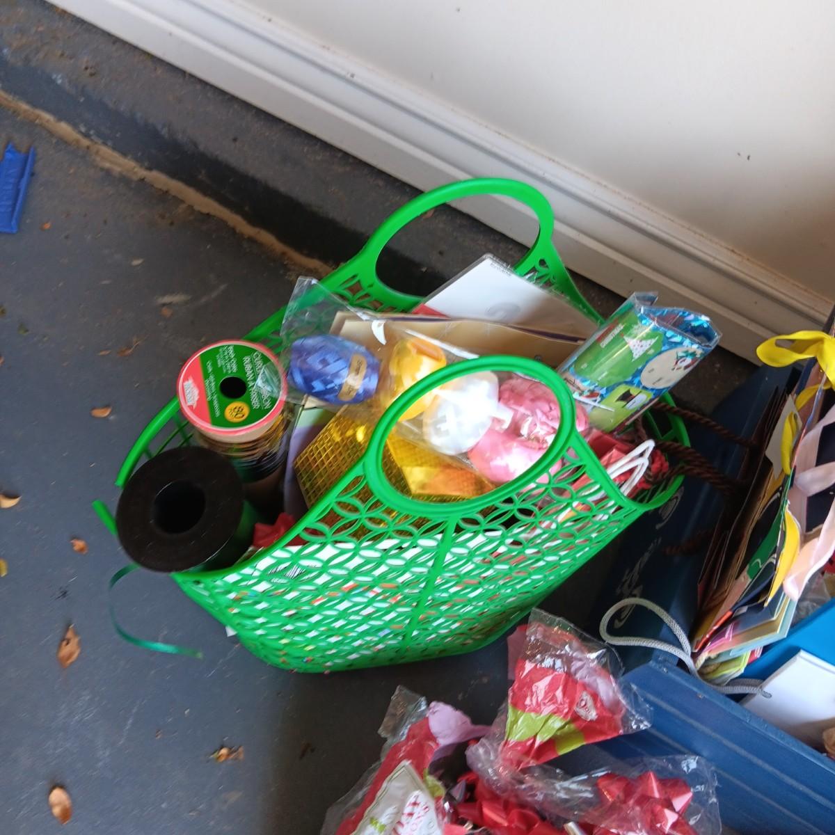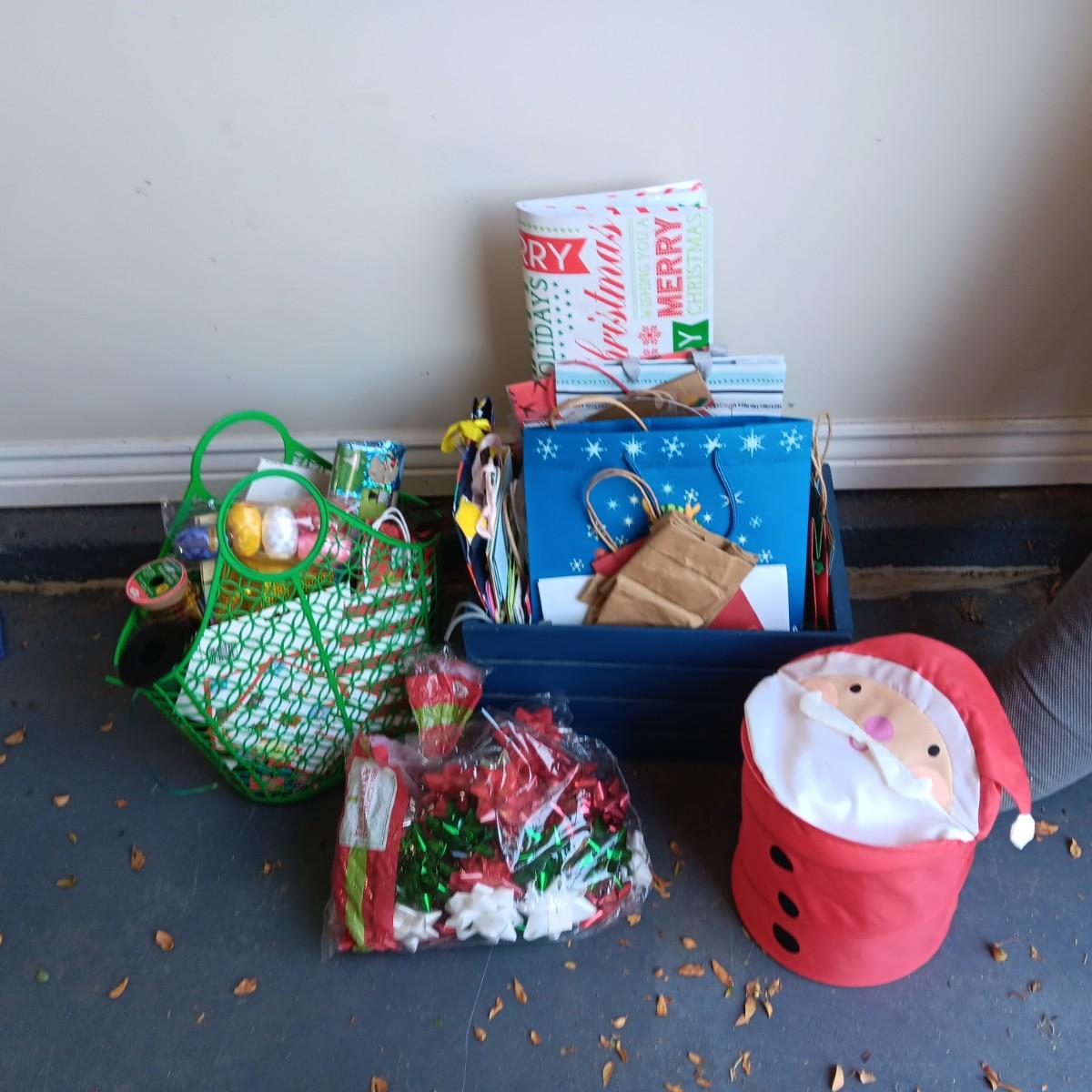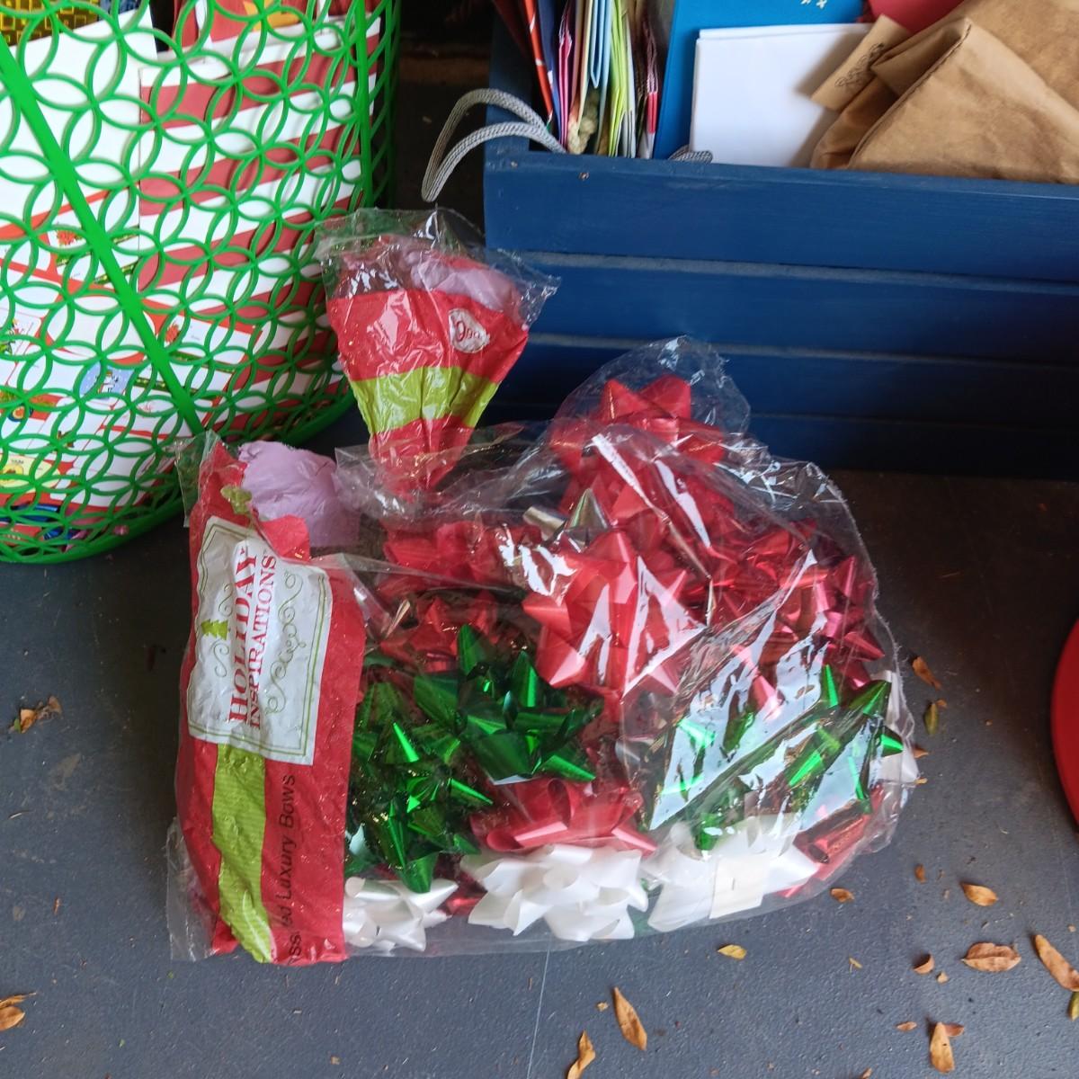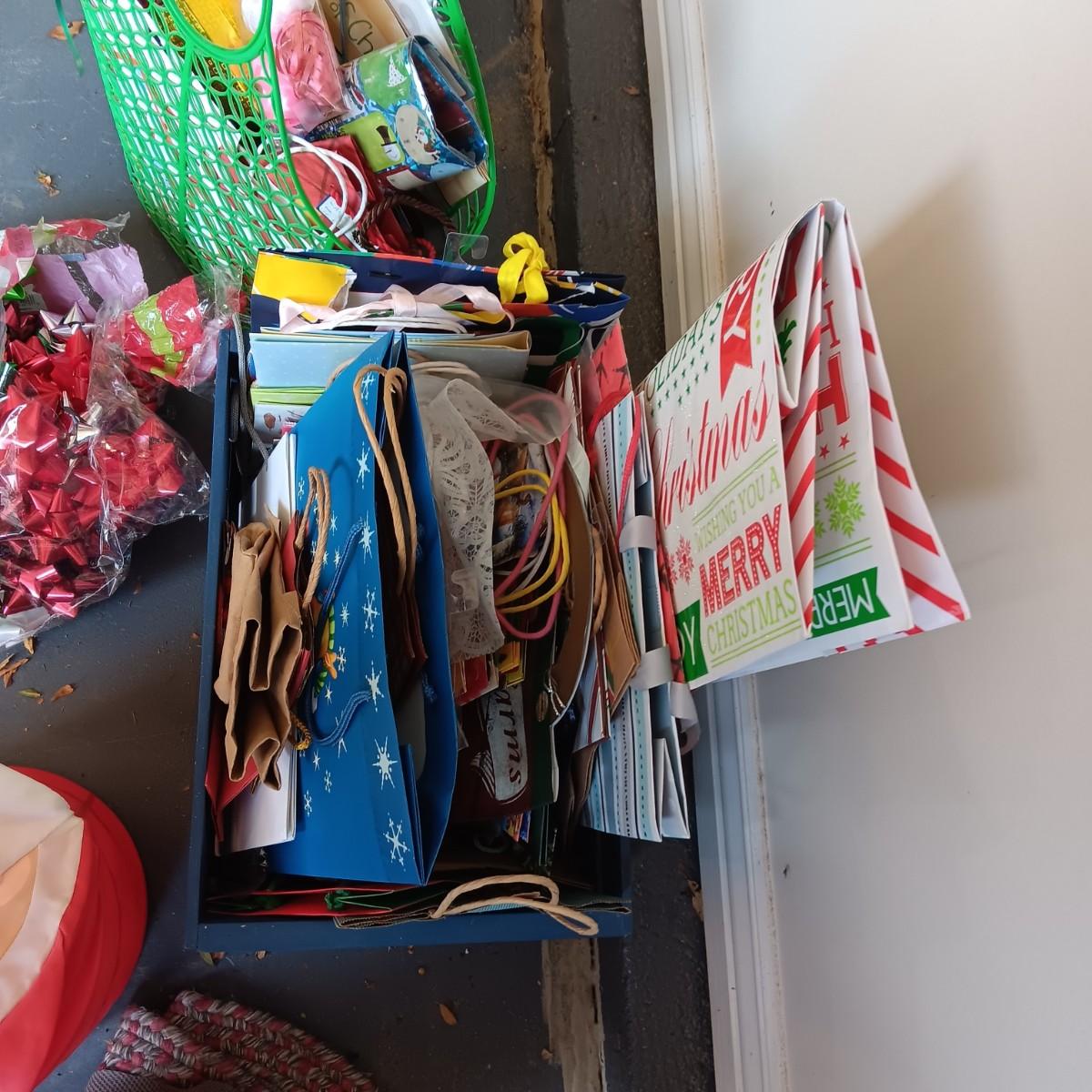 MANY GIFT BAGS IN A WOODEN CRATE, RIBBON & BOWS