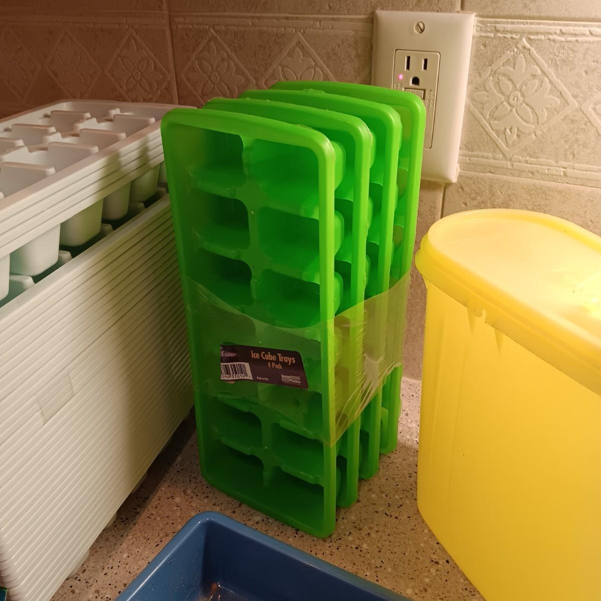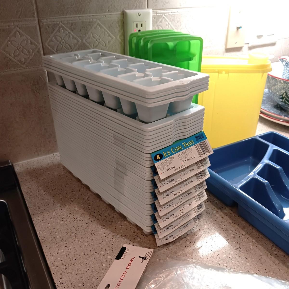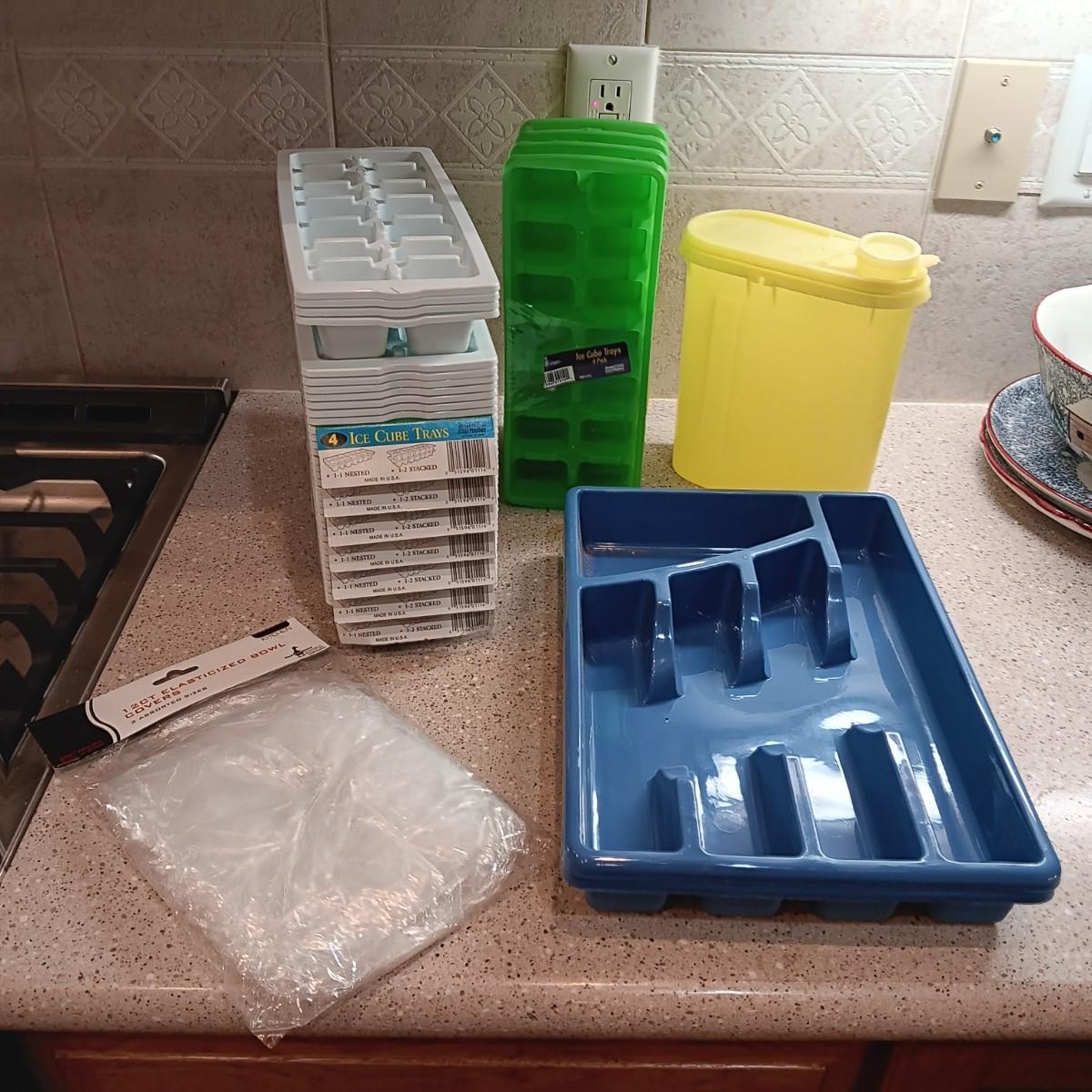 MANY ICE CUBE TRAYS, 2 DRAWER ORGANIZERS, TUPPERWARE PITCHER