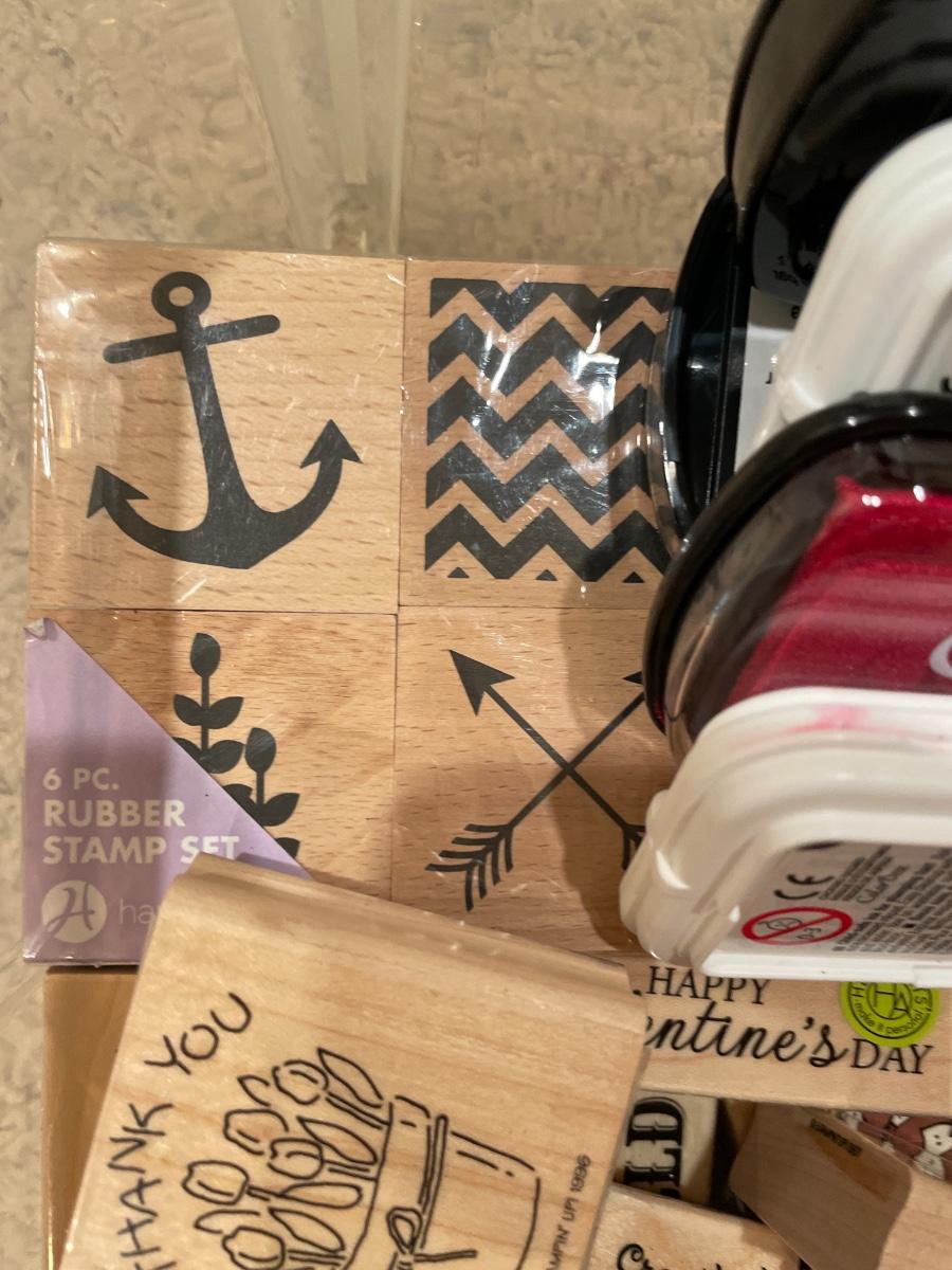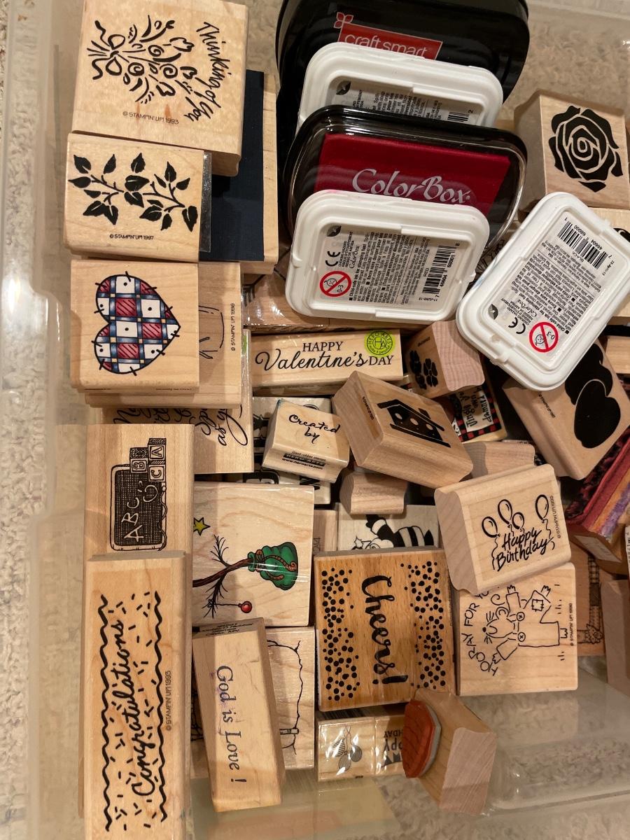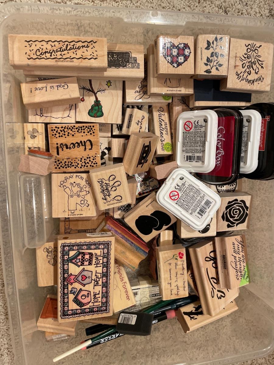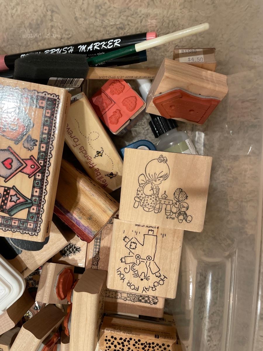 Many wood stamps in clear plastic tote