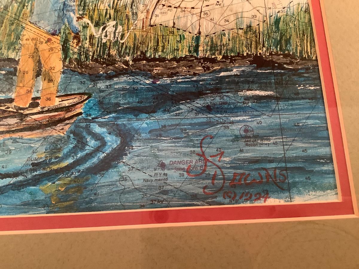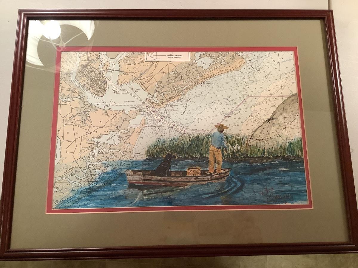 Map and cast net fisherman with dog art framed 16"H 22"W
