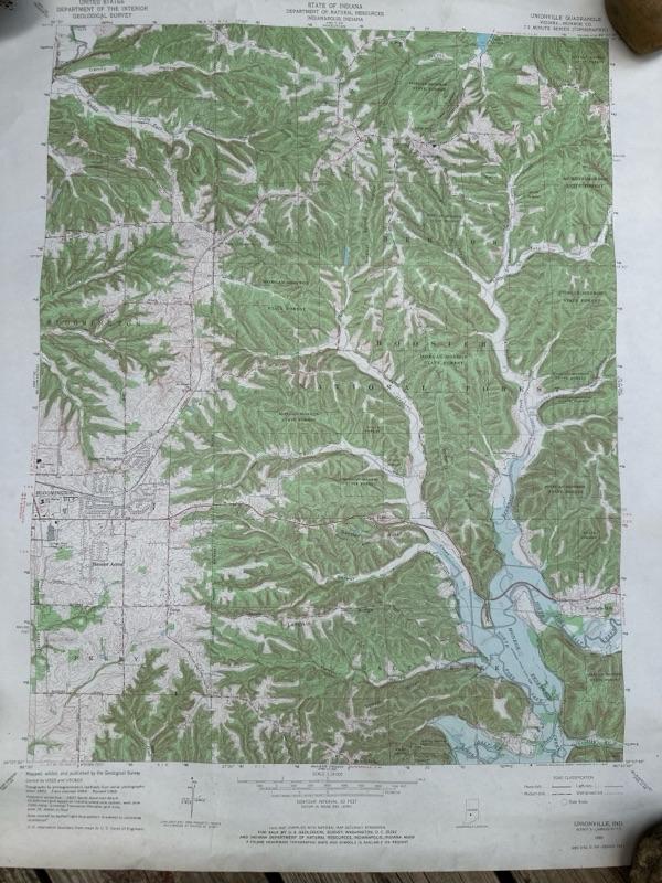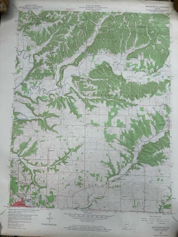 There are four maps from the state of Indiana Department of conservation. One map has pleasant run and Polk Hoosier national Forest, another map for the Hoosier national forest another map for yellowwood State Forest and part of Brown County State Park and one for Morgan Monroe national Park. All are the same size shape and where as the two that are pictured.