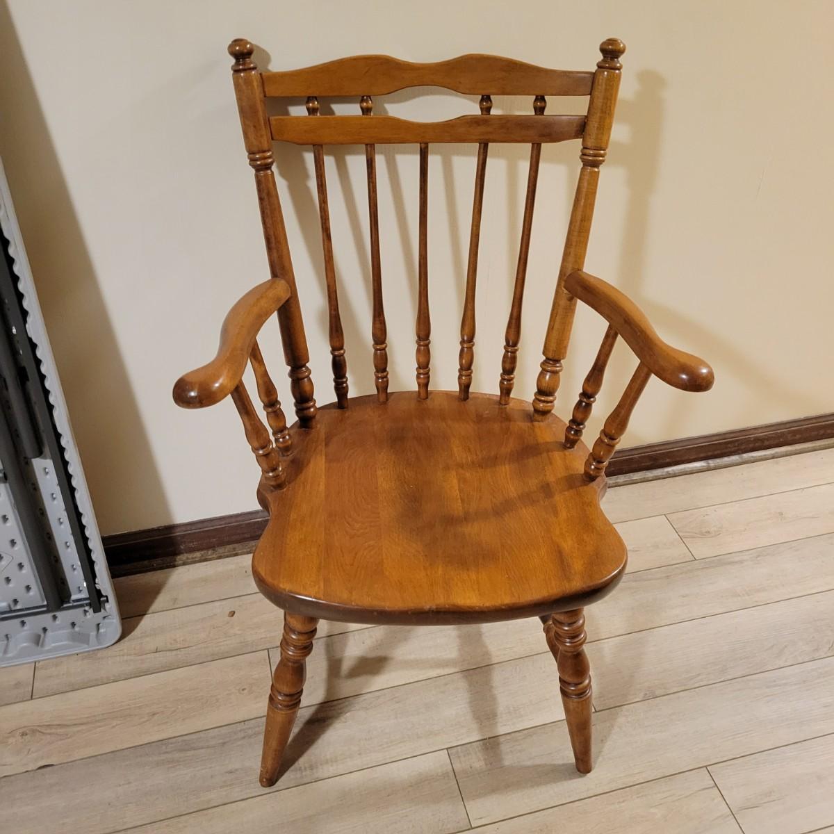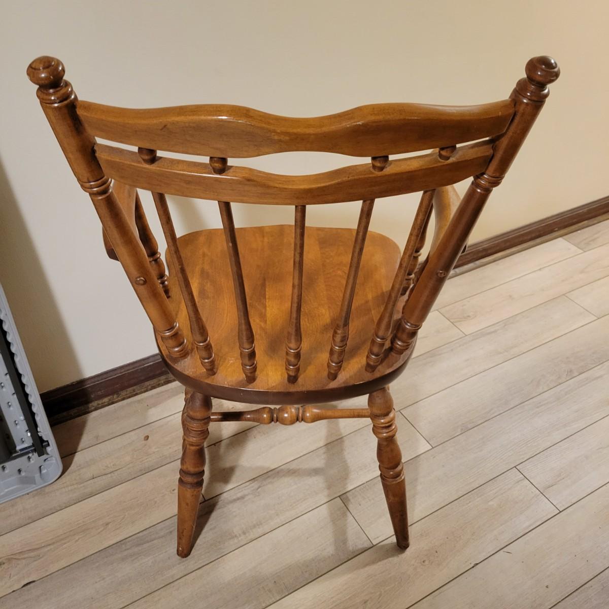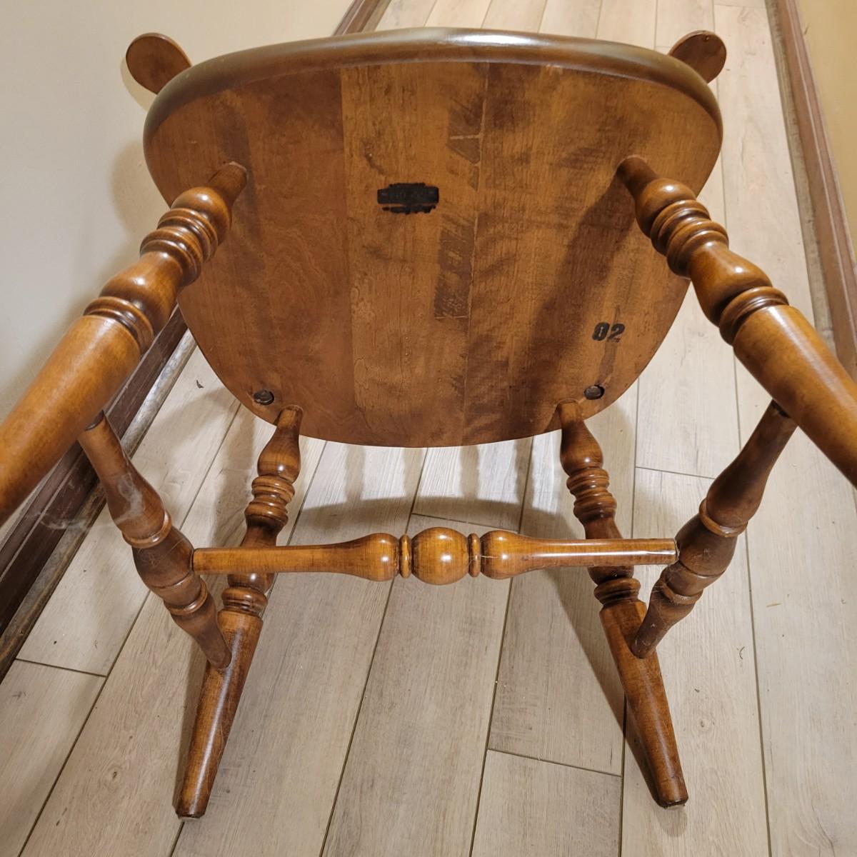 A solid wood, lathe back Windsor chair by Maple Center Inc. It measures approximately 25" x 23" x 36"H with a seat height of 17.5". Local pickup only