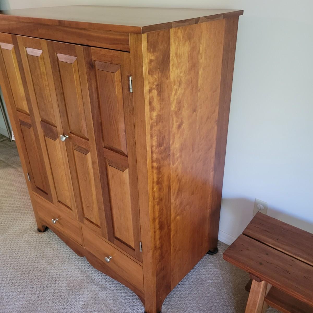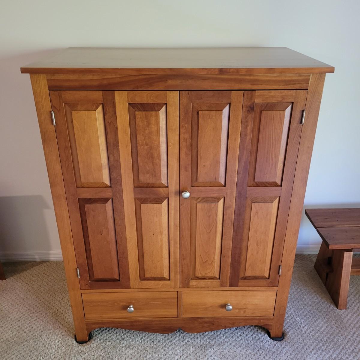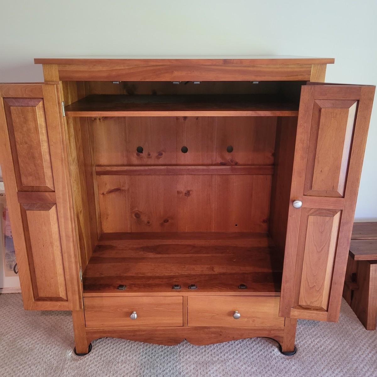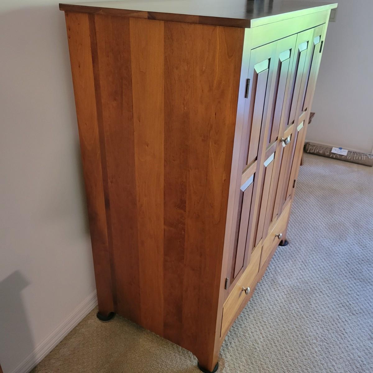 A solid maple entertainment cabinet manufactured by Tom Seely Furniture. This piece features two folding doors with brushed nickel handles to a large open storage space with one shelf (Note holes in back panel for wires to go through. It also has two dovetailed drawers and measures approximately 41.5" x 24" x 52"H. There are a few minor blemishes on this piece (see pix). Local pickup only. Winning bidder must bring assistance to help move and load this item due to its weight and/or size.Items is located on lower level so one flight up to main level.