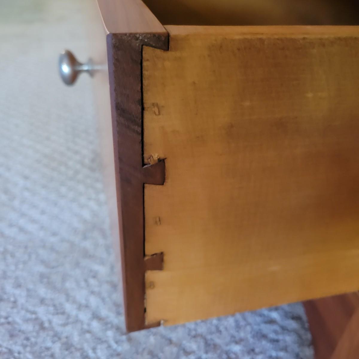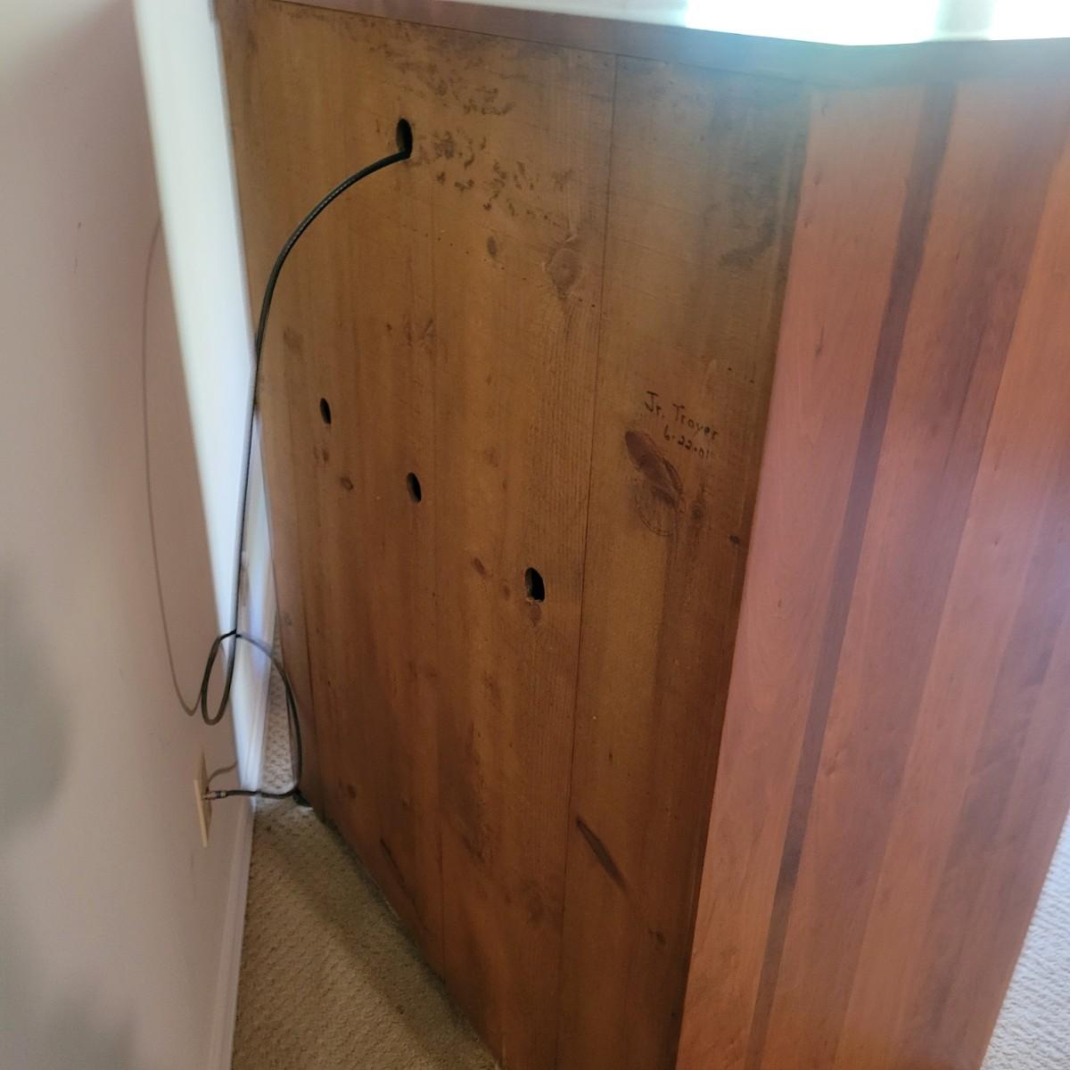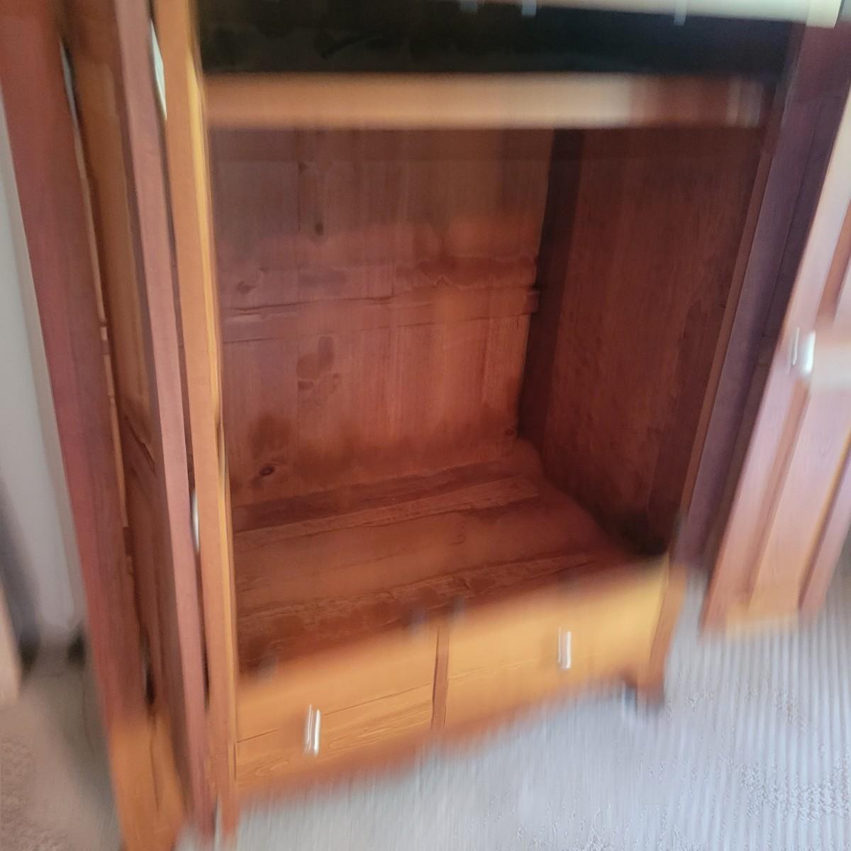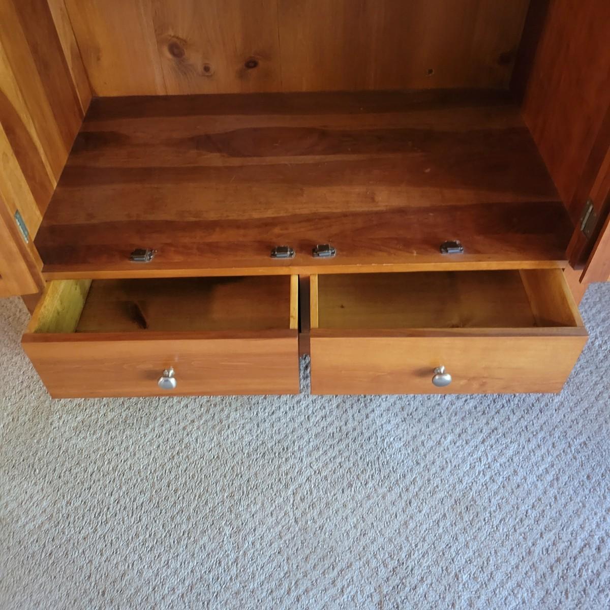 A solid maple entertainment cabinet manufactured by Tom Seely Furniture. This piece features two folding doors with brushed nickel handles to a large open storage space with one shelf (Note holes in back panel for wires to go through. It also has two dovetailed drawers and measures approximately 41.5" x 24" x 52"H. There are a few minor blemishes on this piece (see pix). Local pickup only. Winning bidder must bring assistance to help move and load this item due to its weight and/or size.Items is located on lower level so one flight up to main level.