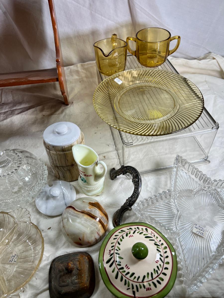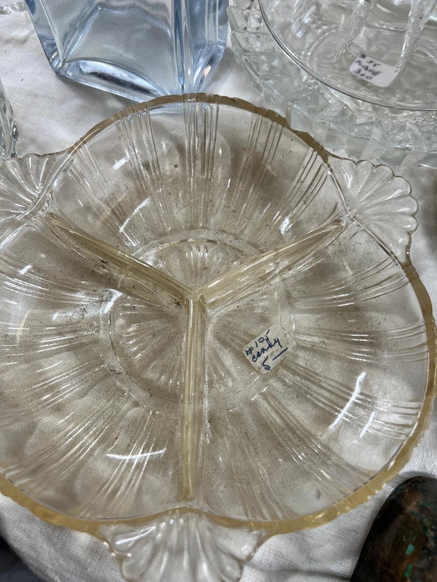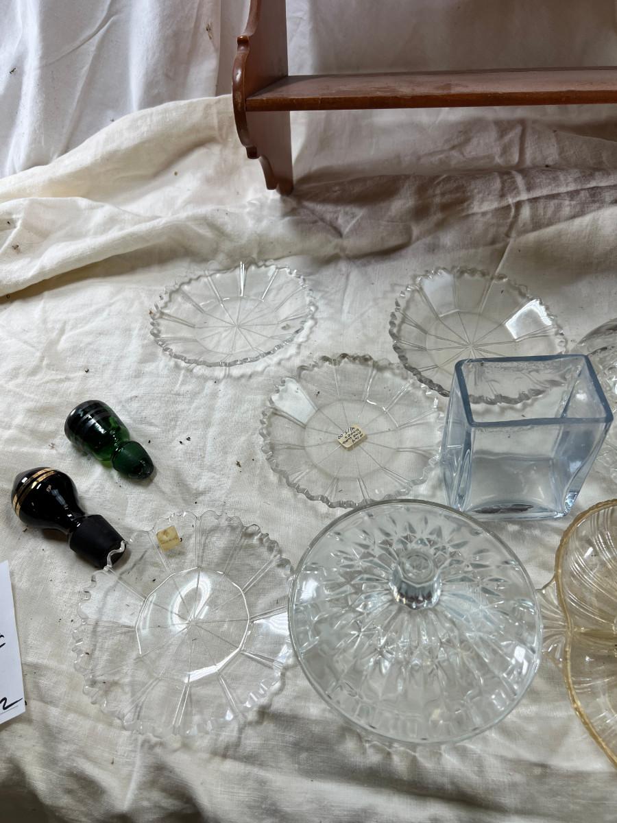 Selection of depression glass, random lids, Decanter stoppers, Candy bowls.