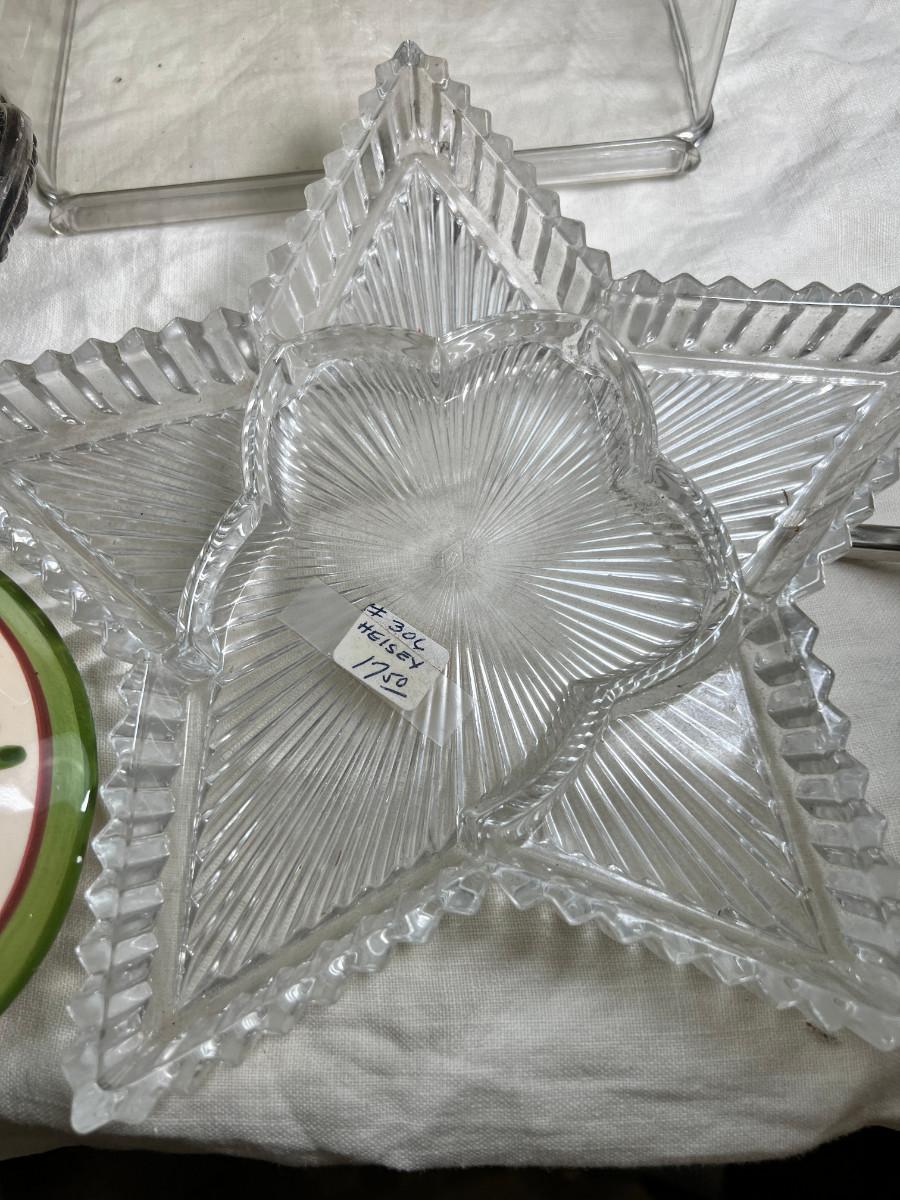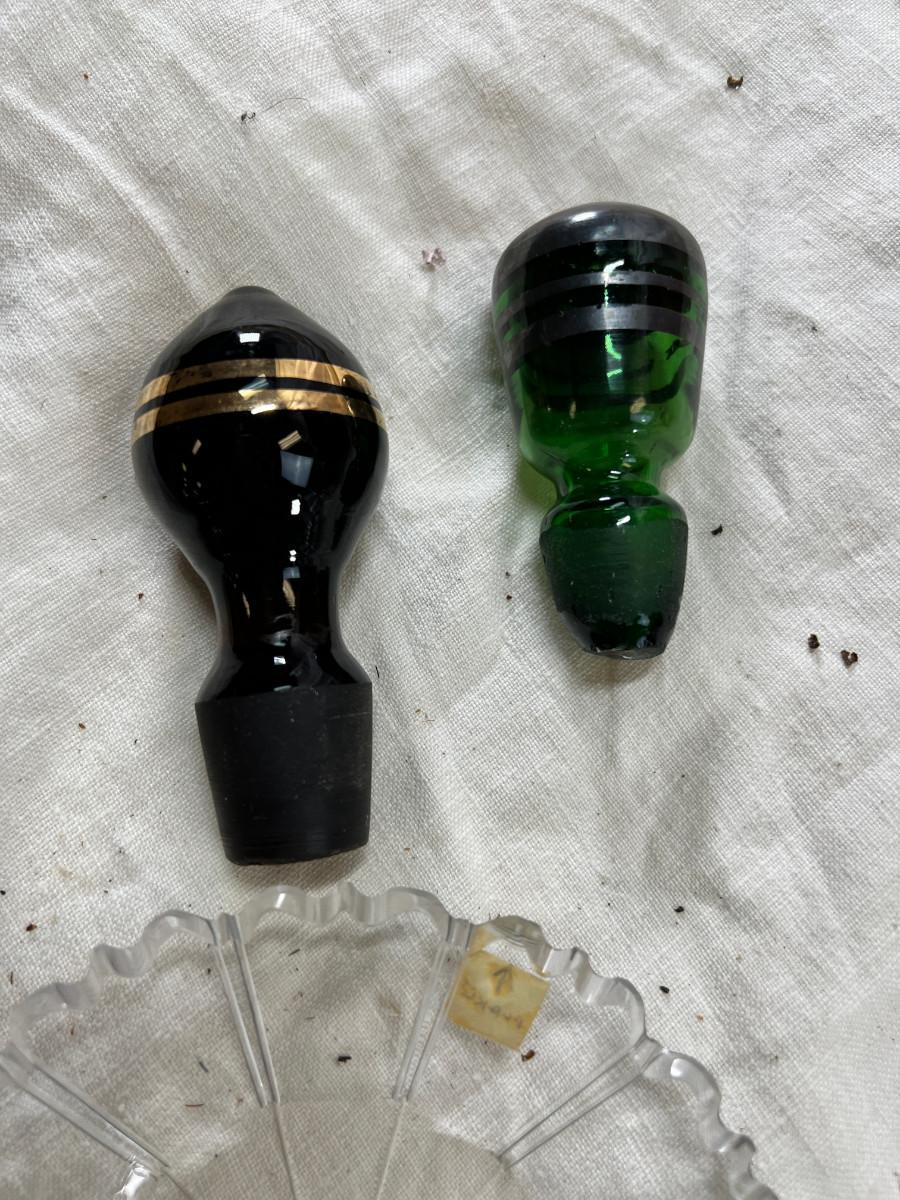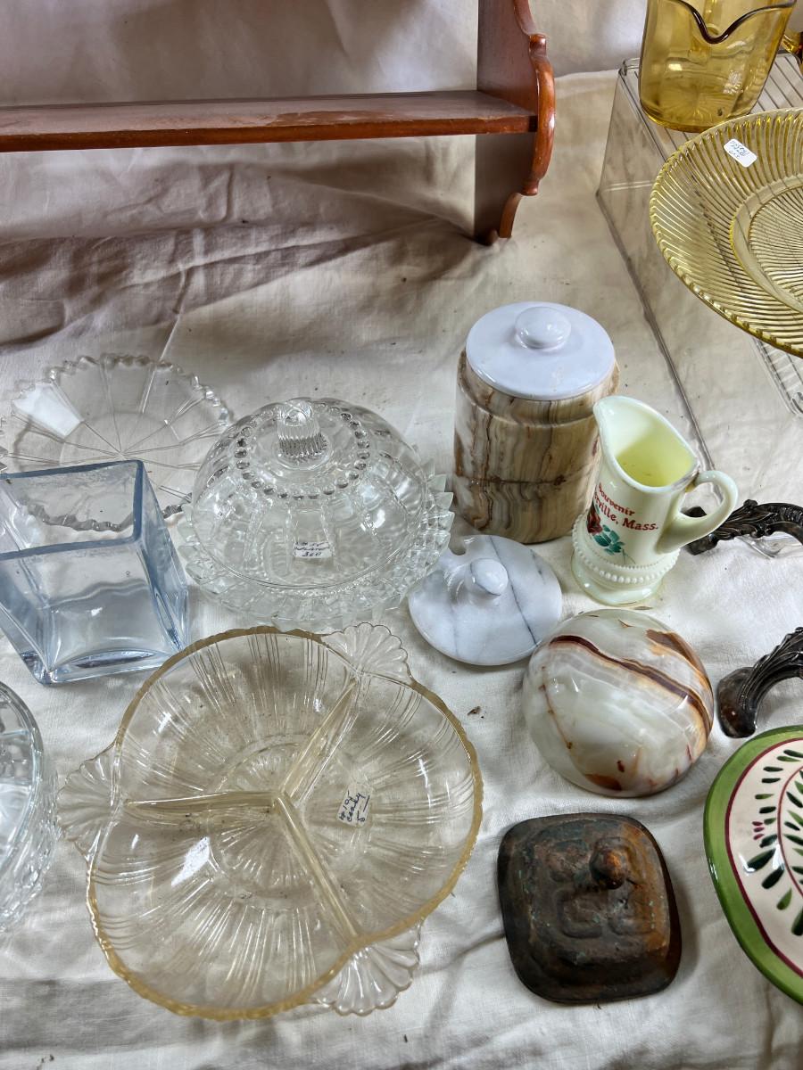 Selection of depression glass, random lids, Decanter stoppers, Candy bowls.