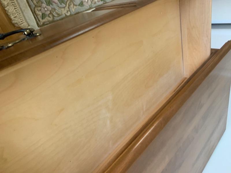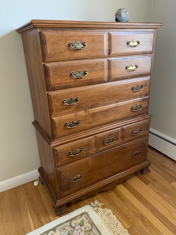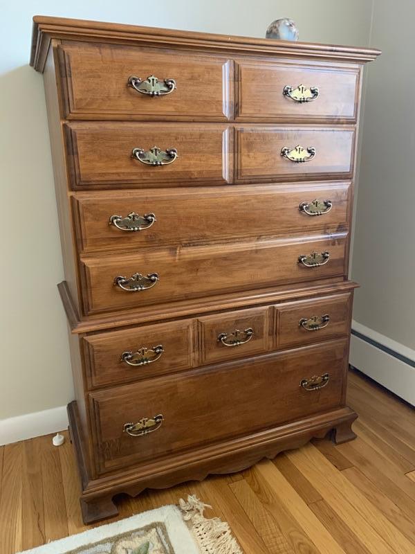 Solid maple construction including drawer interiors, 5 large drawers and antique-finish brass pulls, 1960's vintage. Great condition.