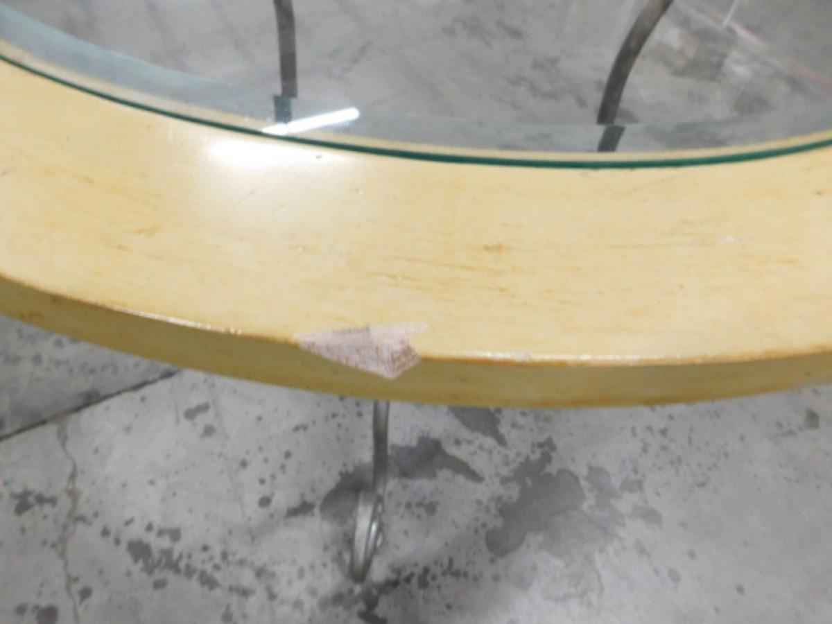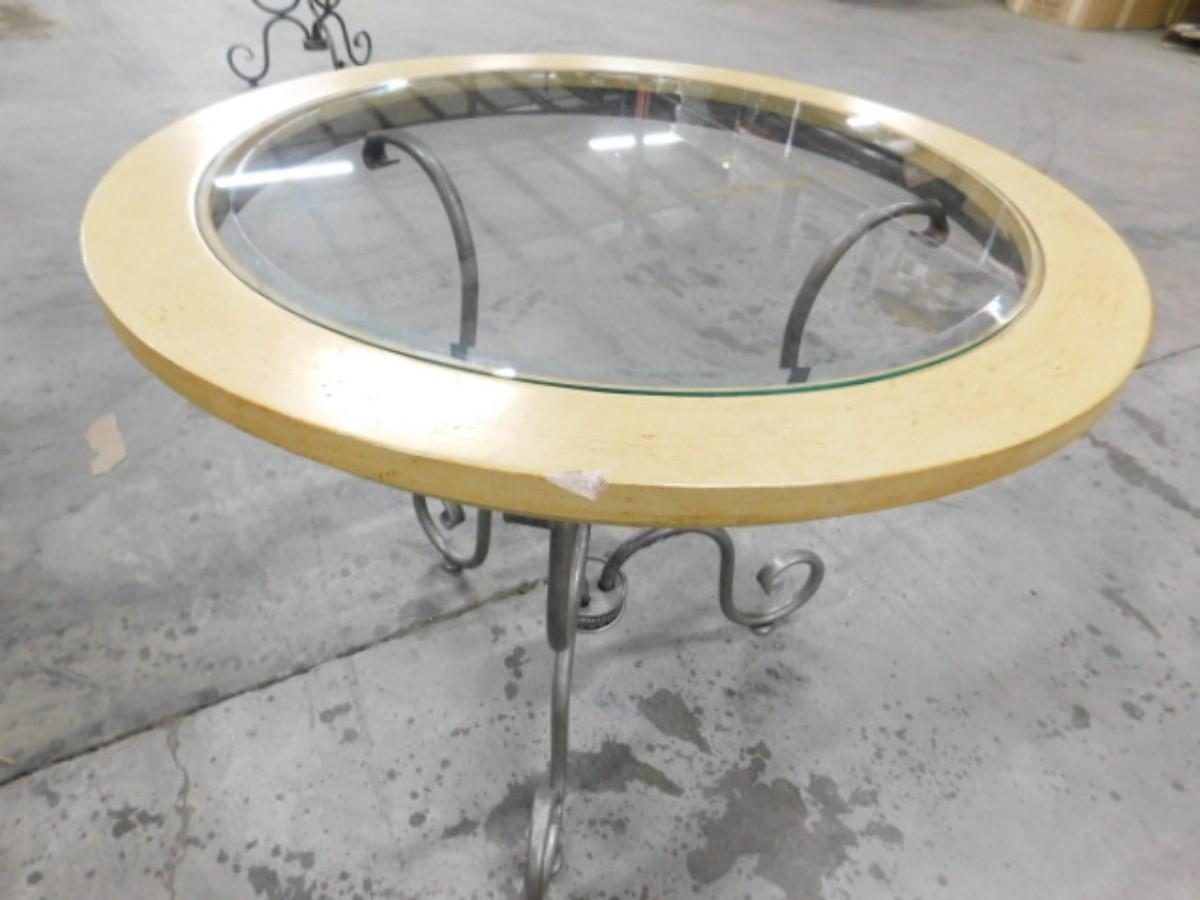 Maple Wood Finish with Beveled Glass Insert Accent Table and Metal Base Choice B. Has a chip in the wood as shown. Expect some wear or scratches to finish. Shipping option available via freight or local mover at Buyer's expense. Buyer must have all shipping scheduled within the stated dates and times of pickup. Recommended local mover is Beaty Bros. Moving 828-201-2982