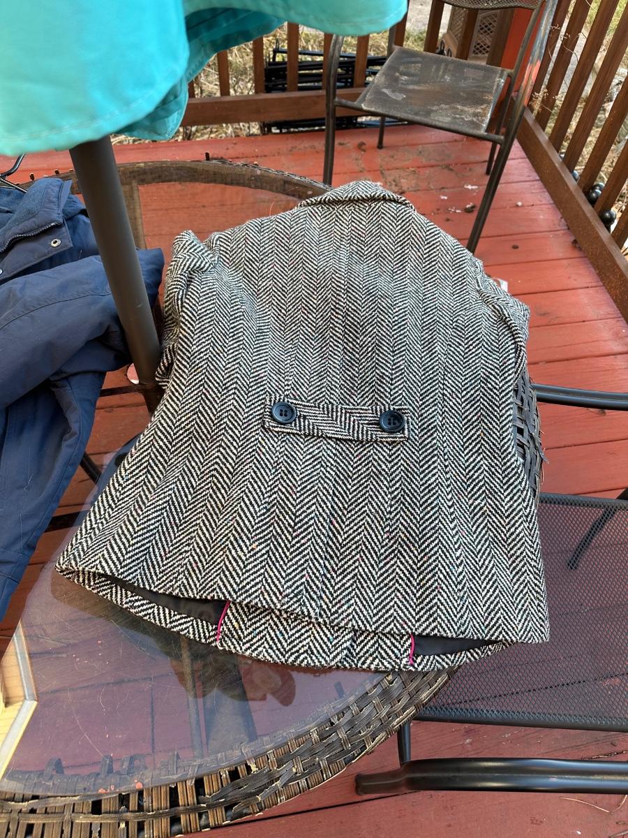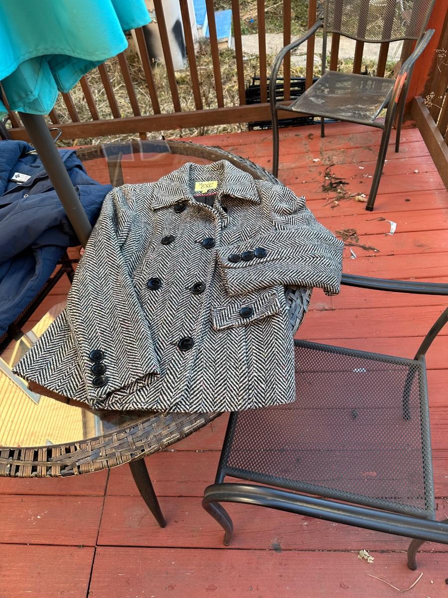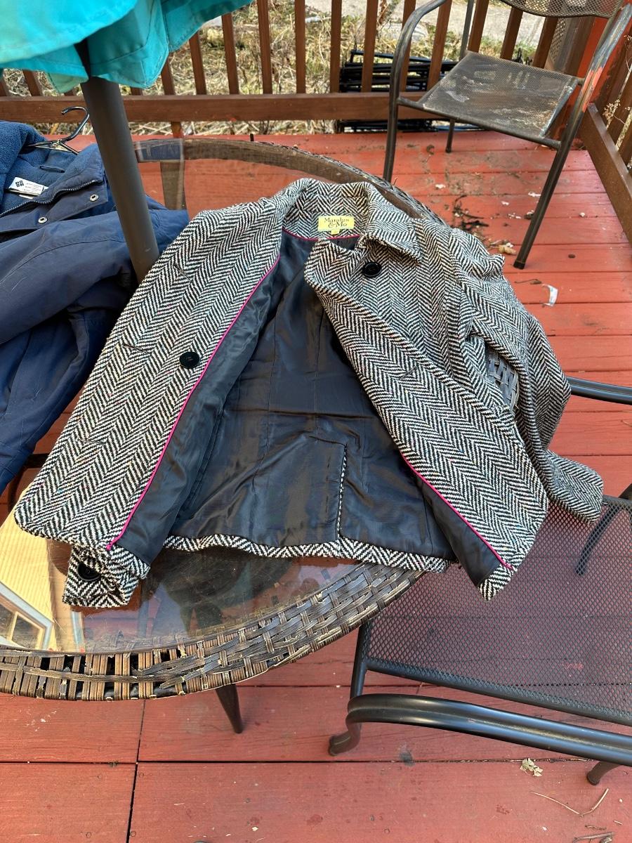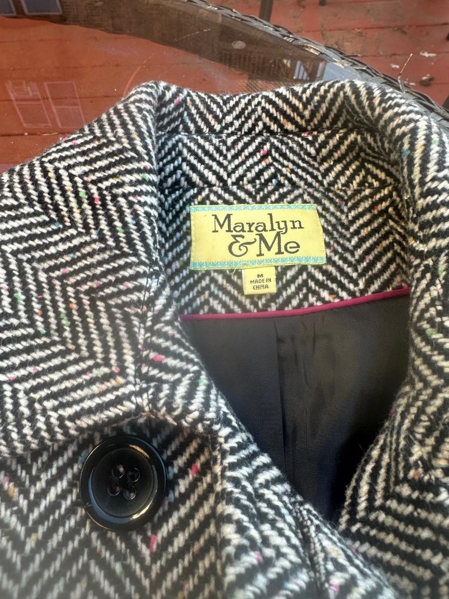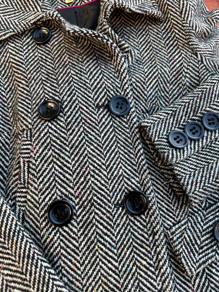 Juniors' single-breasted walker coat in a black and white herringbone pattern.