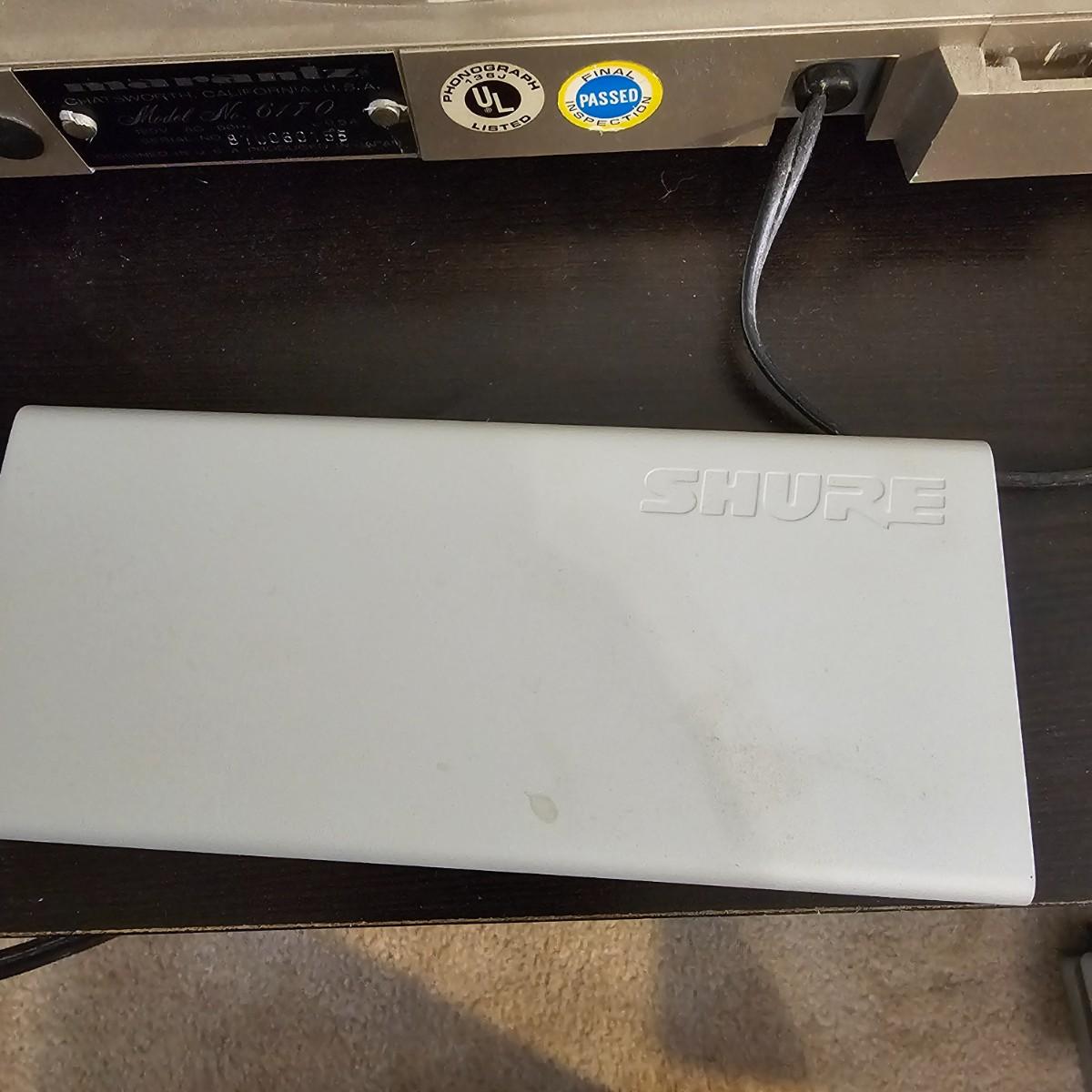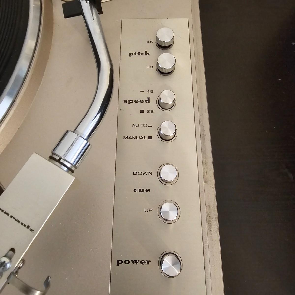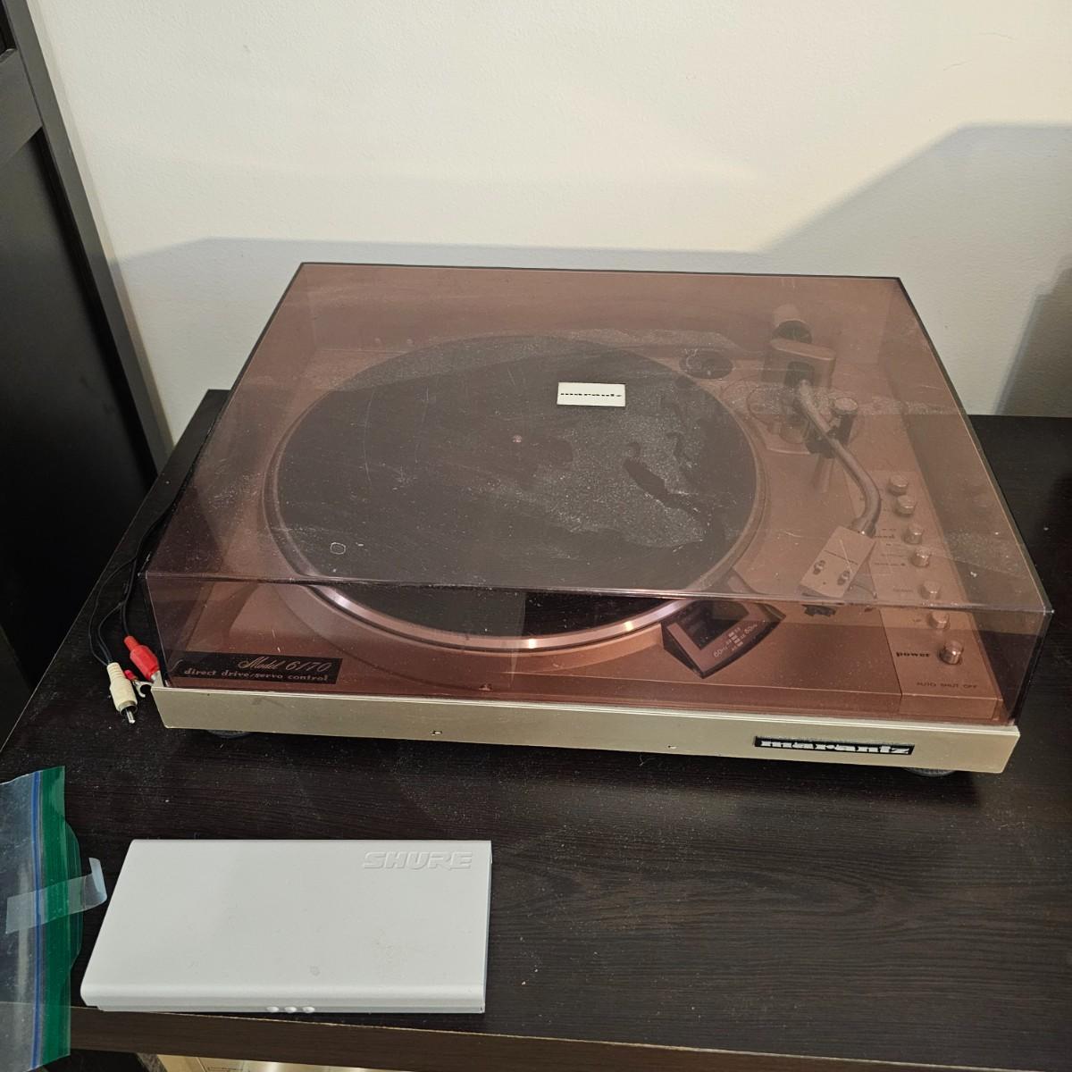 Classic Marantz turntable, has smoke tinted cover and 45rpm adapter. Tonearm has a Shure cartridge installed, not certain which one. Unit measures 17.5" x 13.5" x 5"H, powered on when plugged in. Also includes an aluminum case which probably held the cartridge, and a bag with a small screw, purpose unknown. See photos for details. Local pickup only.
