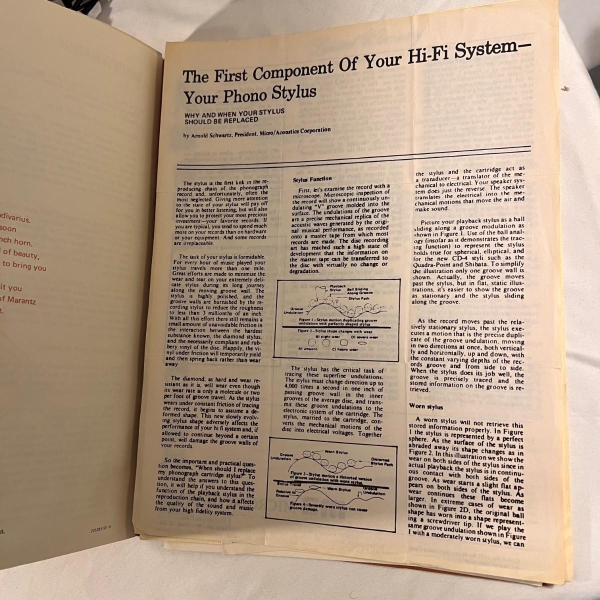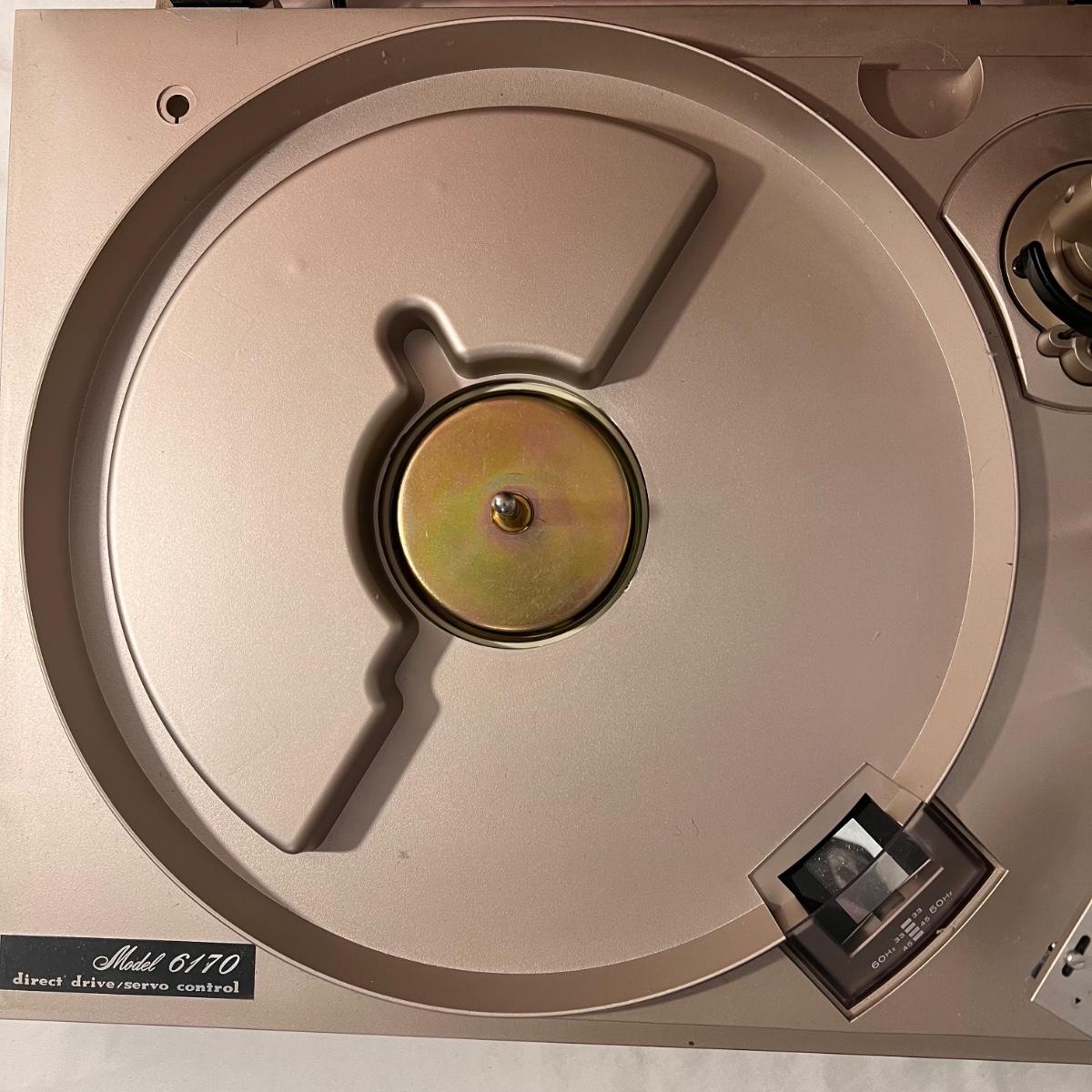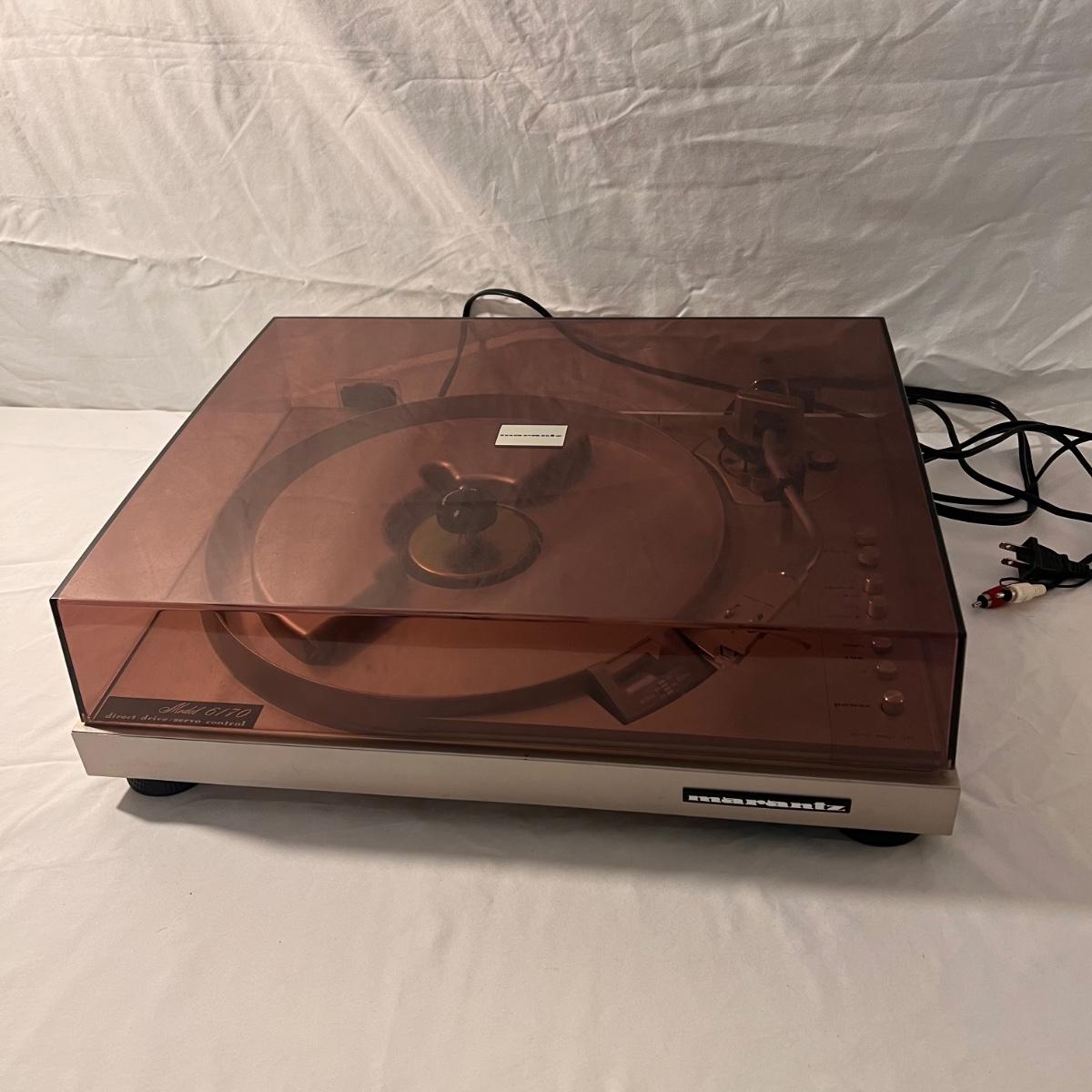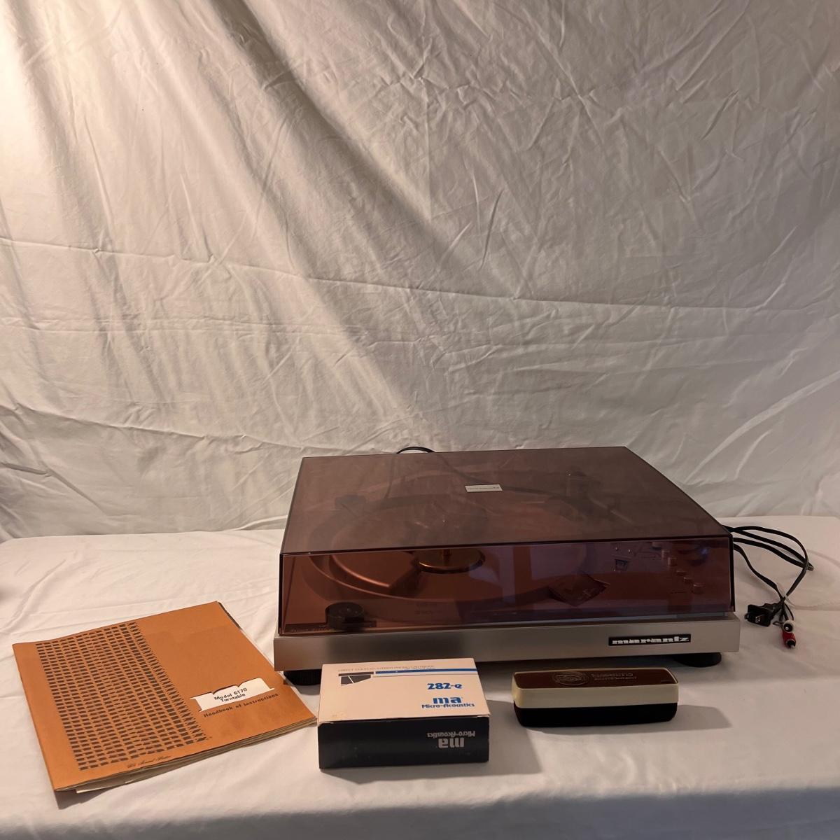 This lot includes a Marantz record player that powered on when plugged in, model 6170 (direct drive/servo control), a Le-Bo magnetic record cleaner, Micro-Acoustics direct-coupled stereo phono cartridge, and the Marantz manual. The record player measures 17" x 13" x 5.5"H. Shipping available.