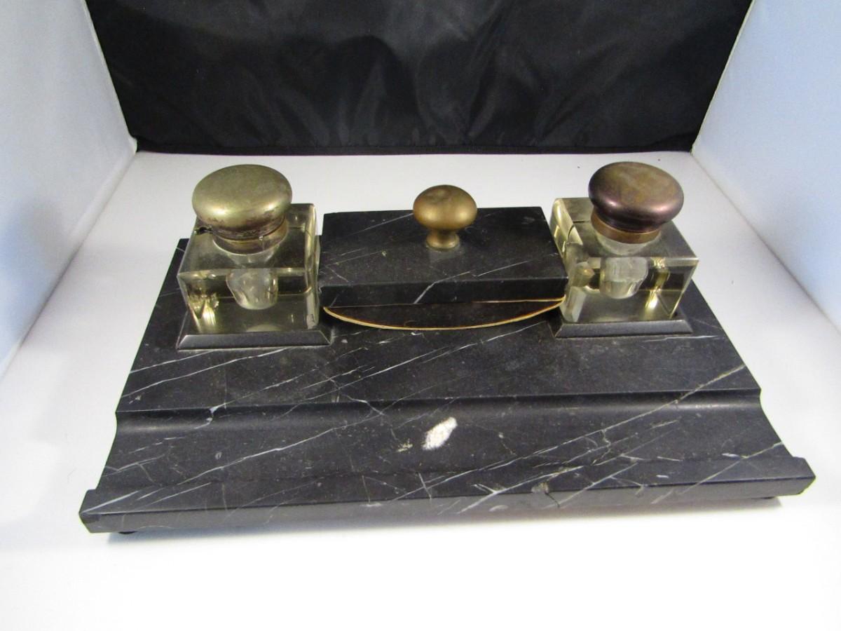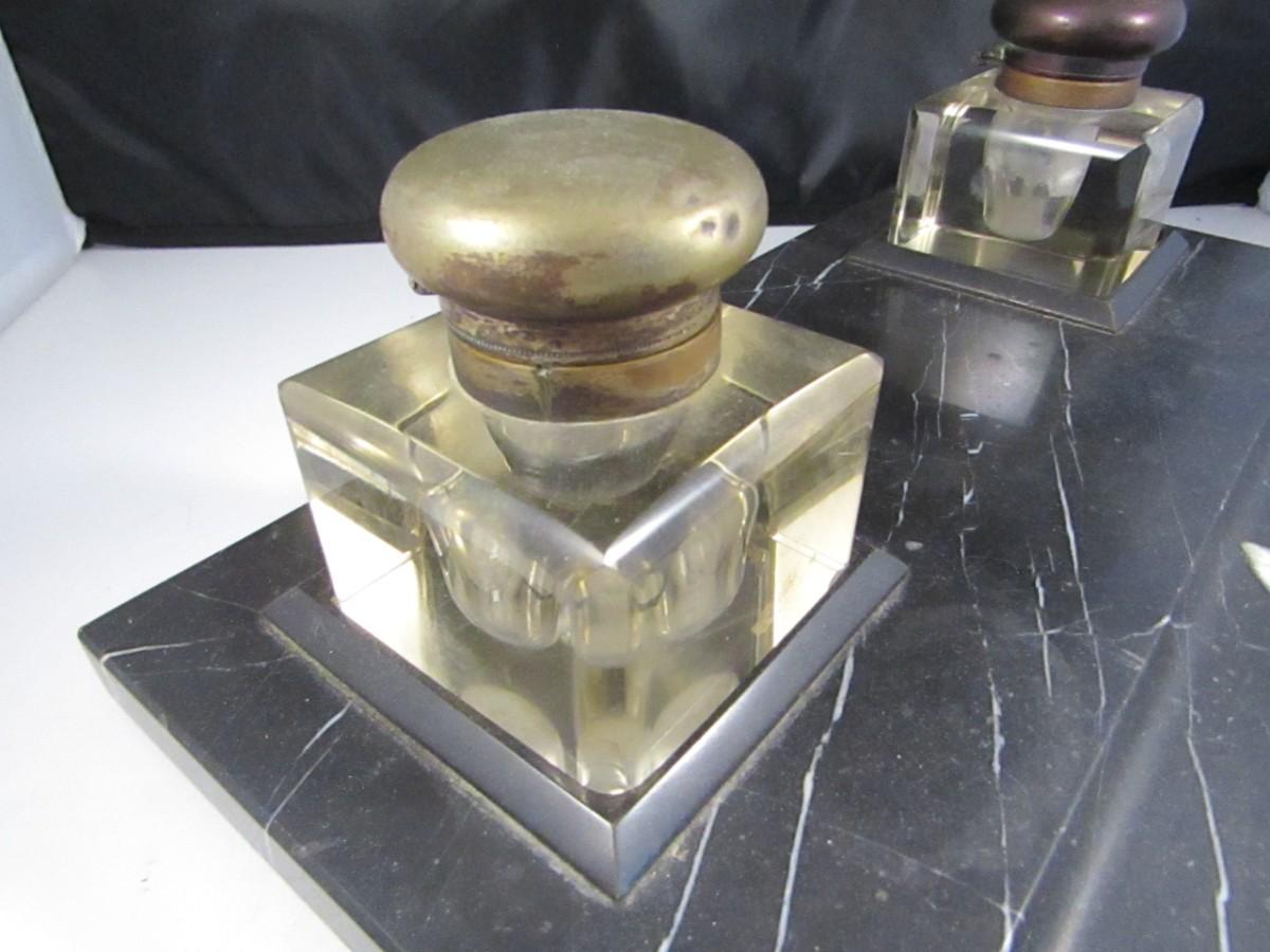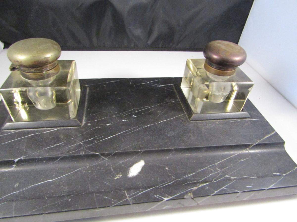 Marble Base Double Glass Inkwell and Stamp Desk Set
