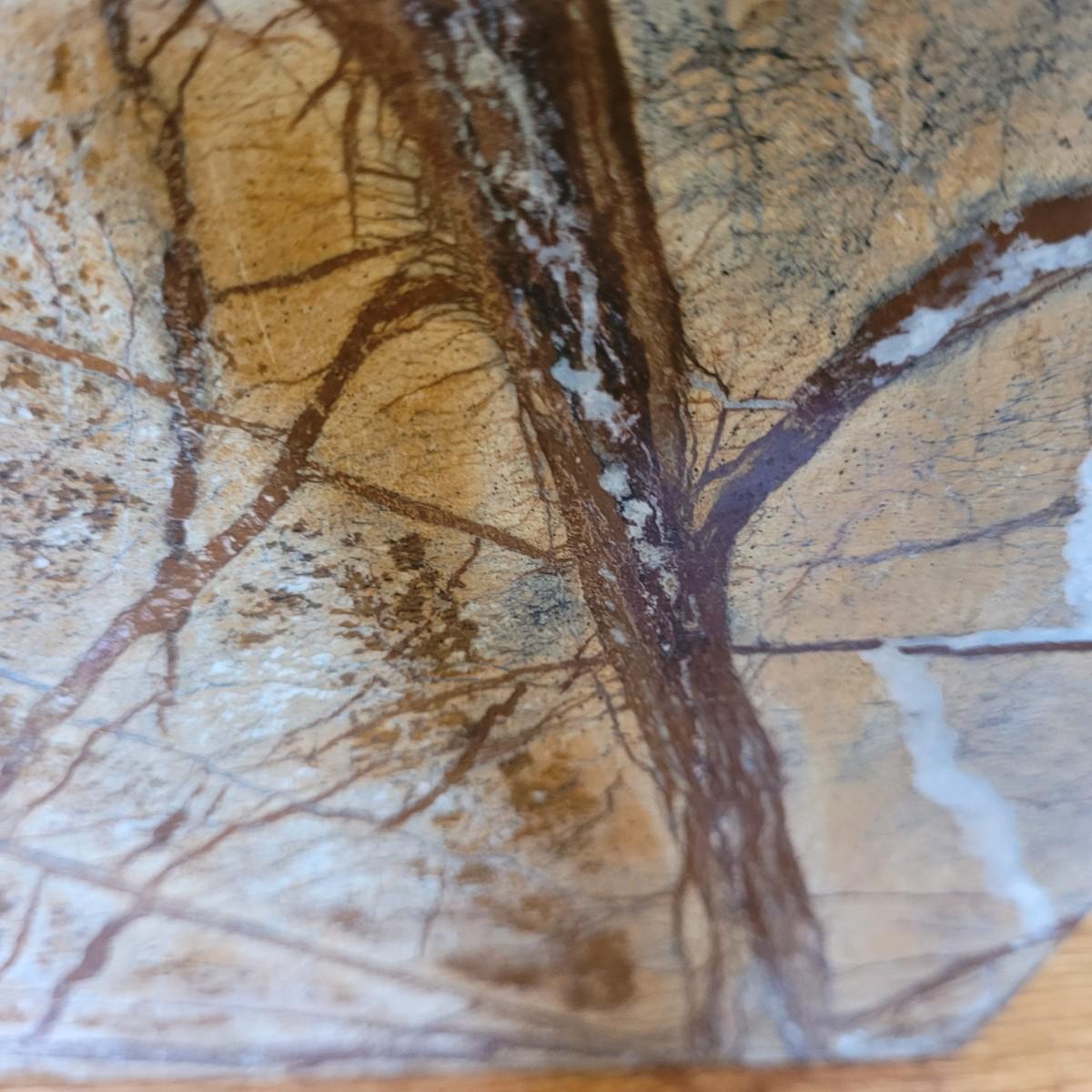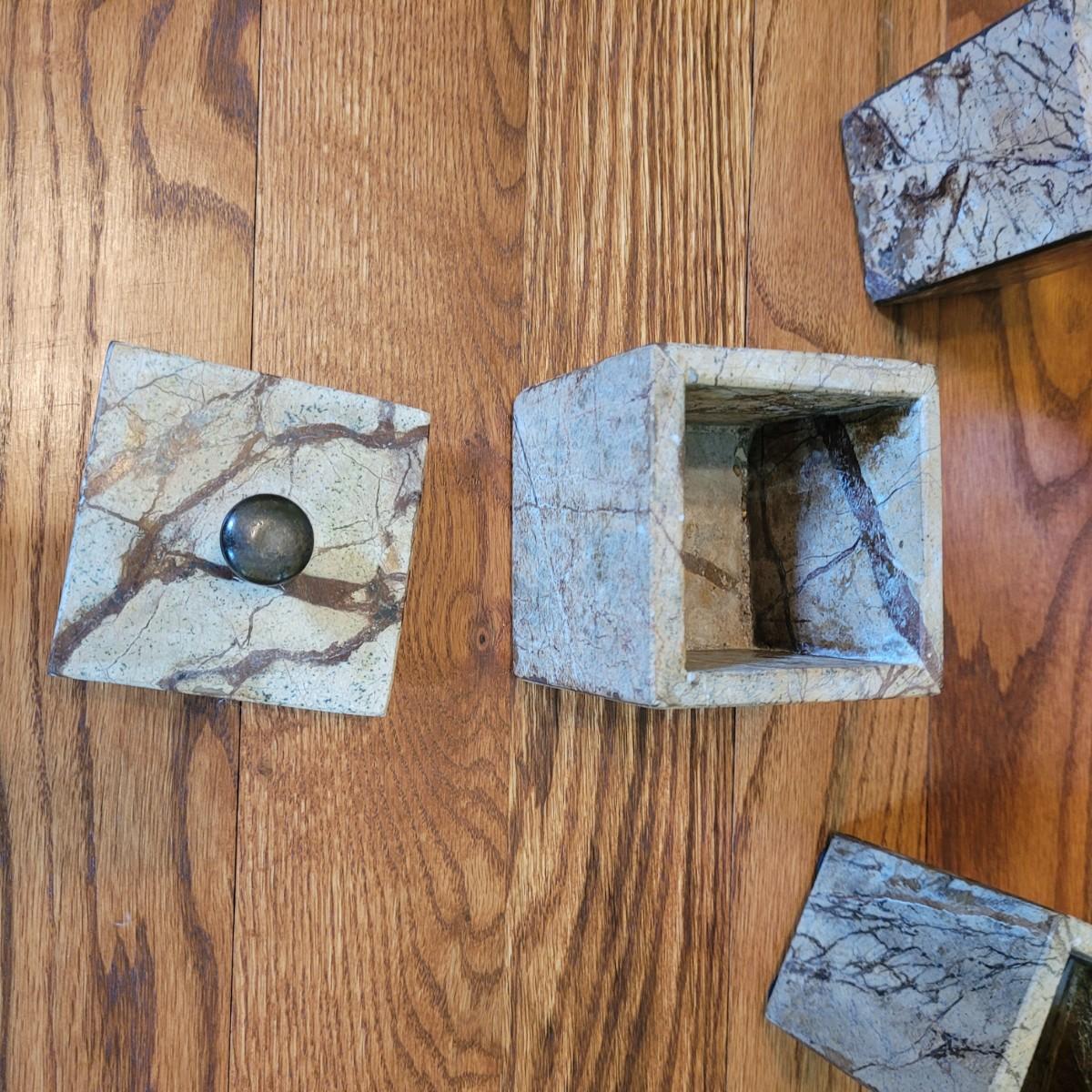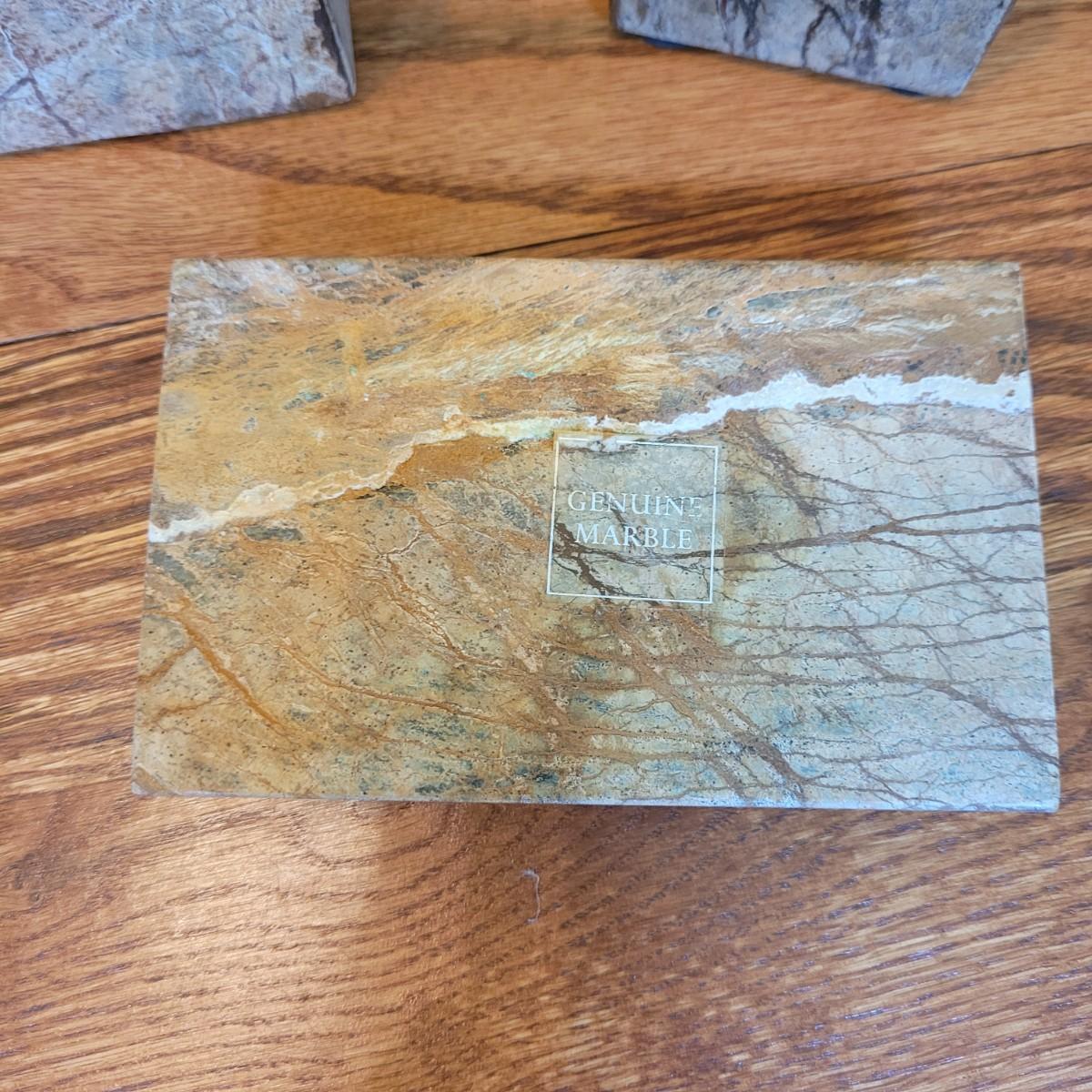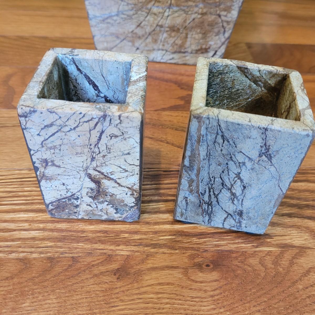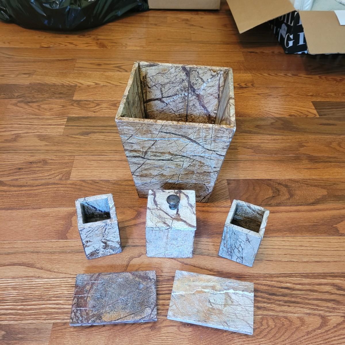 A marble bath accessory set, including a trash bin, lidded container, two soap dishes and two toothbrush holders. Trash bin measures approximately 8” x 8” x 9”H.