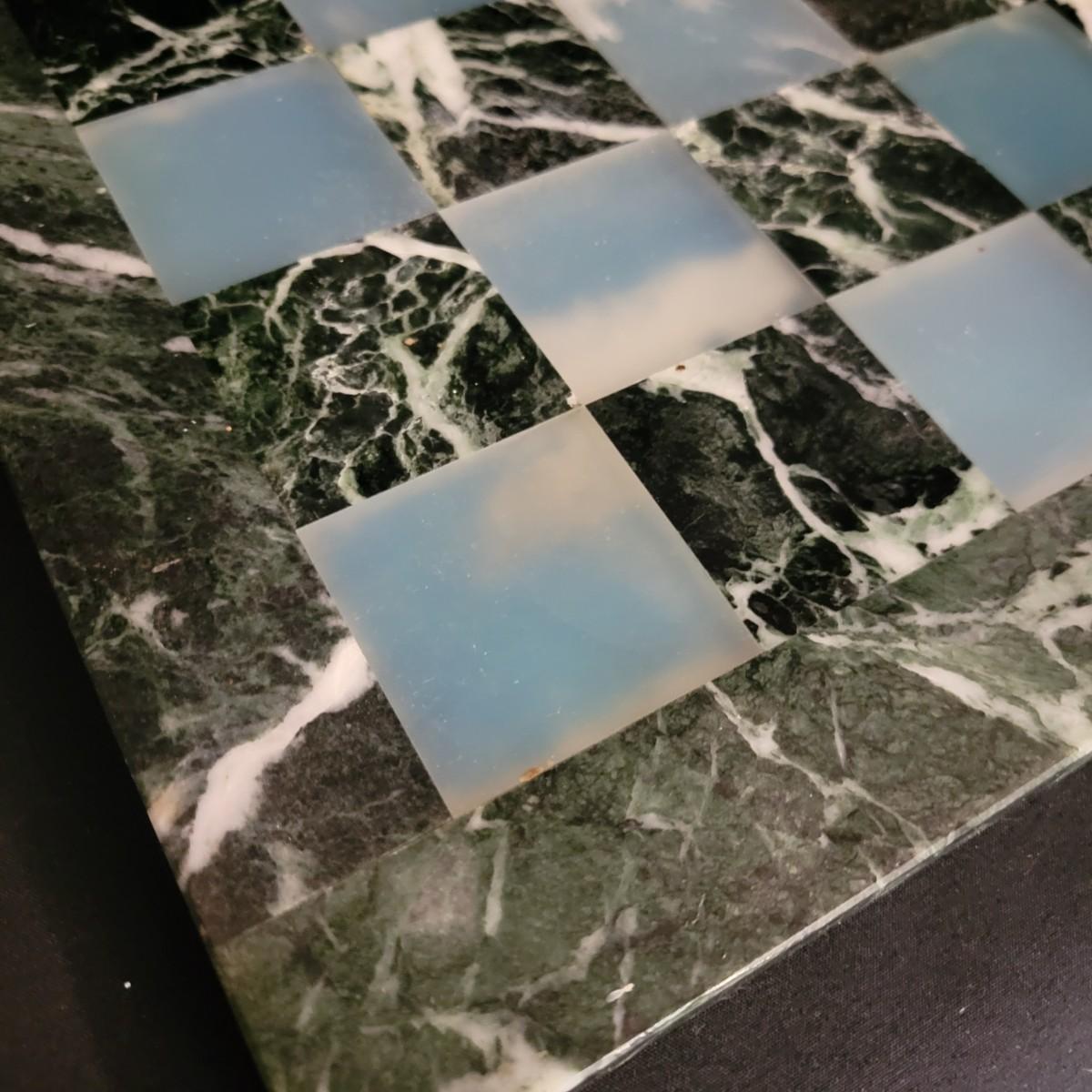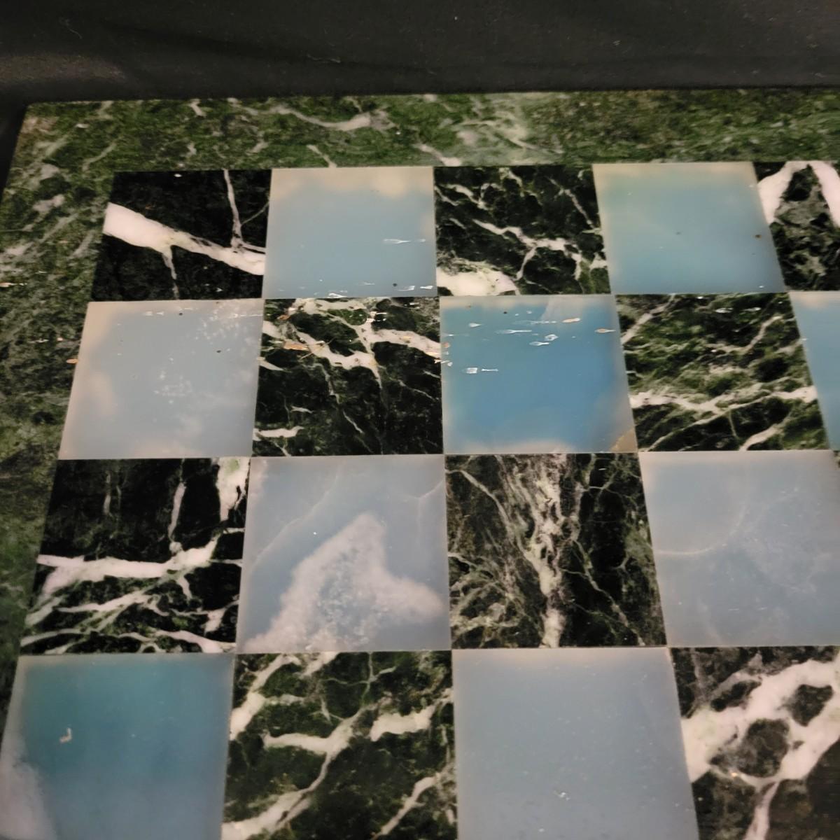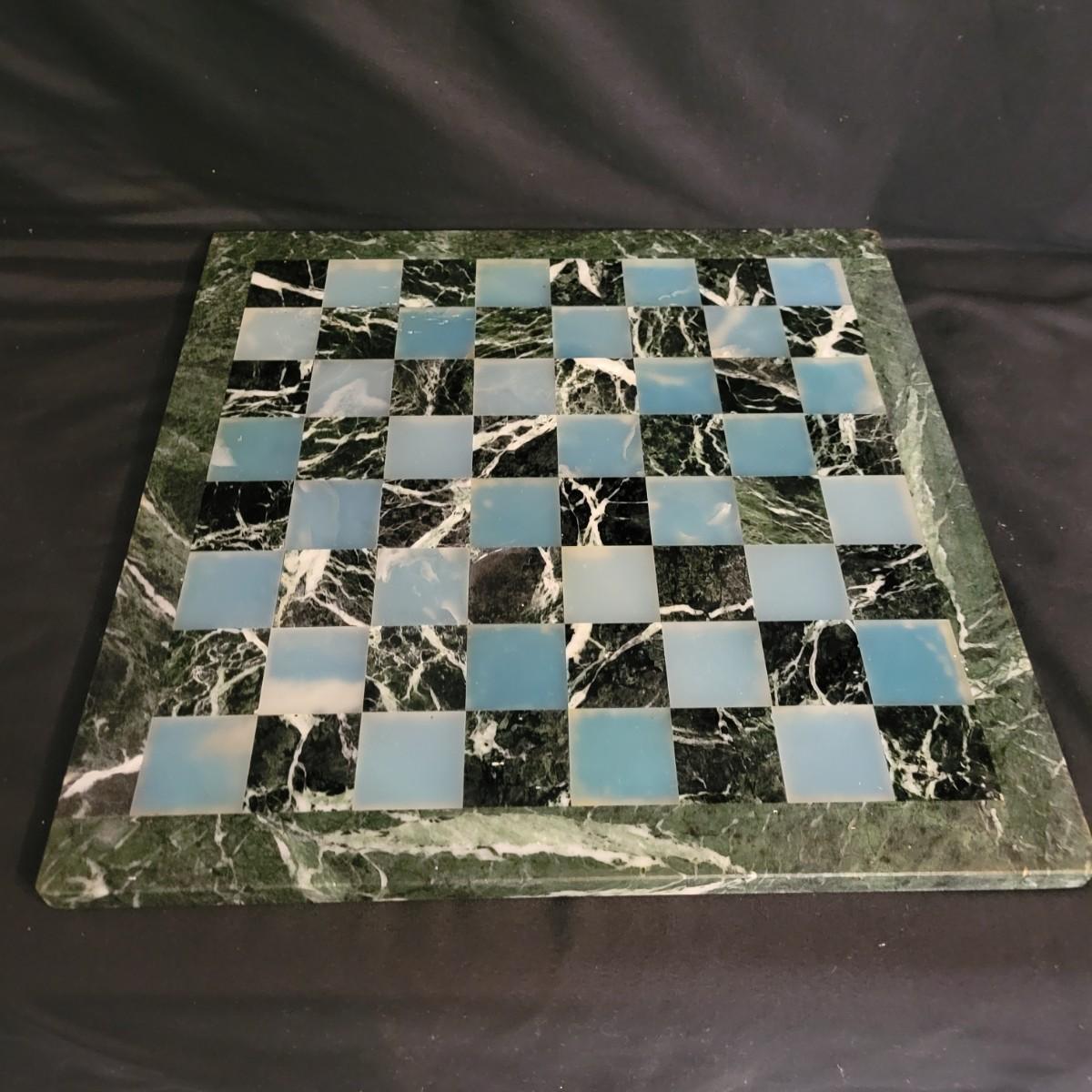 A marble chess board that has no notable damage. This chess board has three different colors of marble and measures approximately 16" x 16" x 1". Local pickup only