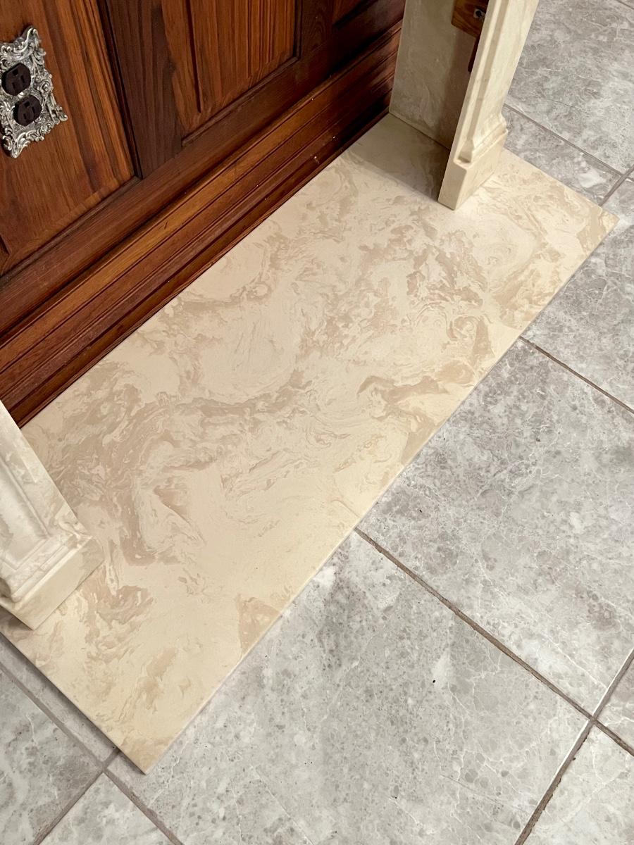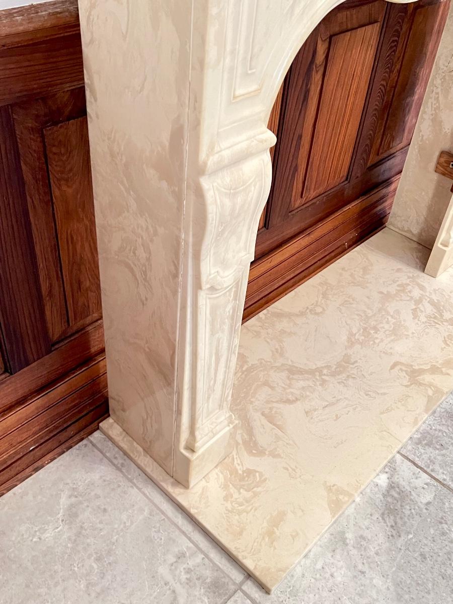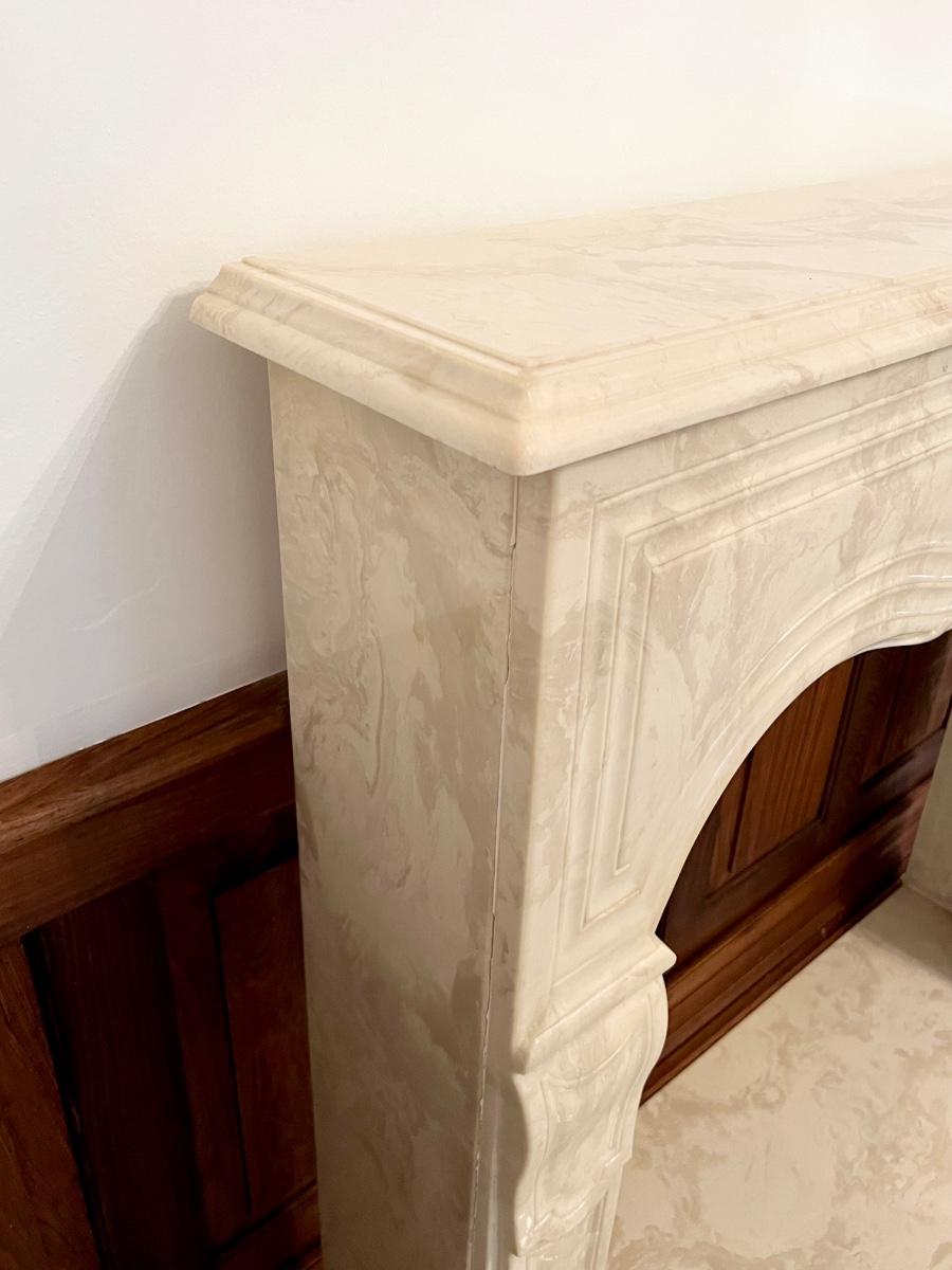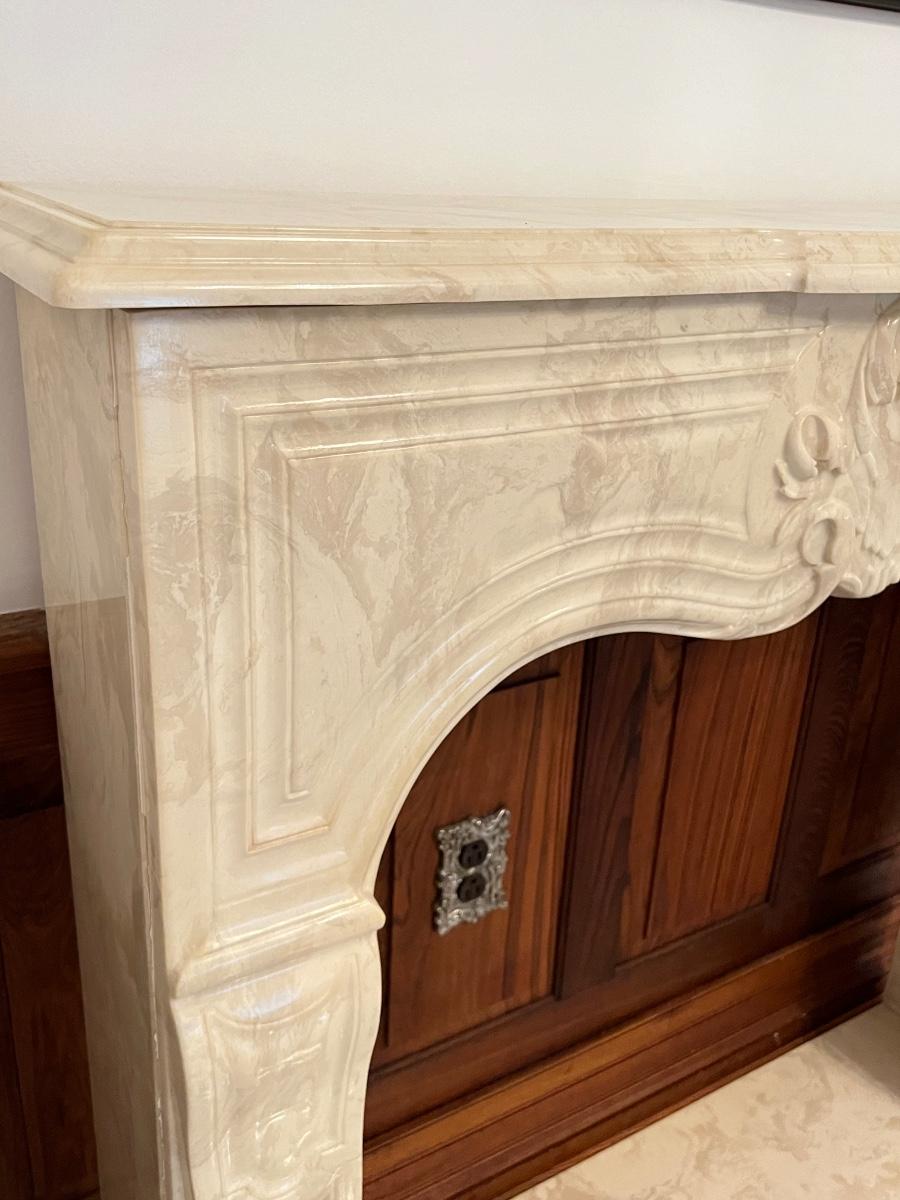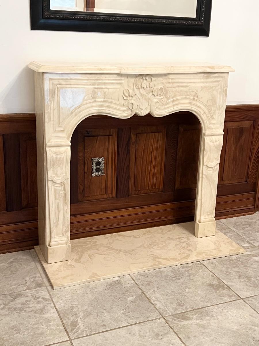 Heavy! ~ 3 pieces ~ Entirety = 44” H x 48” W x 19” D ~ Bottom slab = .75” H x 48” W x 19” D ~ Mantel opening = 31.5” H x 33.5” W ~ Mantel top piece = 11” D