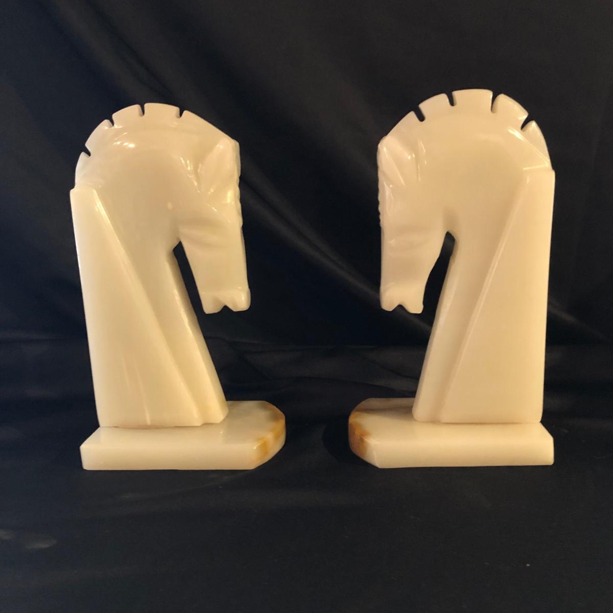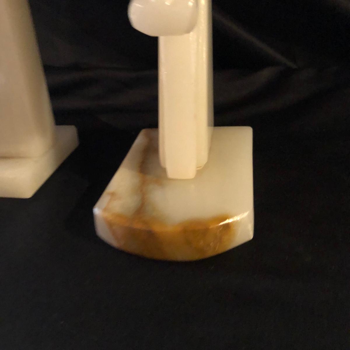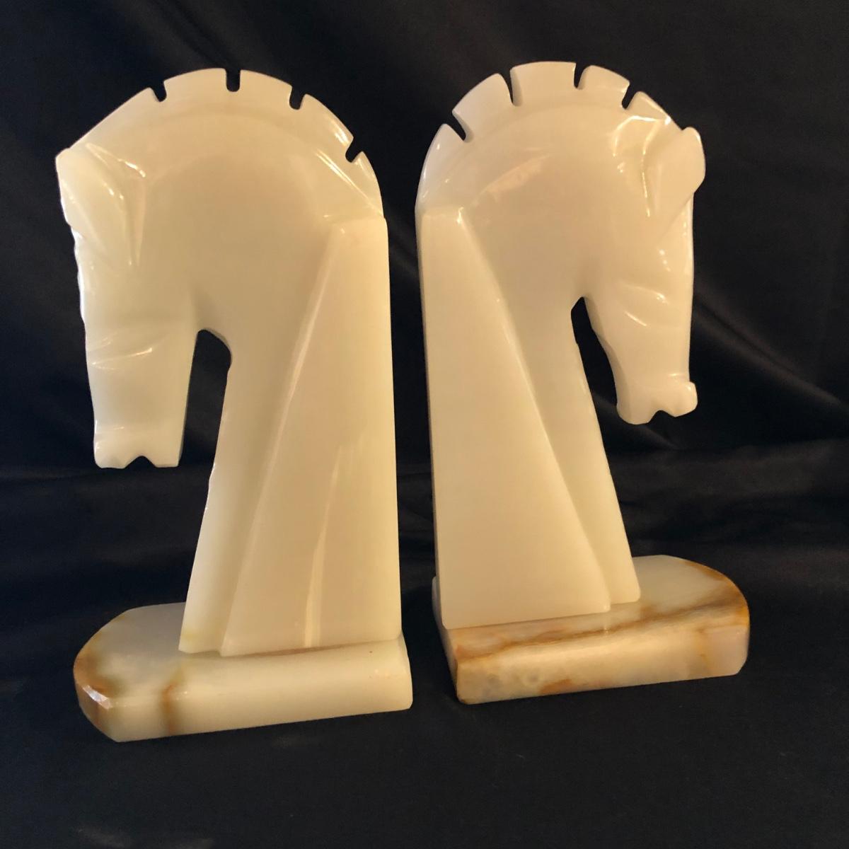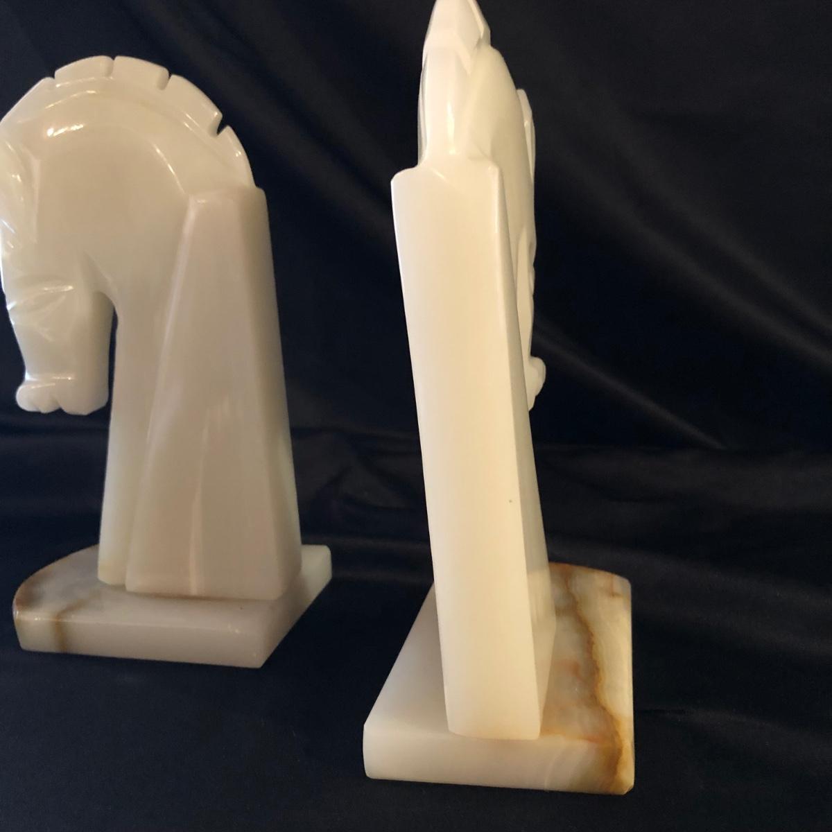 The marble bookends are brown and white marble. They measure 4.5” x 3” x 8”. Shipping Available.