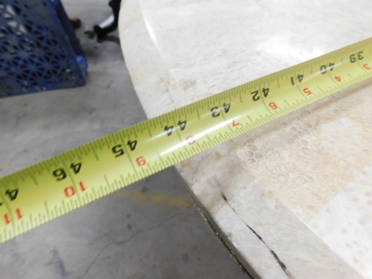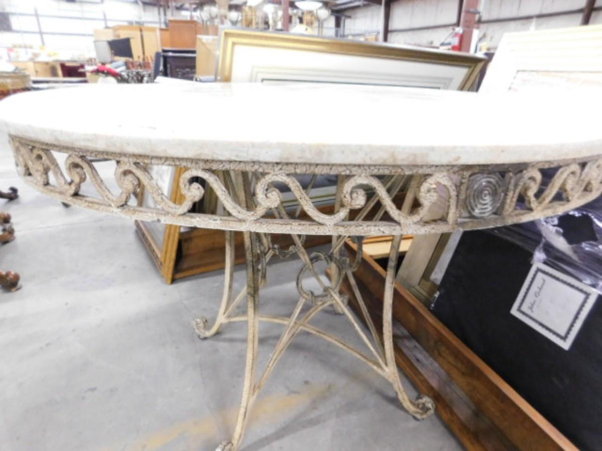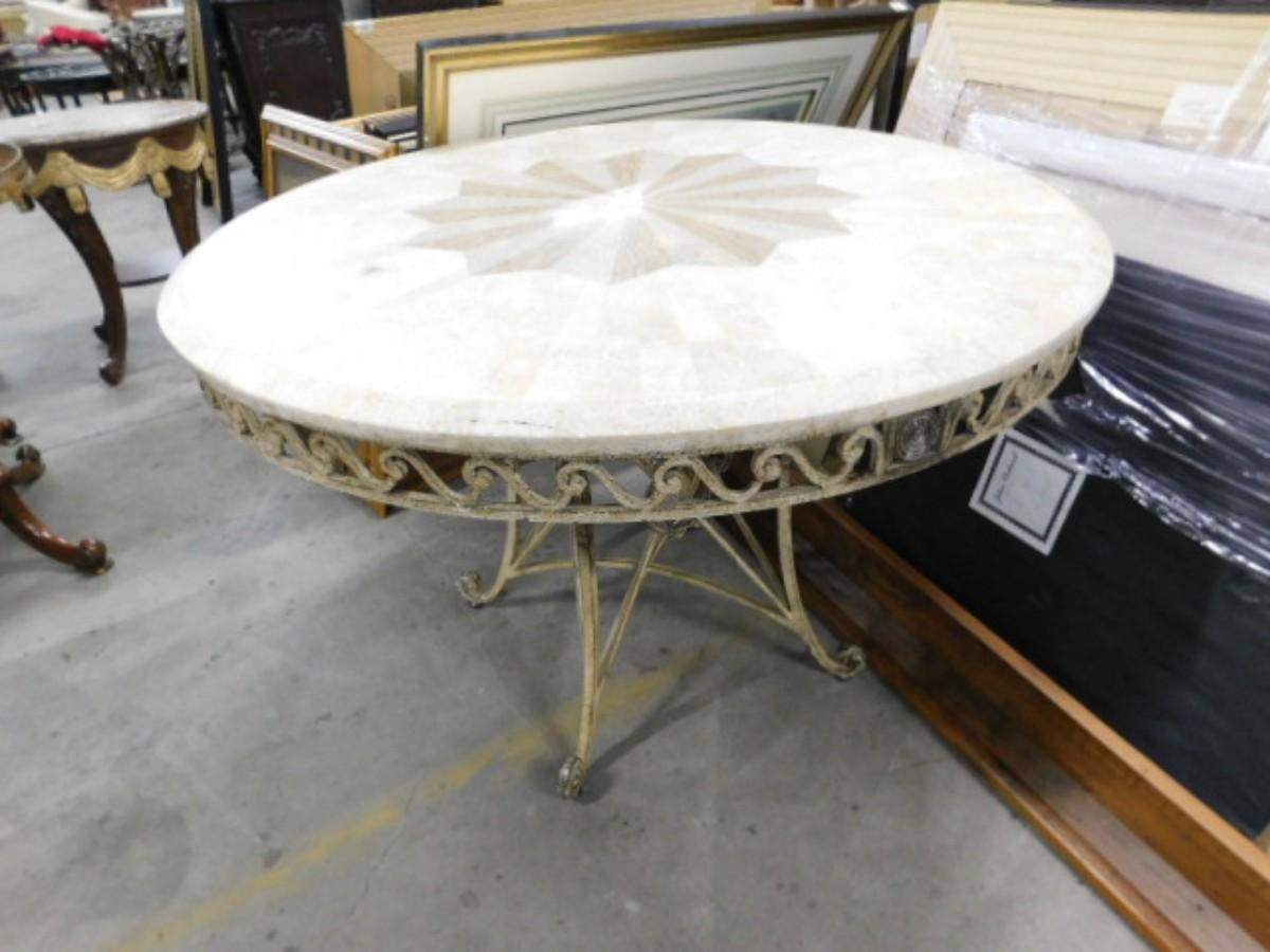 Marble Inlay 44" Table with Wrought Metal Regency Design Base Choice #1 of 2 Expect some wear or scratches to finish. Shipping option available via freight or local mover at Buyer's expense. Buyer must have all shipping scheduled within the stated dates and times of pickup. Recommended local mover is Beaty Bros. Moving 828-201-2982