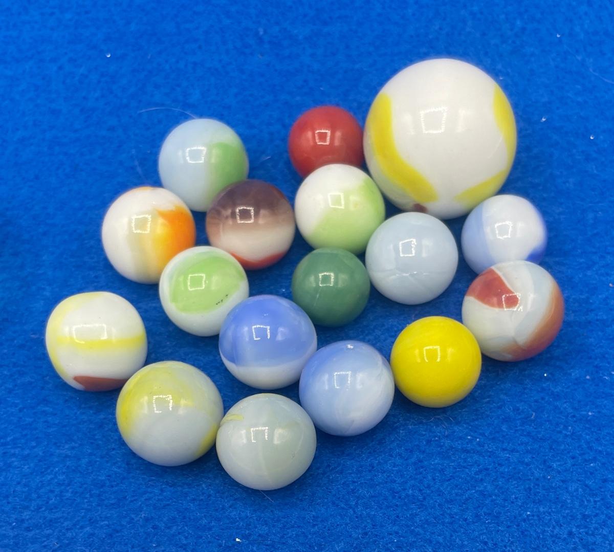 Vintage Glass Cat Eyes Marbles 59 Marbles Random Mix Lot (3 large and 56 small) and 17 Vintage Agate Marbles (1 large and 16 small). Appear to be in good condition,