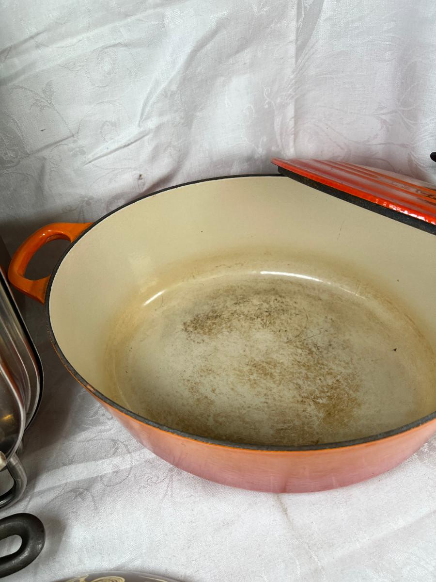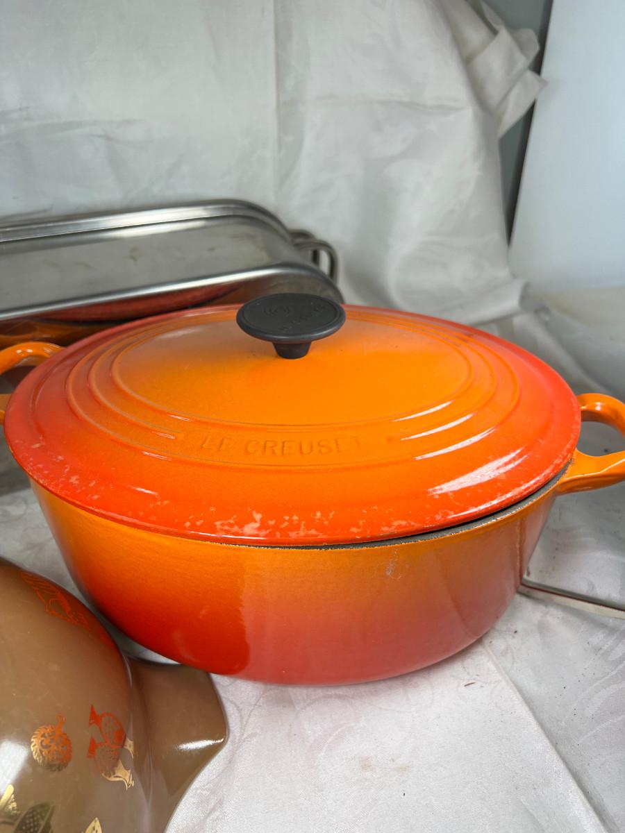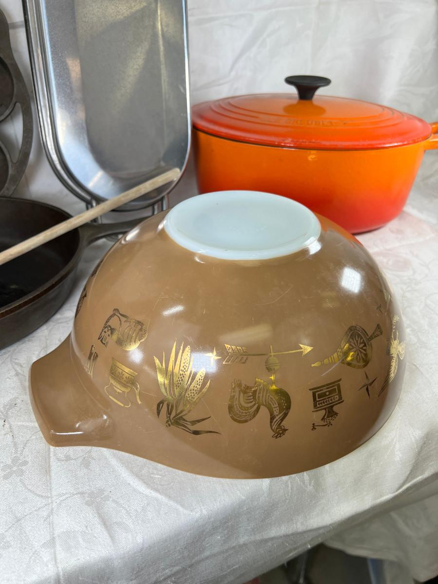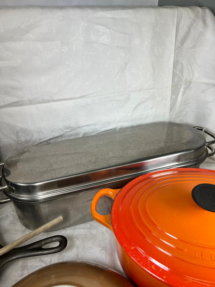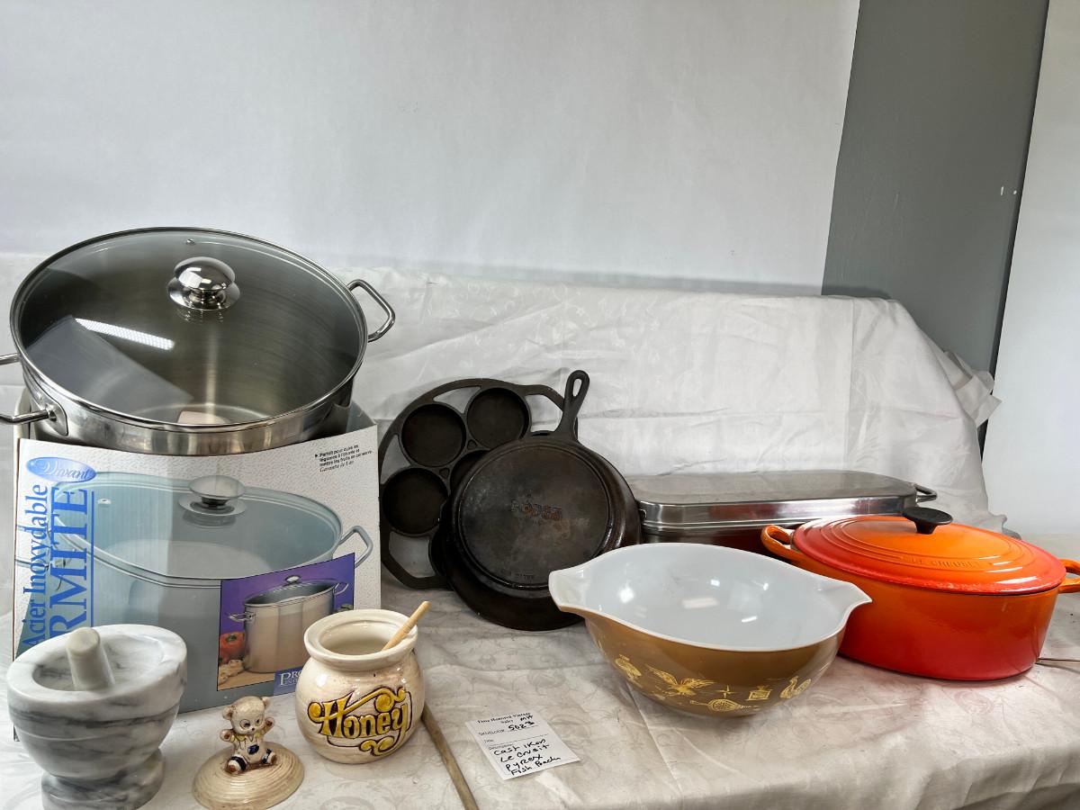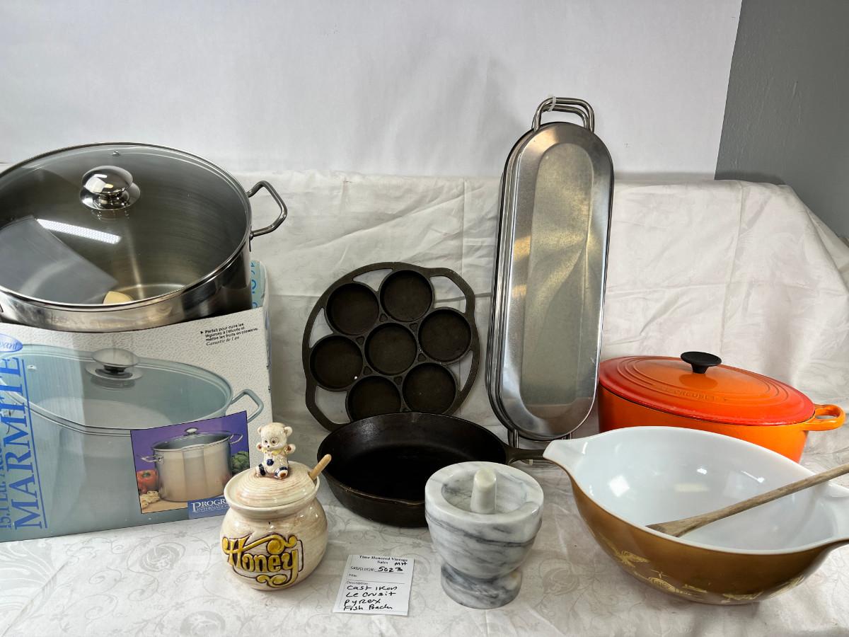Marble Motor and pestal, Fish poacher, Le Creuset Signature 5.5 Qt. Round Dutch Oven #26 Flame Orange Gold Pyrex bowl with some wear , 2 cast iron Loge pots, Large new stainless pot, Vintage 1960 honey pot in great condition.