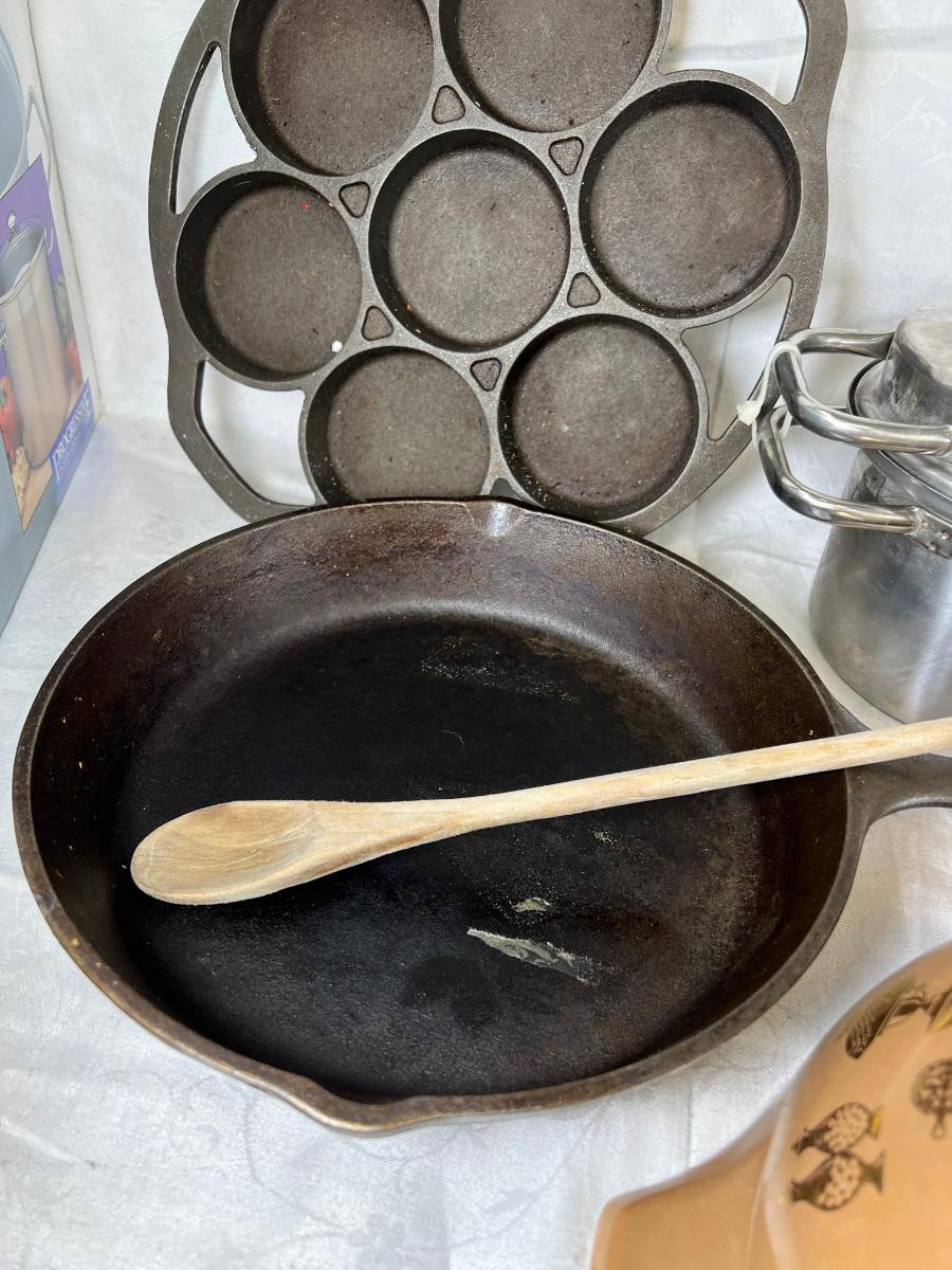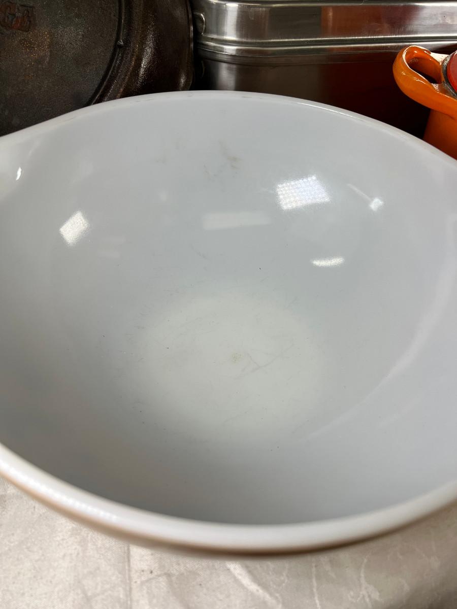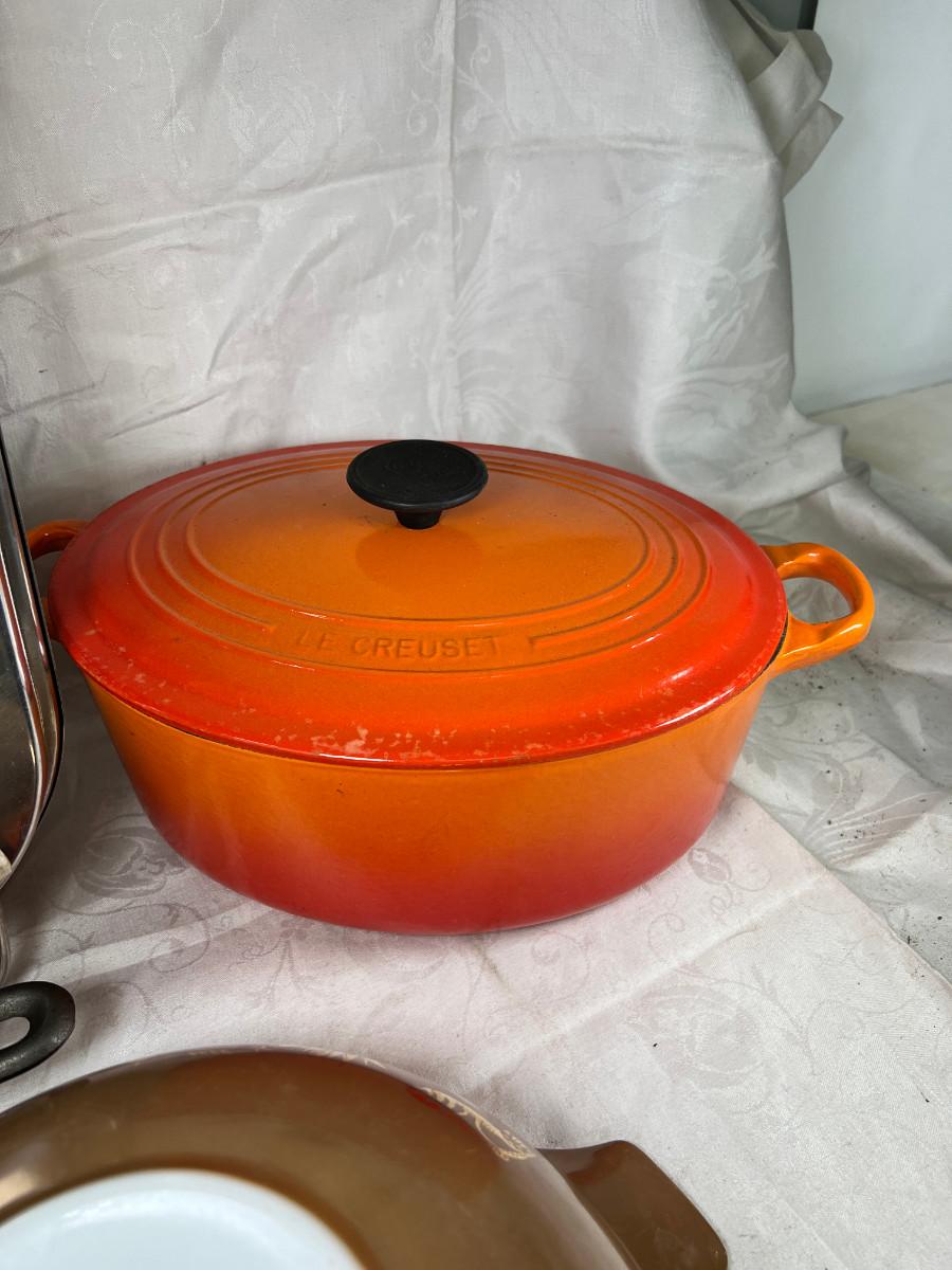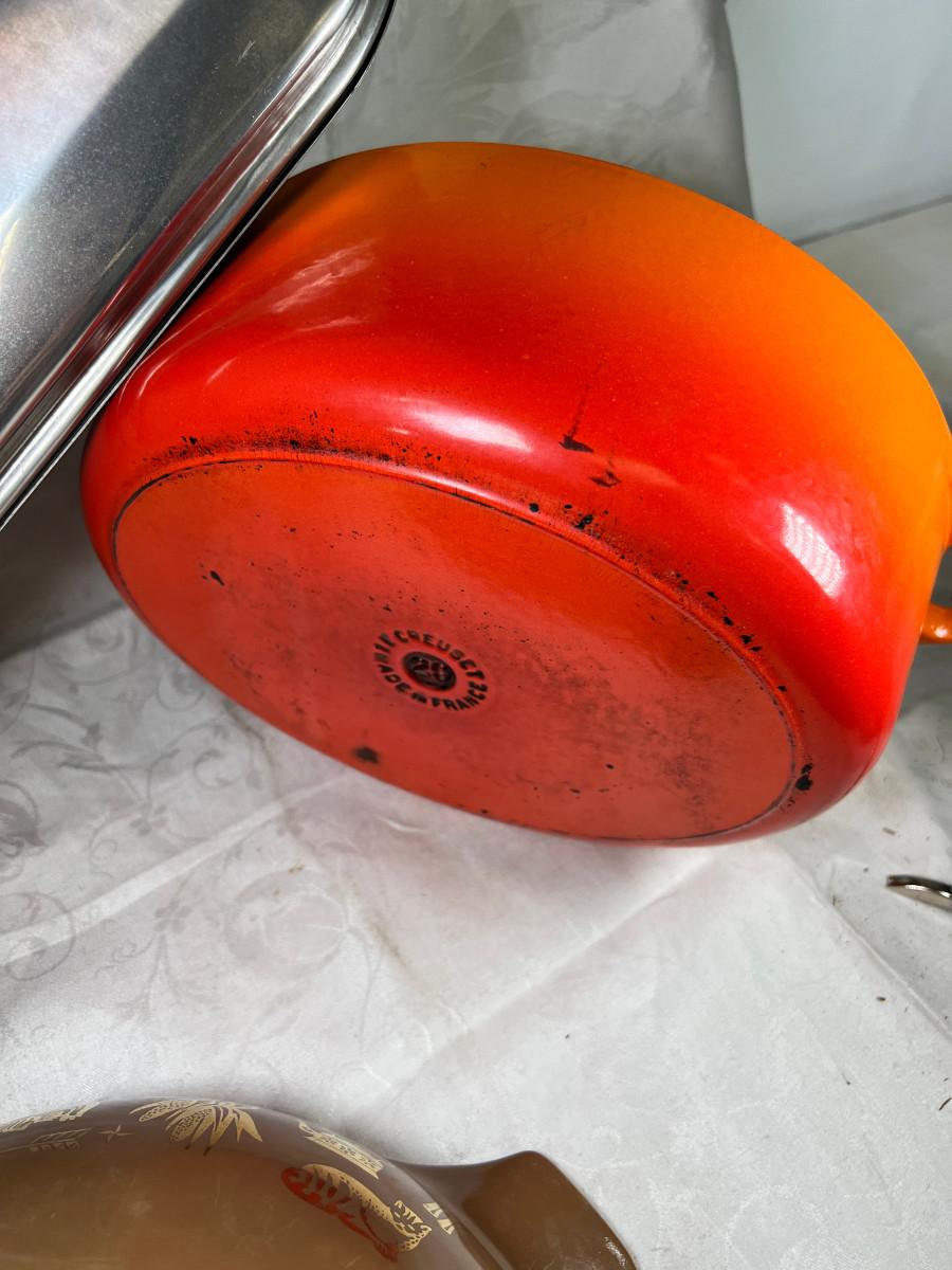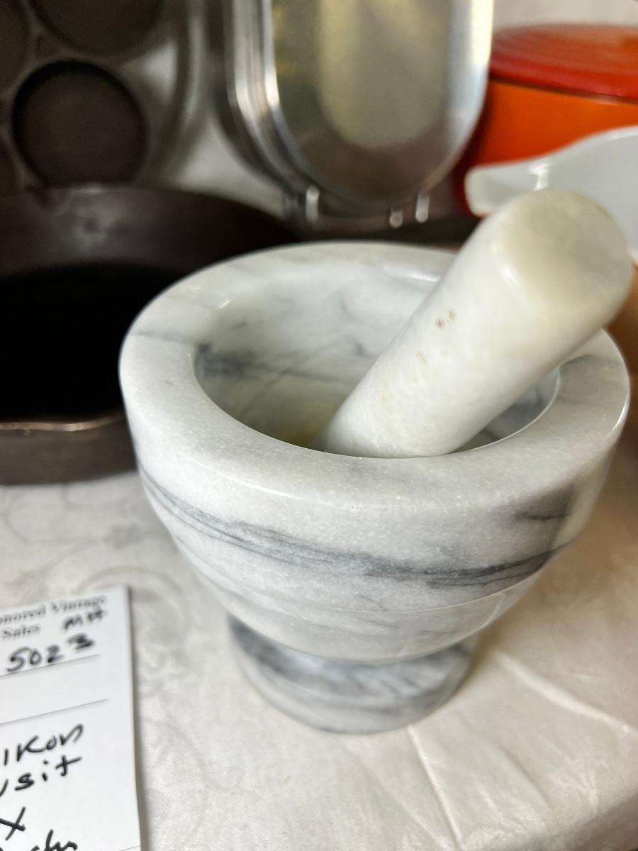 Marble Motor and pestal, Fish poacher, Le Creuset Signature 5.5 Qt. Round Dutch Oven #26 Flame Orange Gold Pyrex bowl with some wear , 2 cast iron Loge pots, Large new stainless pot, Vintage 1960 honey pot in great condition.