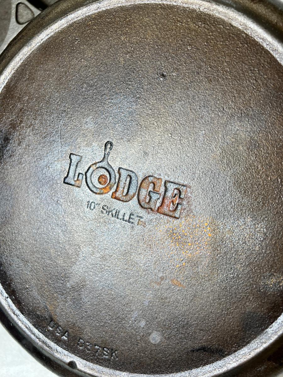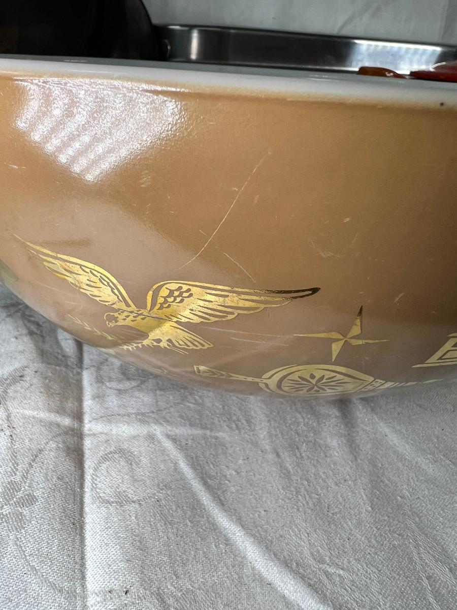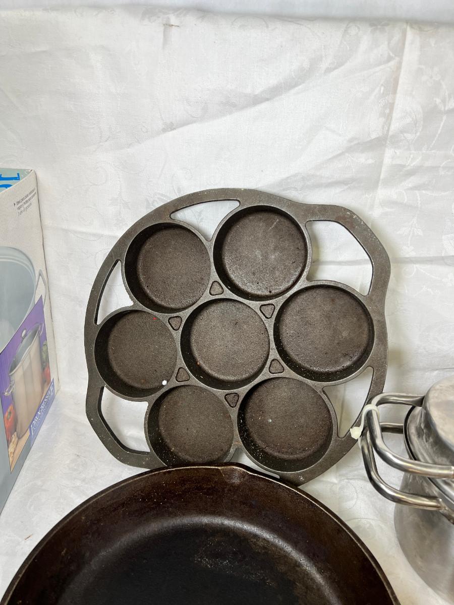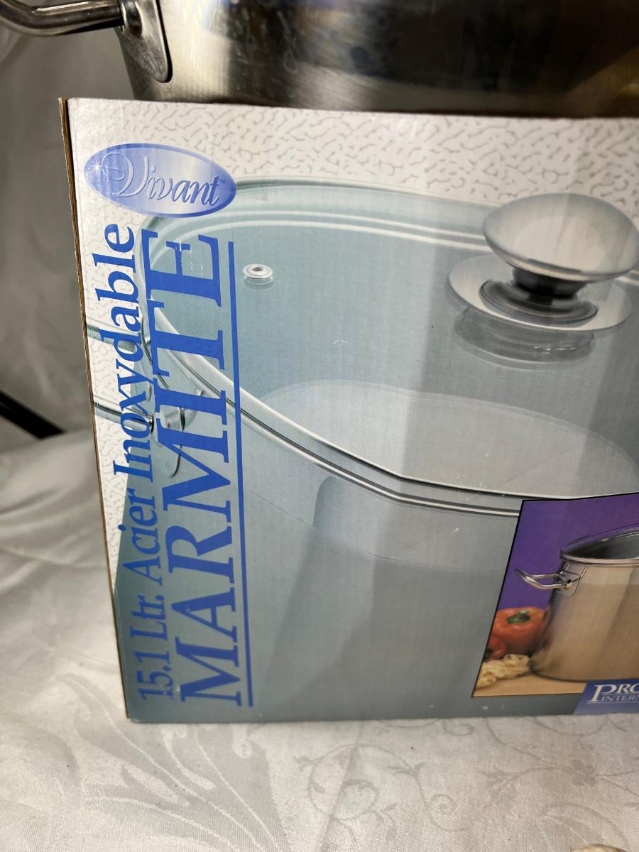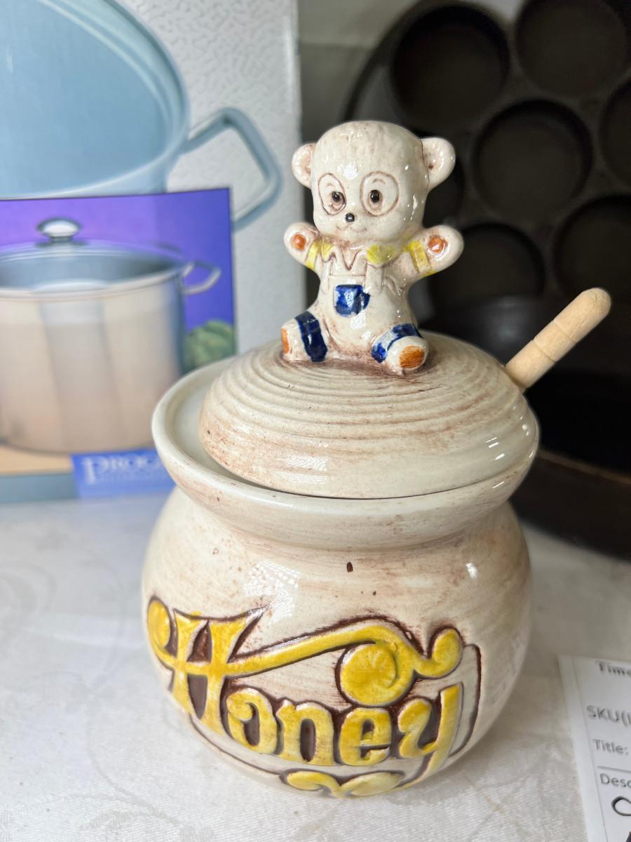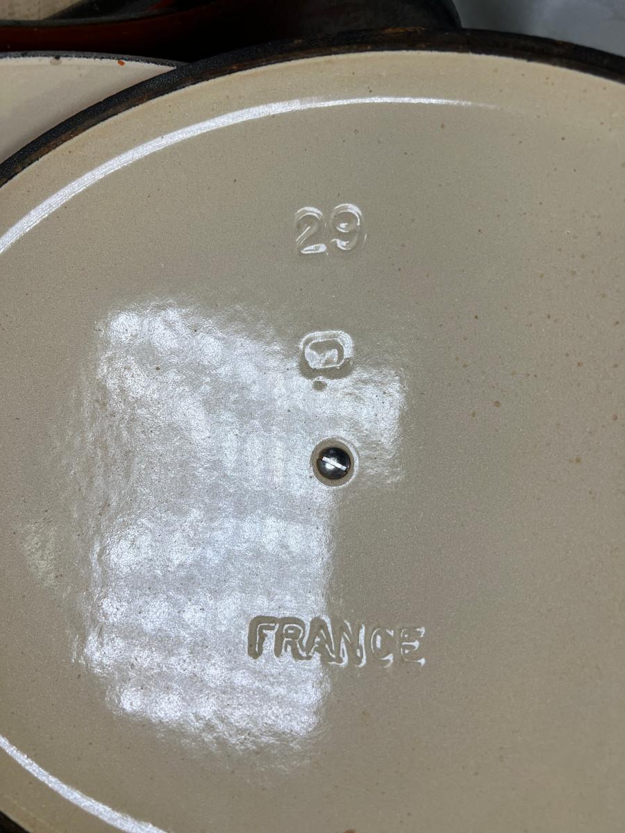 Marble Motor and pestal, Fish poacher, Le Creuset Signature 5.5 Qt. Round Dutch Oven #26 Flame Orange Gold Pyrex bowl with some wear , 2 cast iron Loge pots, Large new stainless pot, Vintage 1960 honey pot in great condition.