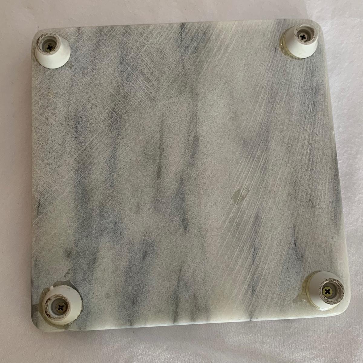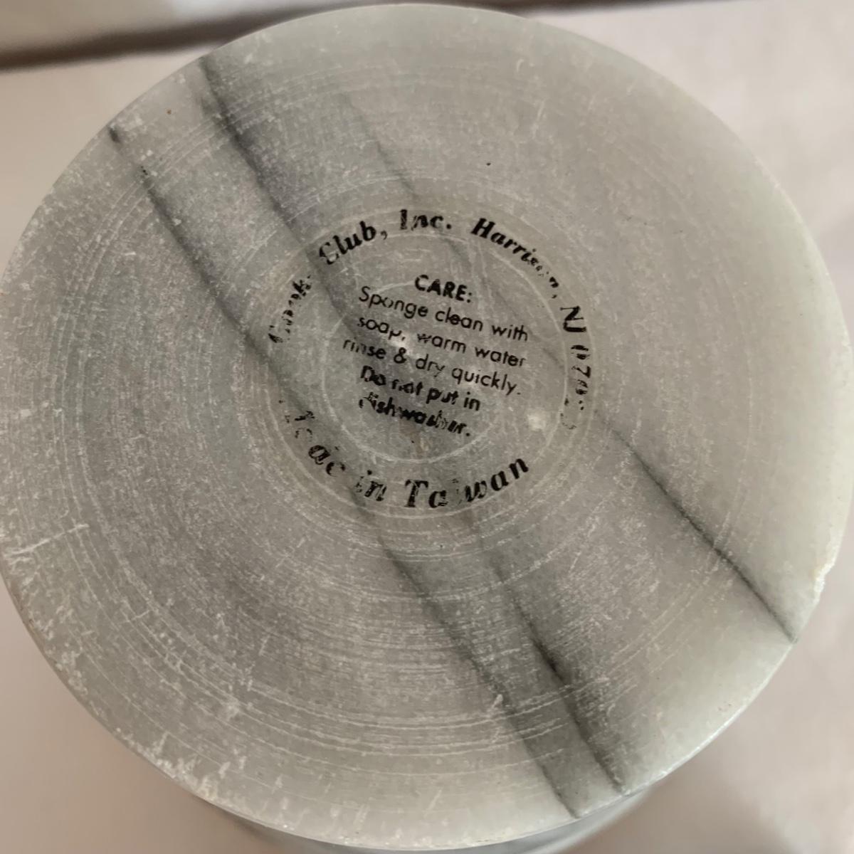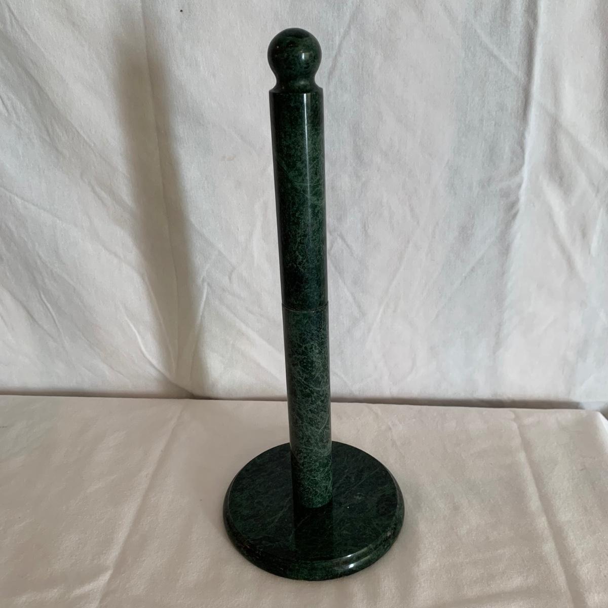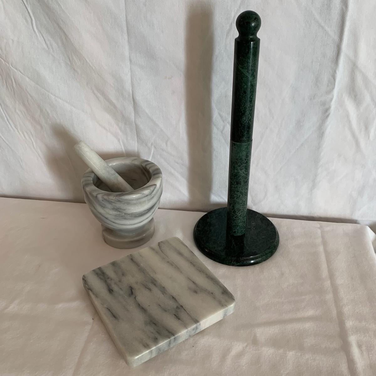 Three marble kitchen accessories, includes a green paper towel holder, and a white and gray mortar & pestle and trivet. For reference, the trivet measures 6”sq.