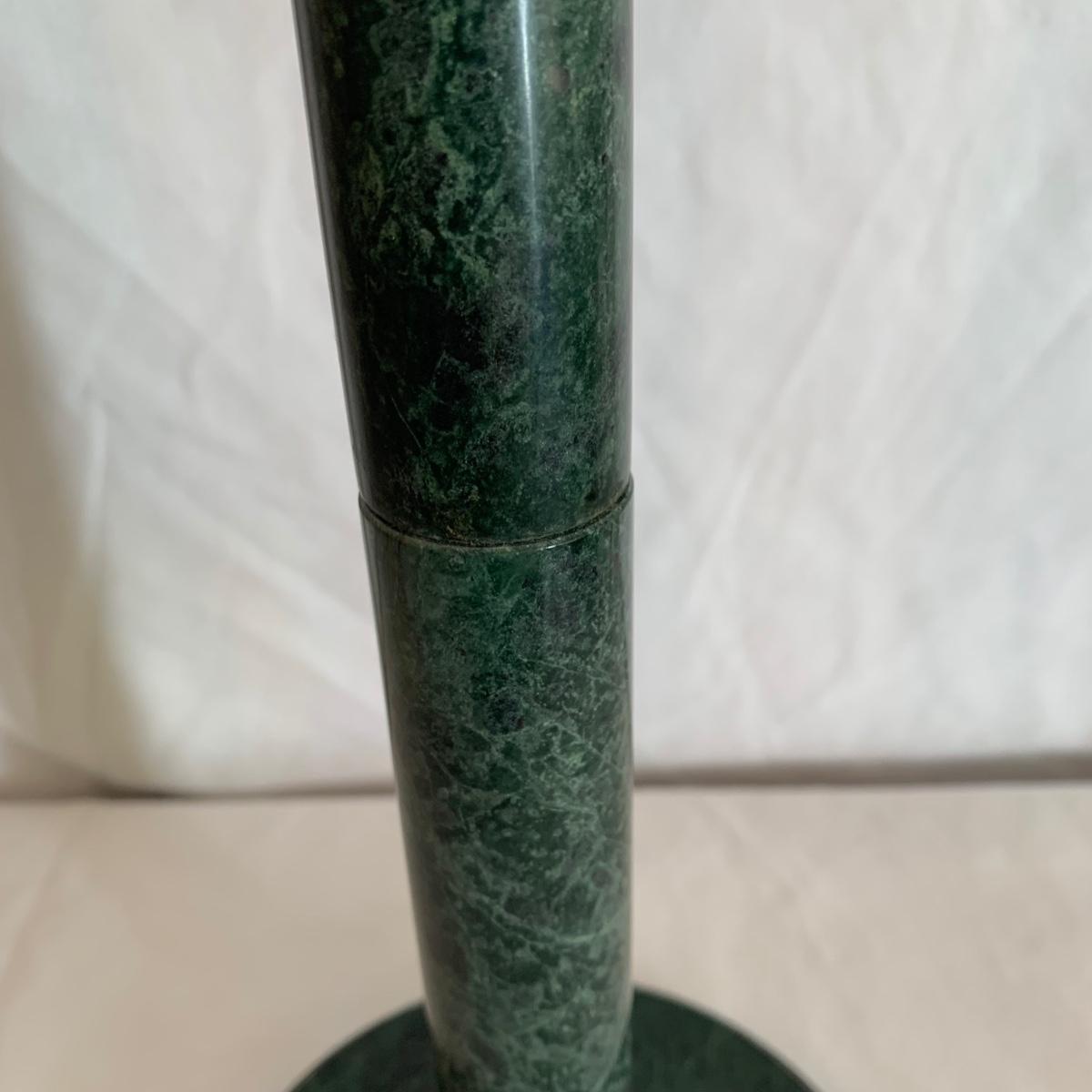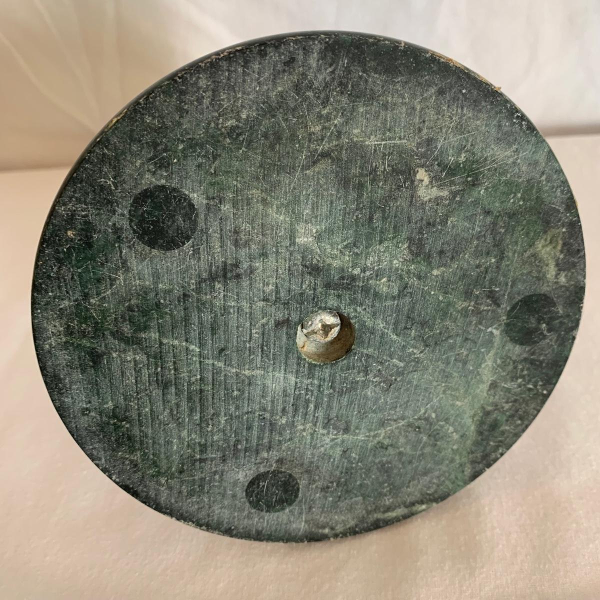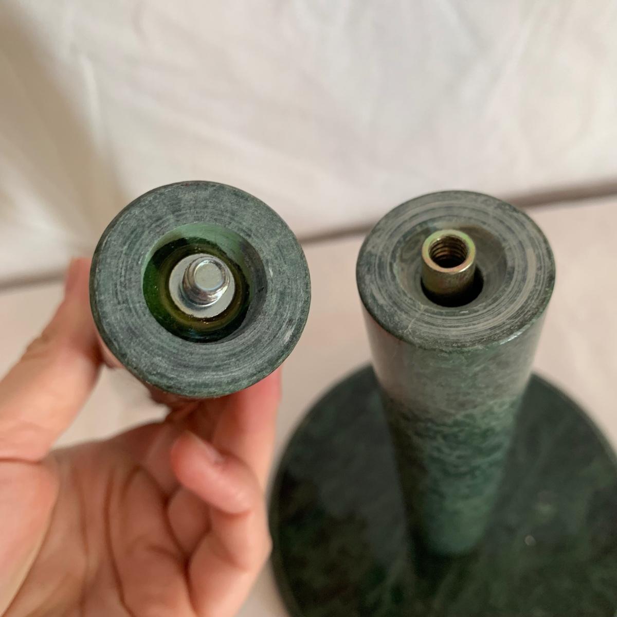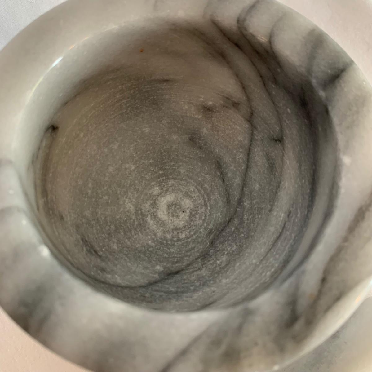 Three marble kitchen accessories, includes a green paper towel holder, and a white and gray mortar & pestle and trivet. For reference, the trivet measures 6”sq.