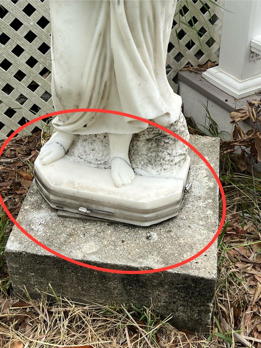 Extremely heavy!! Do not come alone to pickup, we cannot help ~ Is cracked at bottom, see photos. Will have to handle with care when picking her up ~ Does not include cement block she’s on ~ 40” H x 13” W x 10” D