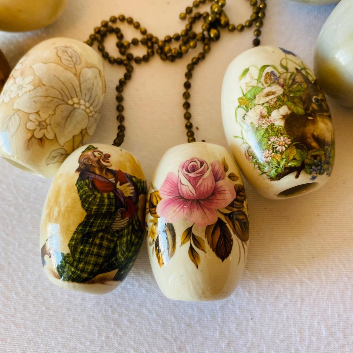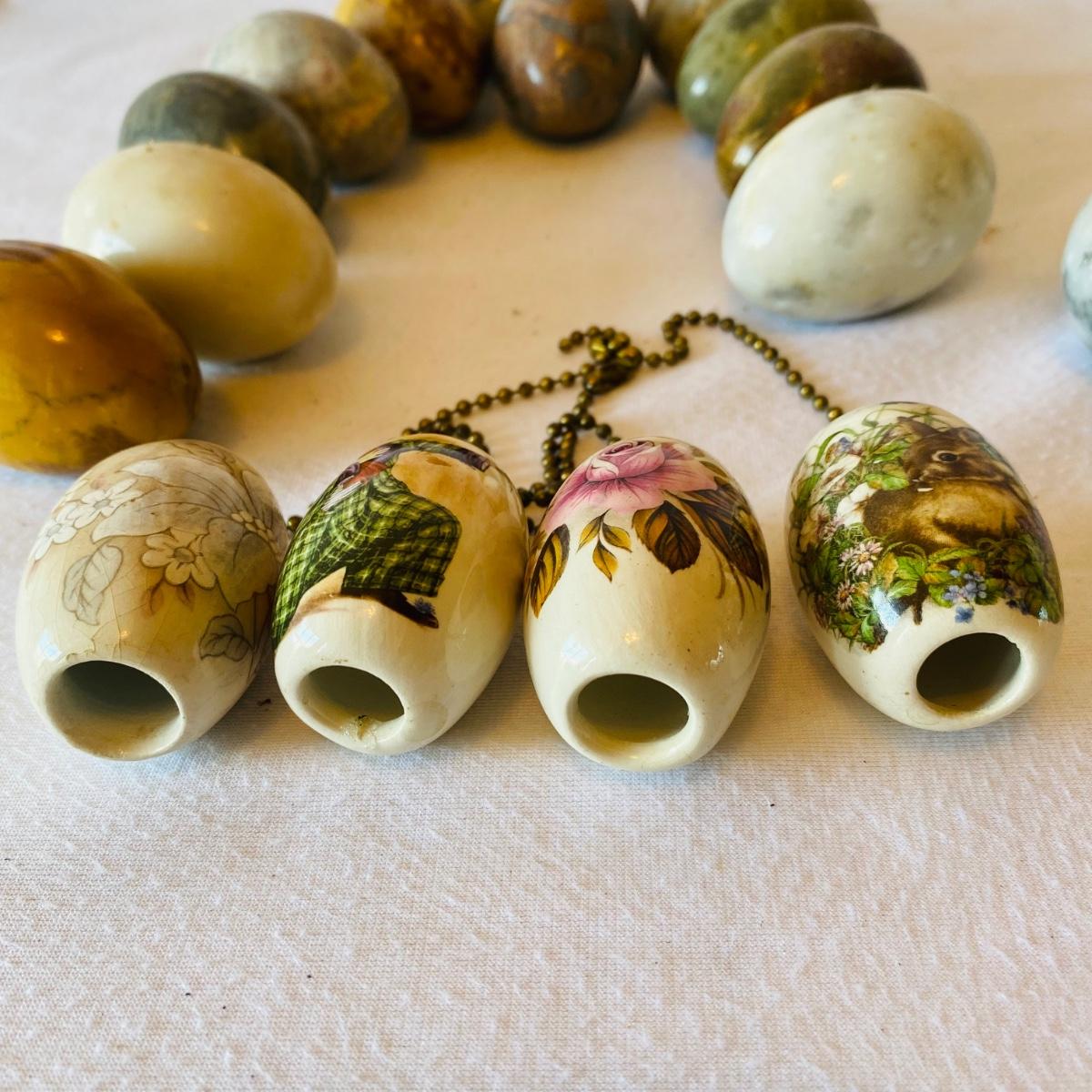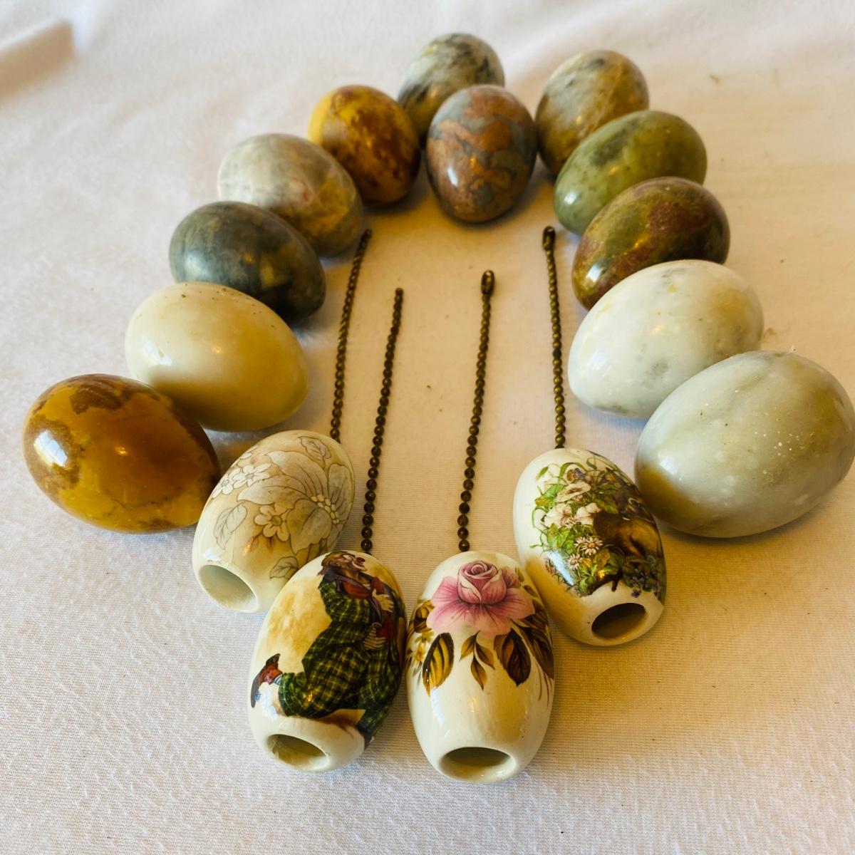 Collection includes twelve marble stone eggs and four ceramic fan pulls. Eggs measure approximately 2”. 2 fan pulls have beautiful floral design, 1 has clown, and 1 with bunny in grass and flowers. They measure 2”H. Cords measure 5.5”L.