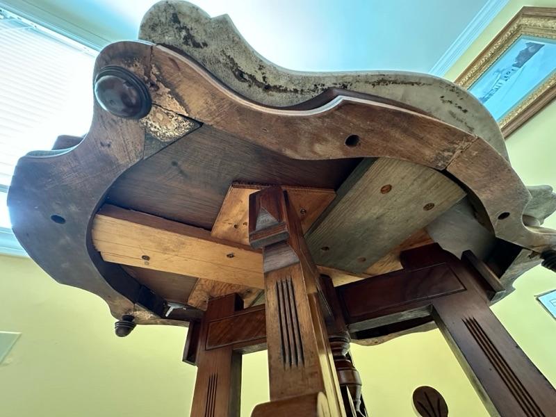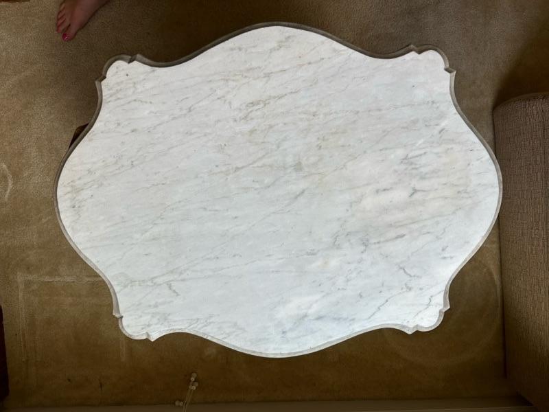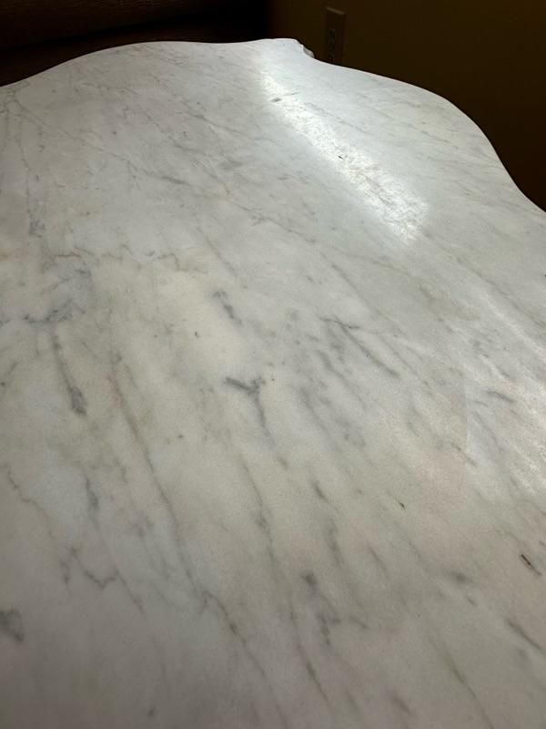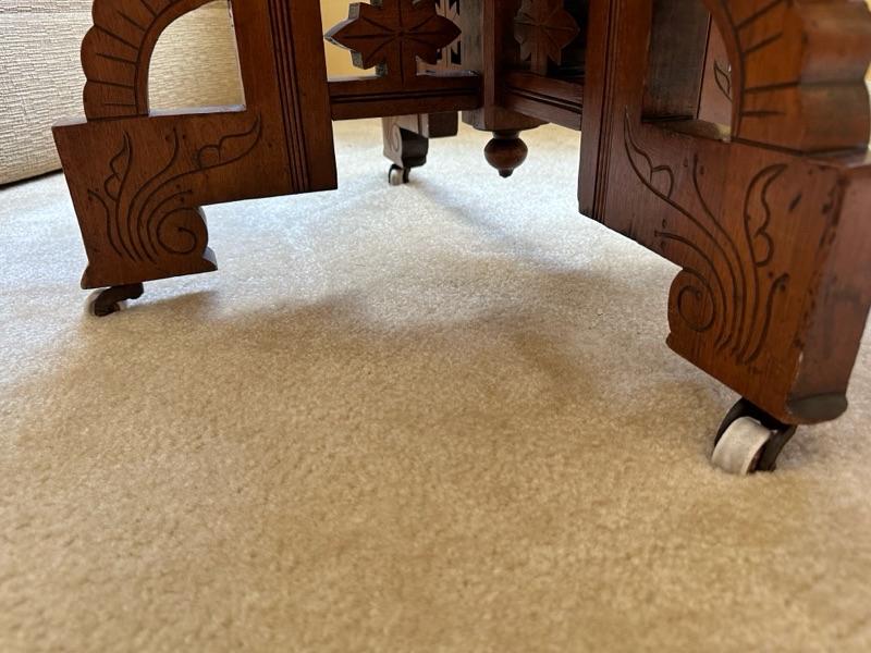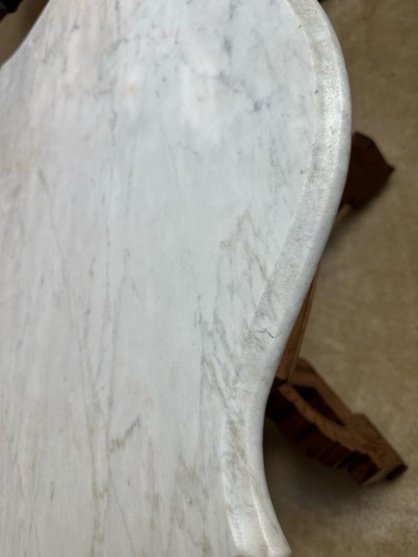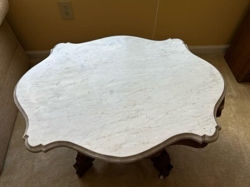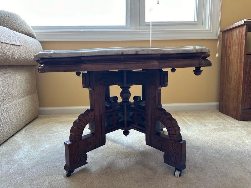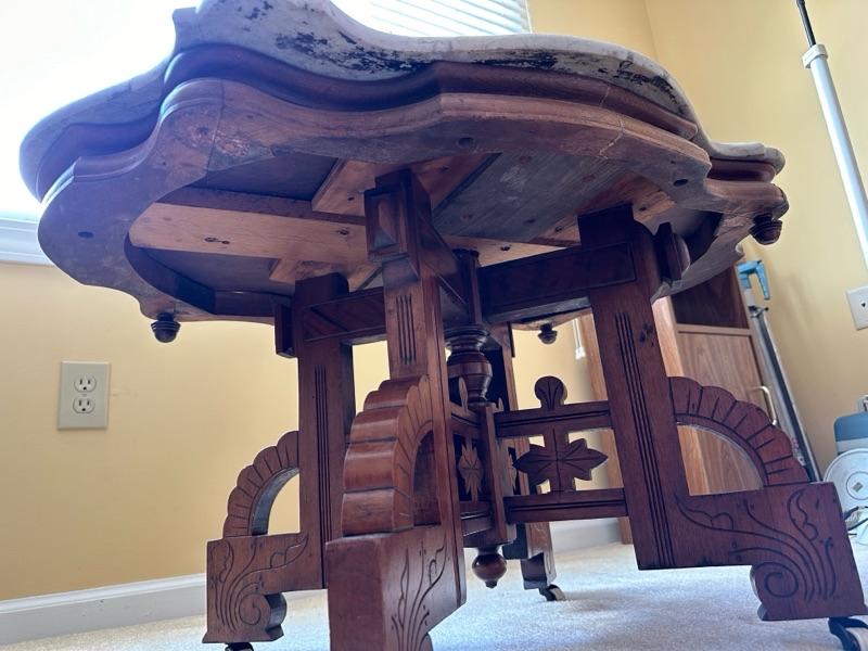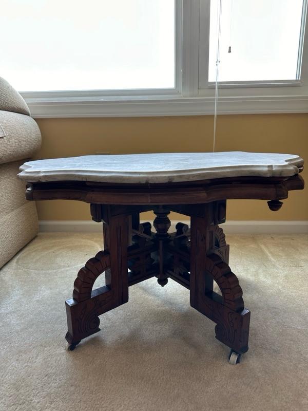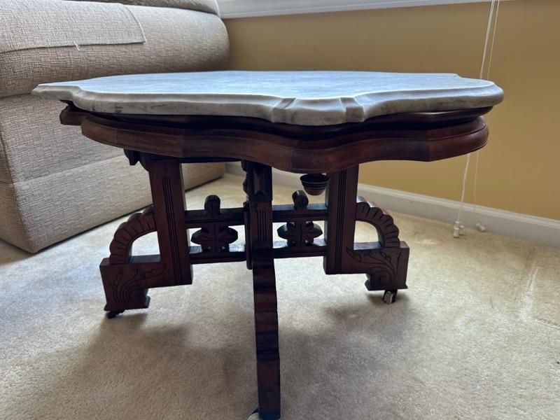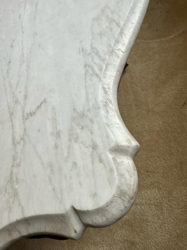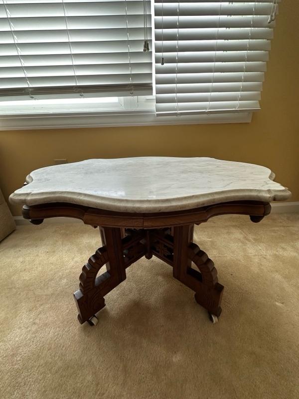 Victorian Style Marble Table with Stunning Carved Detailing / The tables has small wheels on the bottom of each foot and it does roll.