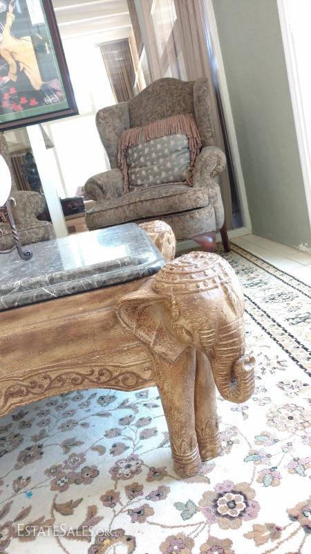 Exceptional elephant head table with a thick piece of marble, modern, good quality. 42 inches square and 18 inches tall. Excellent condition.