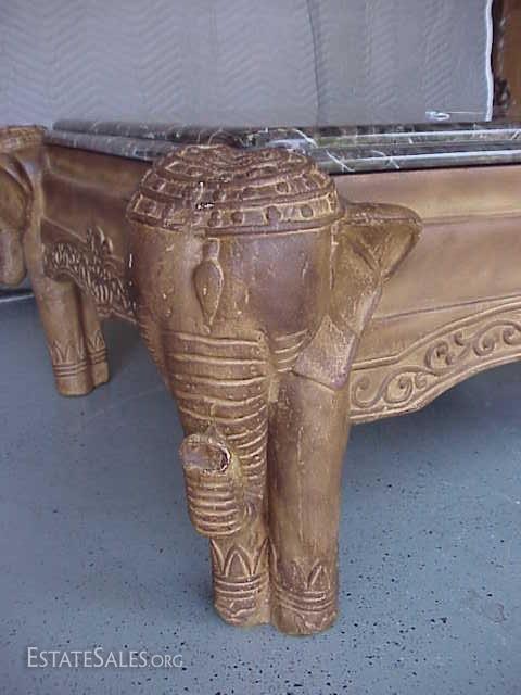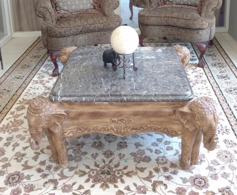Exceptional elephant head table with a thick piece of marble, modern, good quality. 42 inches square and 18 inches tall. Excellent condition.