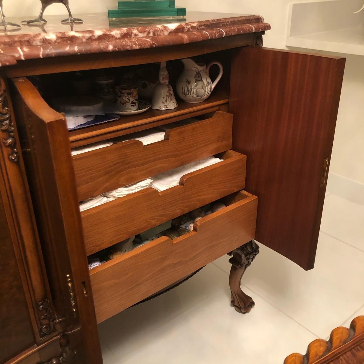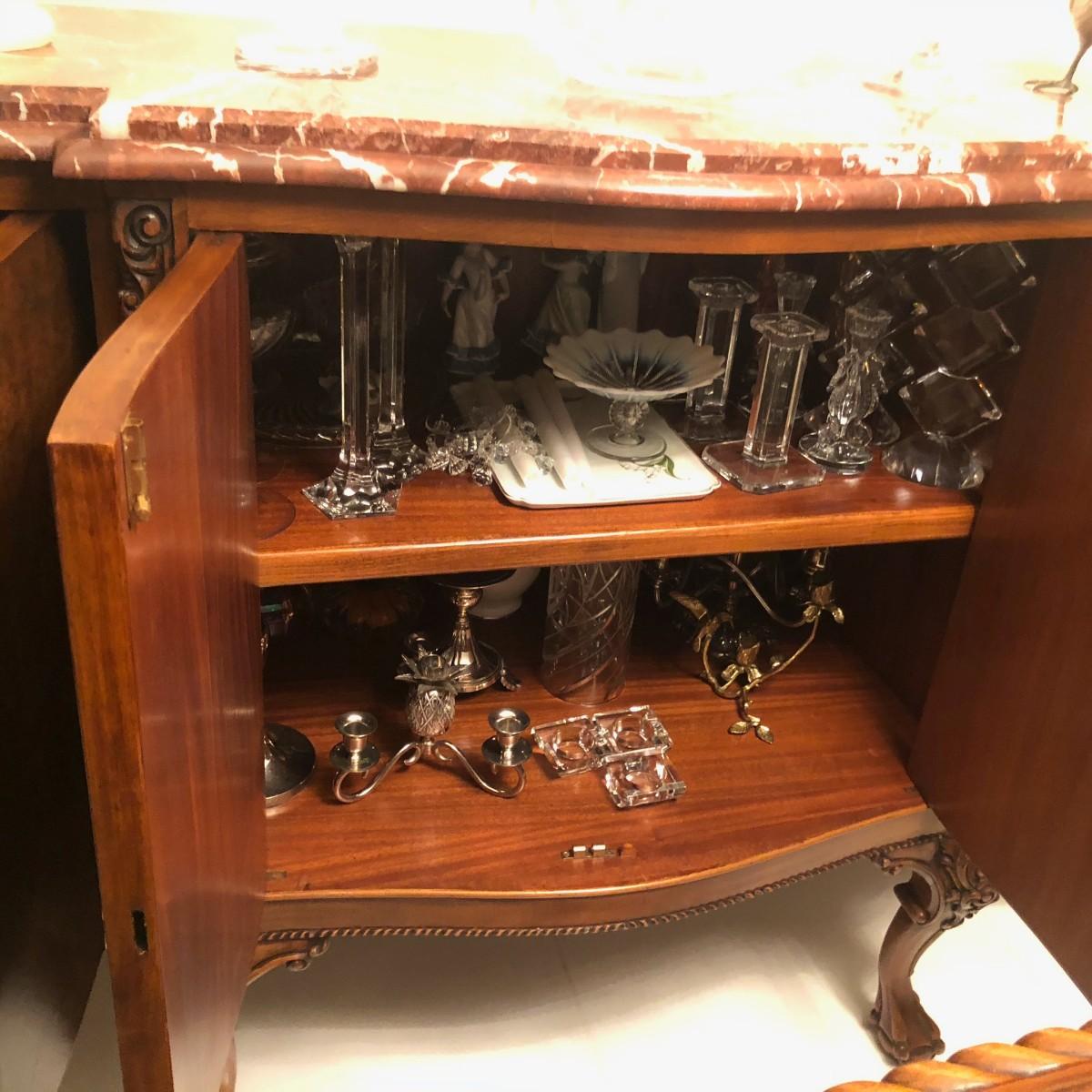 Custom made buffet cabinet / sideboard with plenty of room to store all your linens, china and fine goods. Solid Italian Cherrywood topped with Rojo Bilbao marble and carved wood details throughout. Has cabinets with shelves on either side and three drawers in the middle. Measures 92" wide, 23" deep and 42.5" tall.