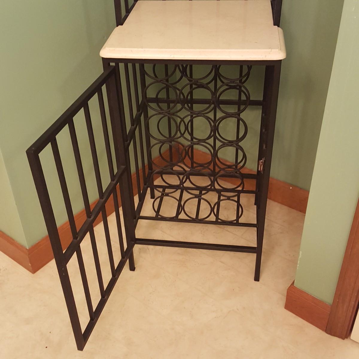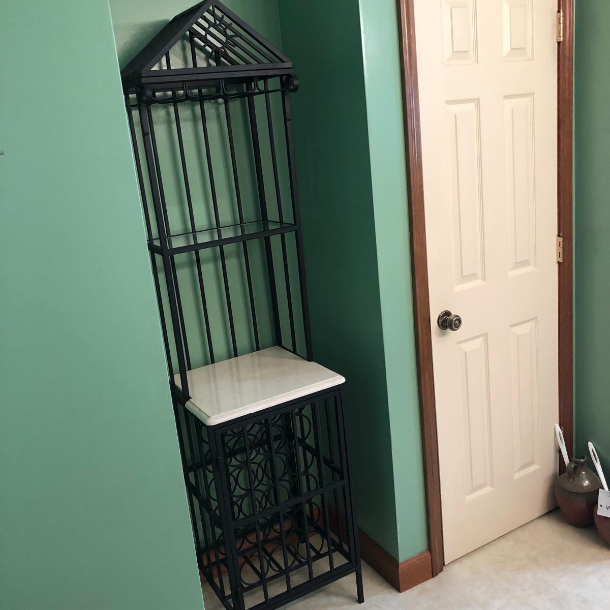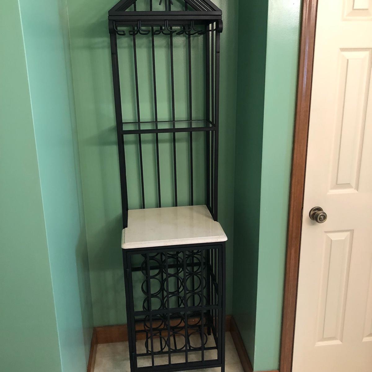 This tall metal wine rack (18.5” x 17.5” x 77”.) features a marble like shelf and stands 32 inches from the floor. There is also a glass shelf measuring 9 inches x 16 inches. The rack can hold 24 bottles and also has 3 racks for hanging glasses. Local pick up only.