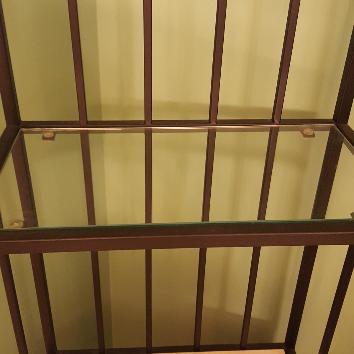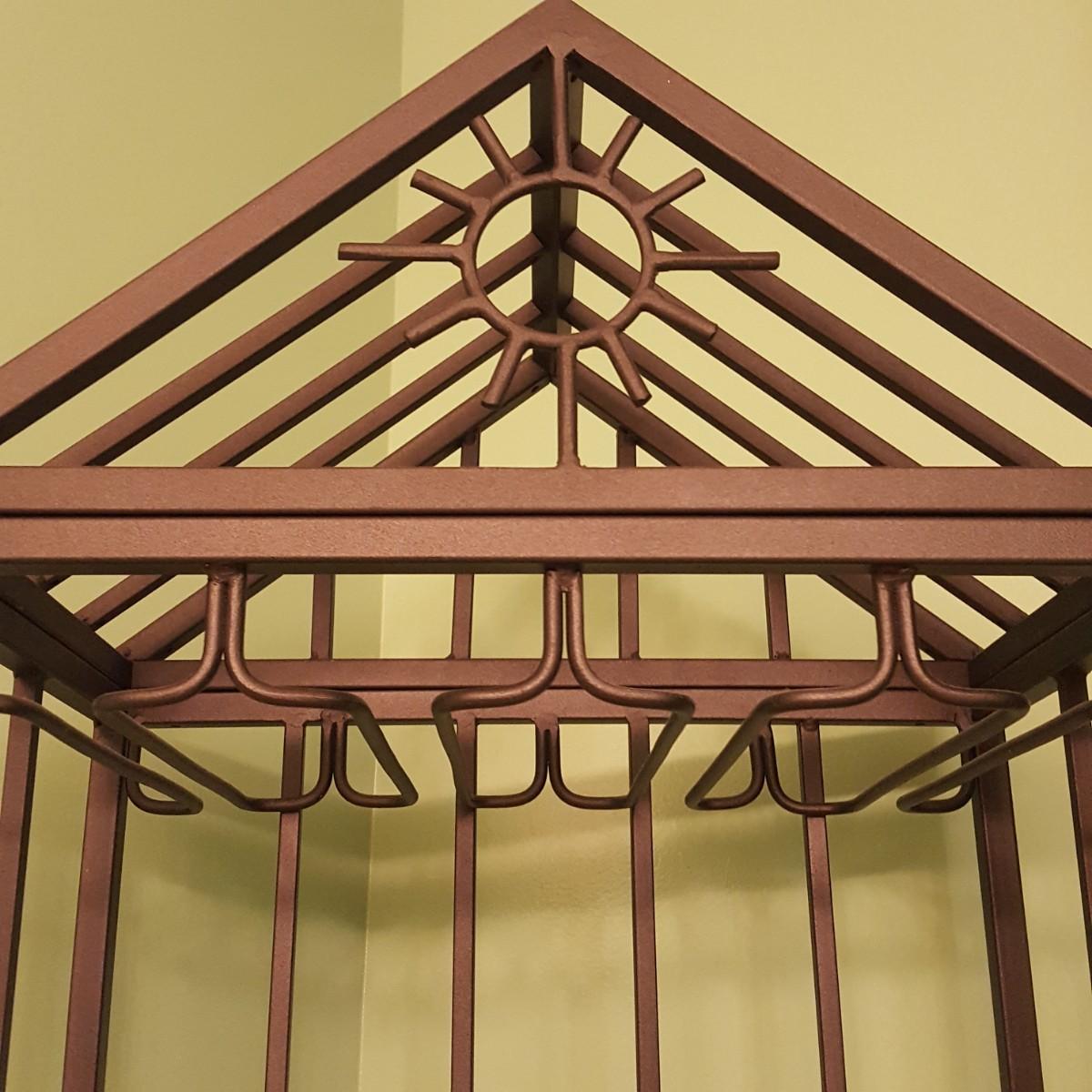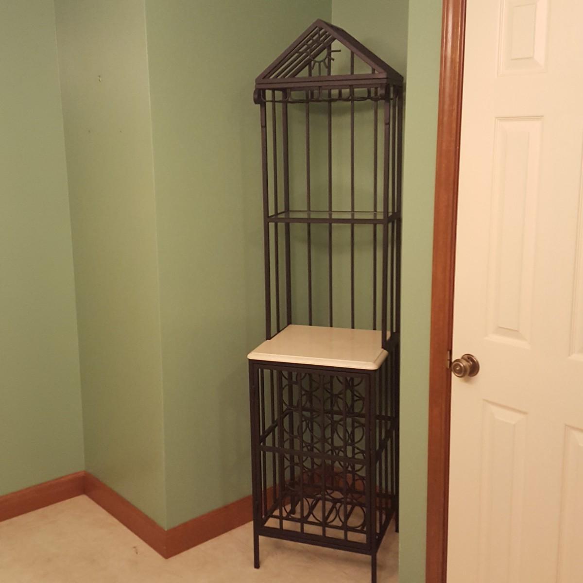 This tall metal wine rack (18.5” x 17.5” x 77”.) features a marble like shelf and stands 32 inches from the floor. There is also a glass shelf measuring 9 inches x 16 inches. The rack can hold 24 bottles and also has 3 racks for hanging glasses. Local pick up only.
