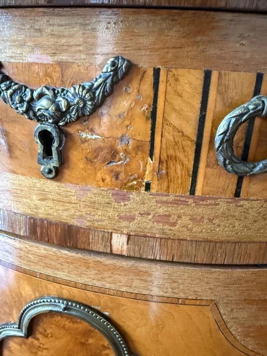 “Antique condition with some marks and dings in the wood. One area on the front looks like maybe it was repaired.