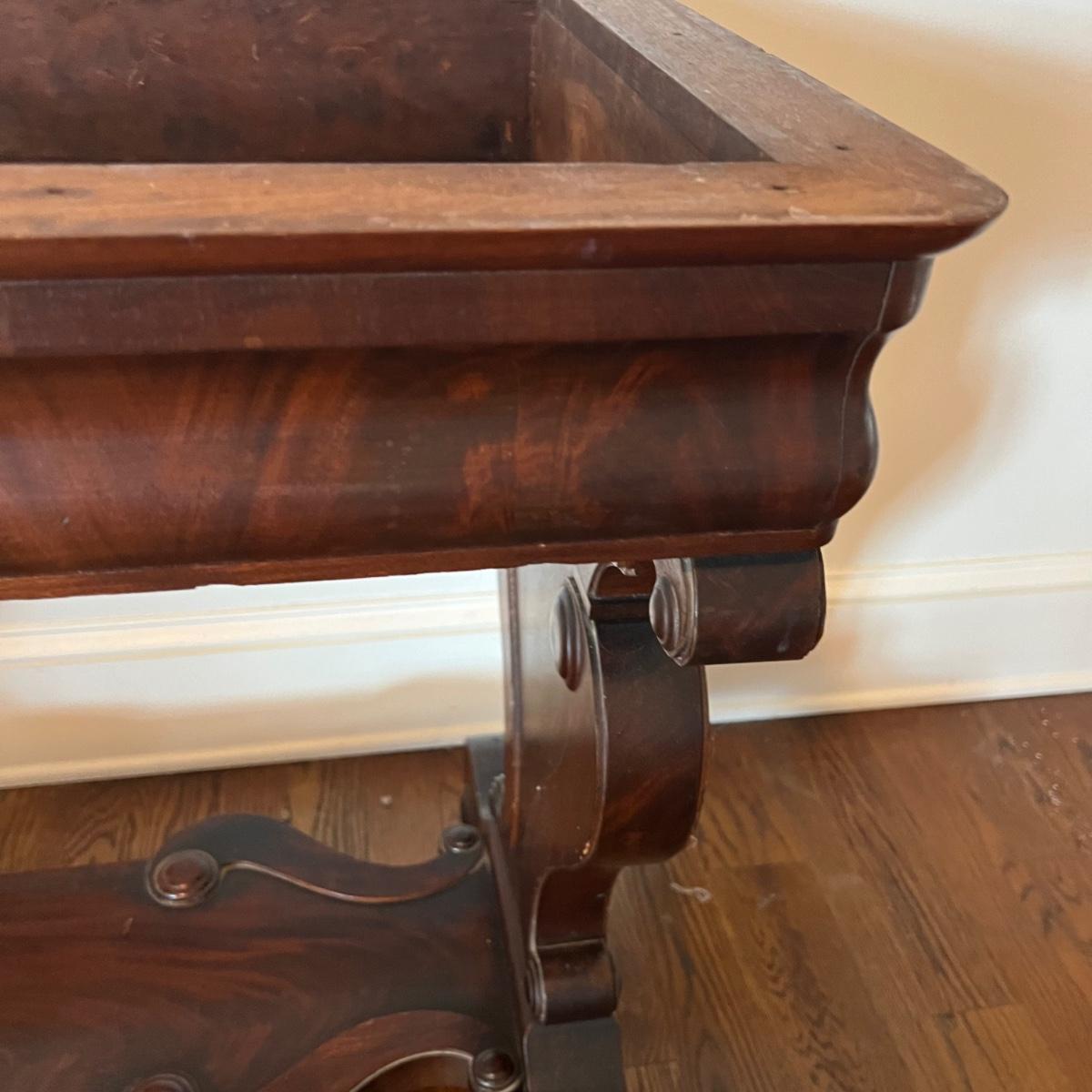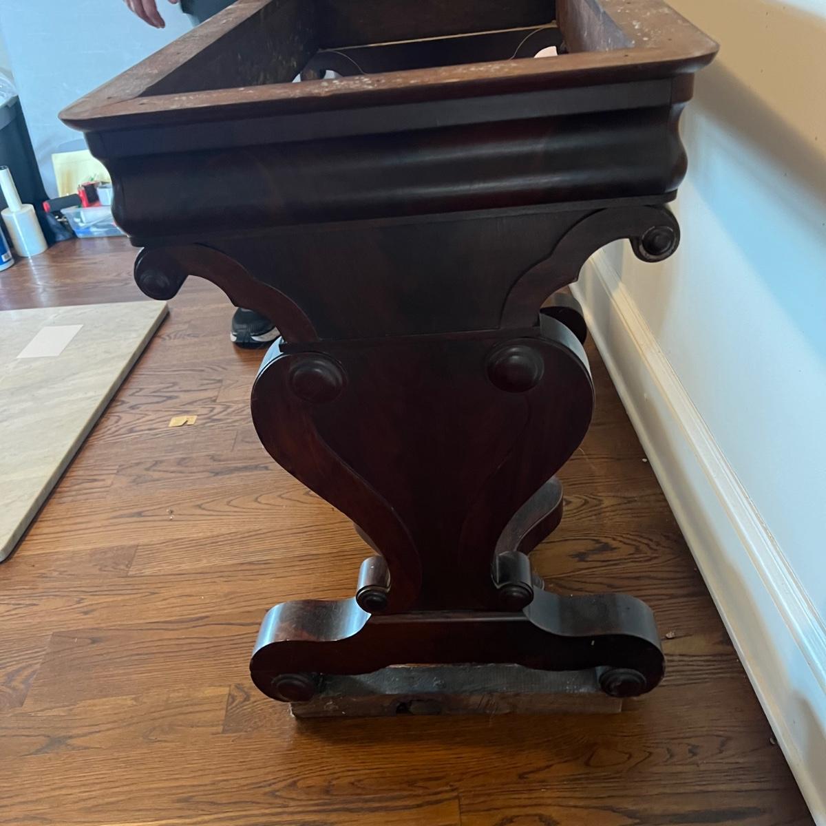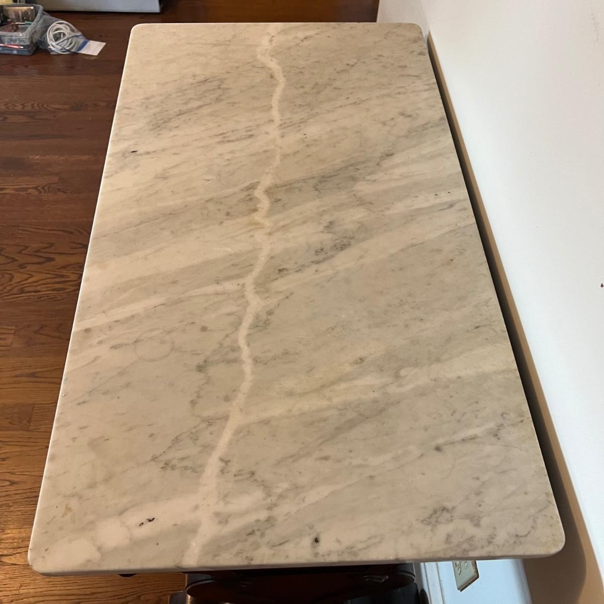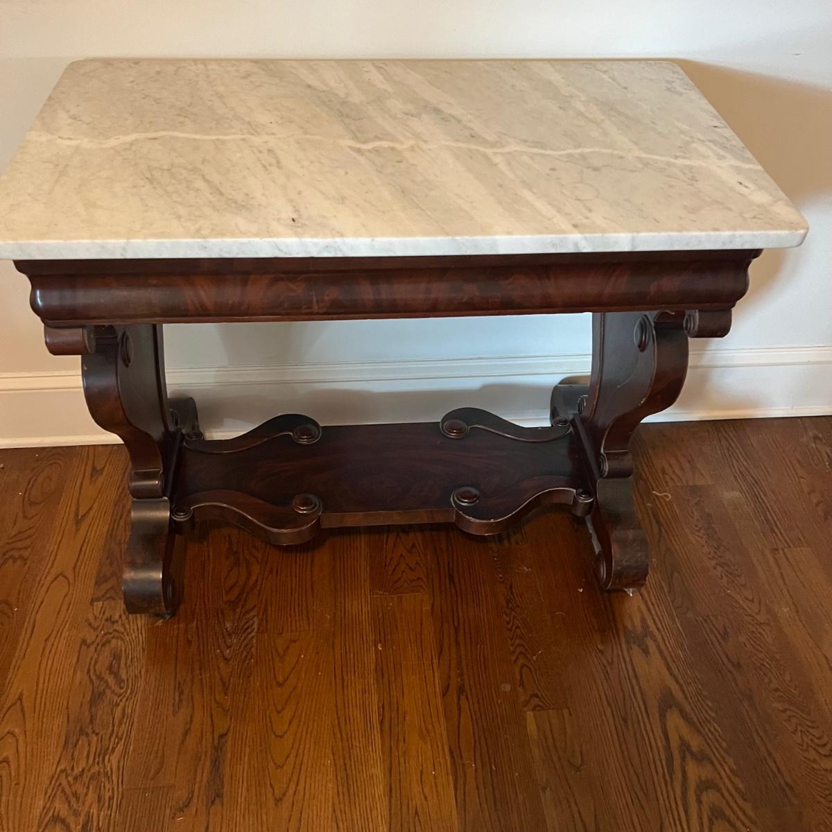 A beautiful wooden piece. that appears to be mahogany, with a white 0.75” thick marble top. The entire piece measures 36” x 20.5” x 30.5”H. note in photographs, where two of the wood casters at the bottom are missing. The piece is being held level currently with a scrap piece of wood. Also notice that one of the round accent pieces fell off, but is currently taped and could be easily glued.Local Pick Up only.