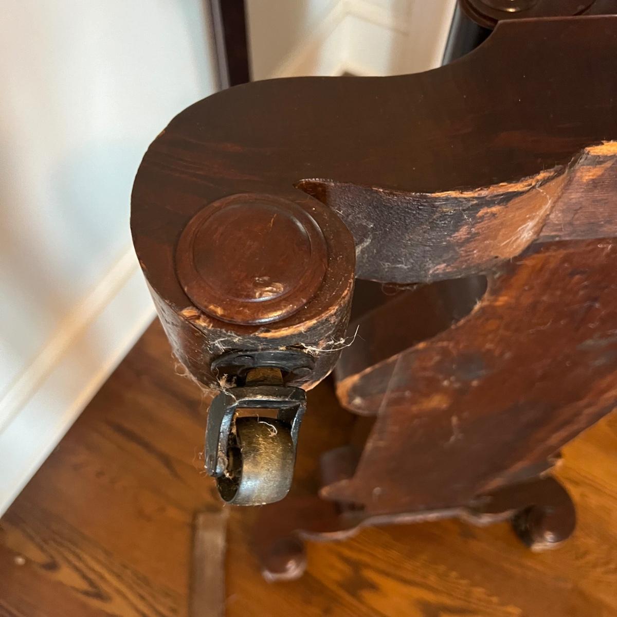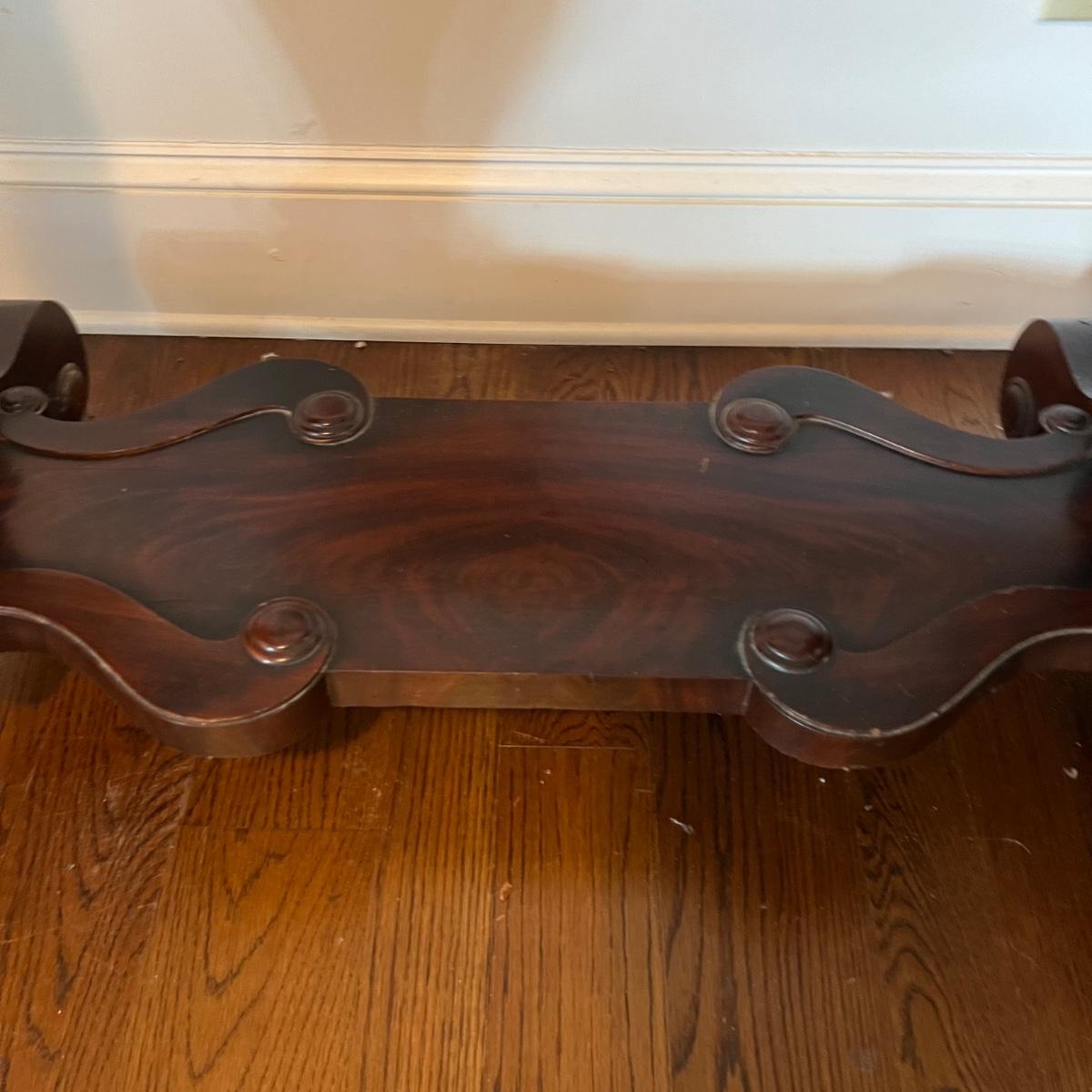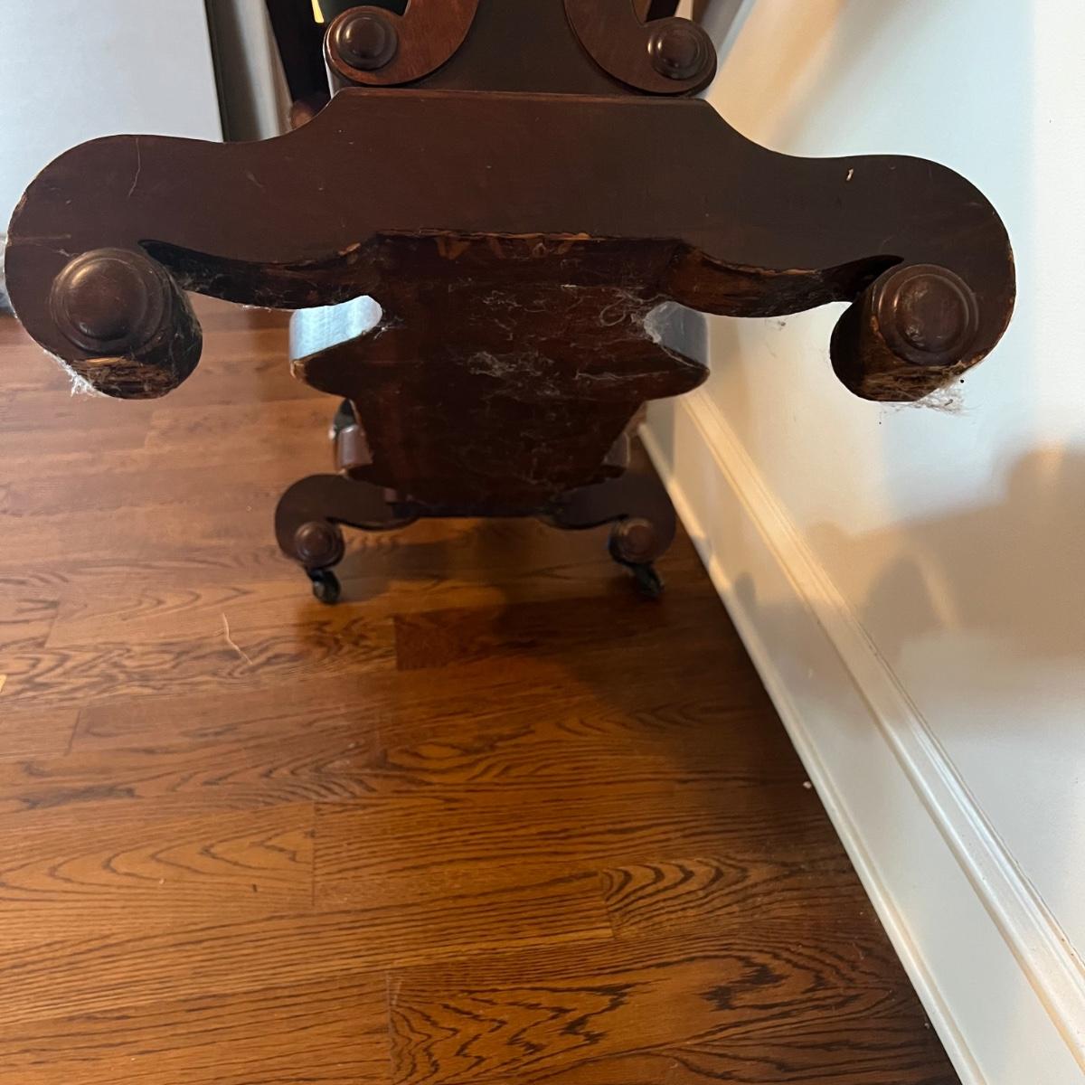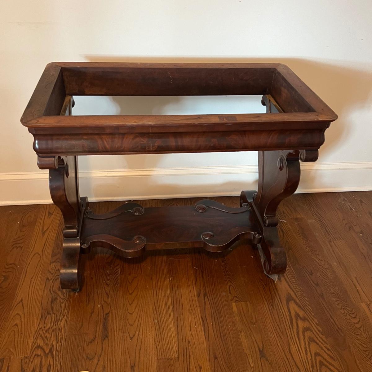 A beautiful wooden piece. that appears to be mahogany, with a white 0.75” thick marble top. The entire piece measures 36” x 20.5” x 30.5”H. note in photographs, where two of the wood casters at the bottom are missing. The piece is being held level currently with a scrap piece of wood. Also notice that one of the round accent pieces fell off, but is currently taped and could be easily glued.Local Pick Up only.